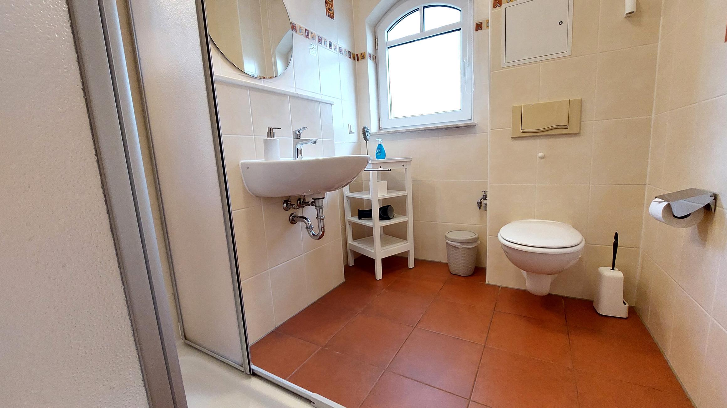 Das helle Badezimmer bietet neben WC, Waschtisch samt Kosmetikspiegle und Fön auch eine Dusche mit flachem Einstieg.