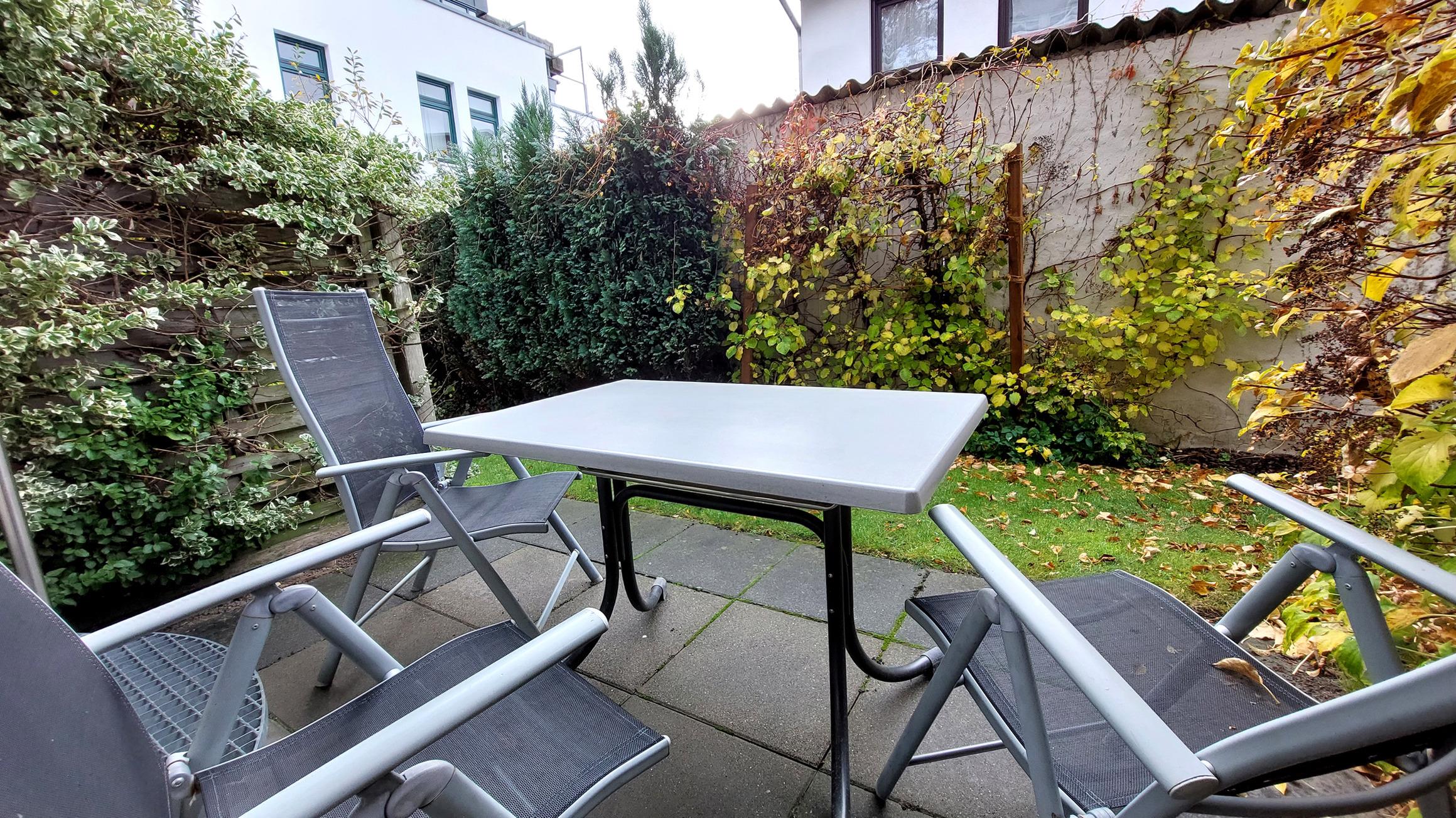 Vom Wohnbereich gelangen Sie auf die möblierte Terrasse mit Blick ins Grüne.