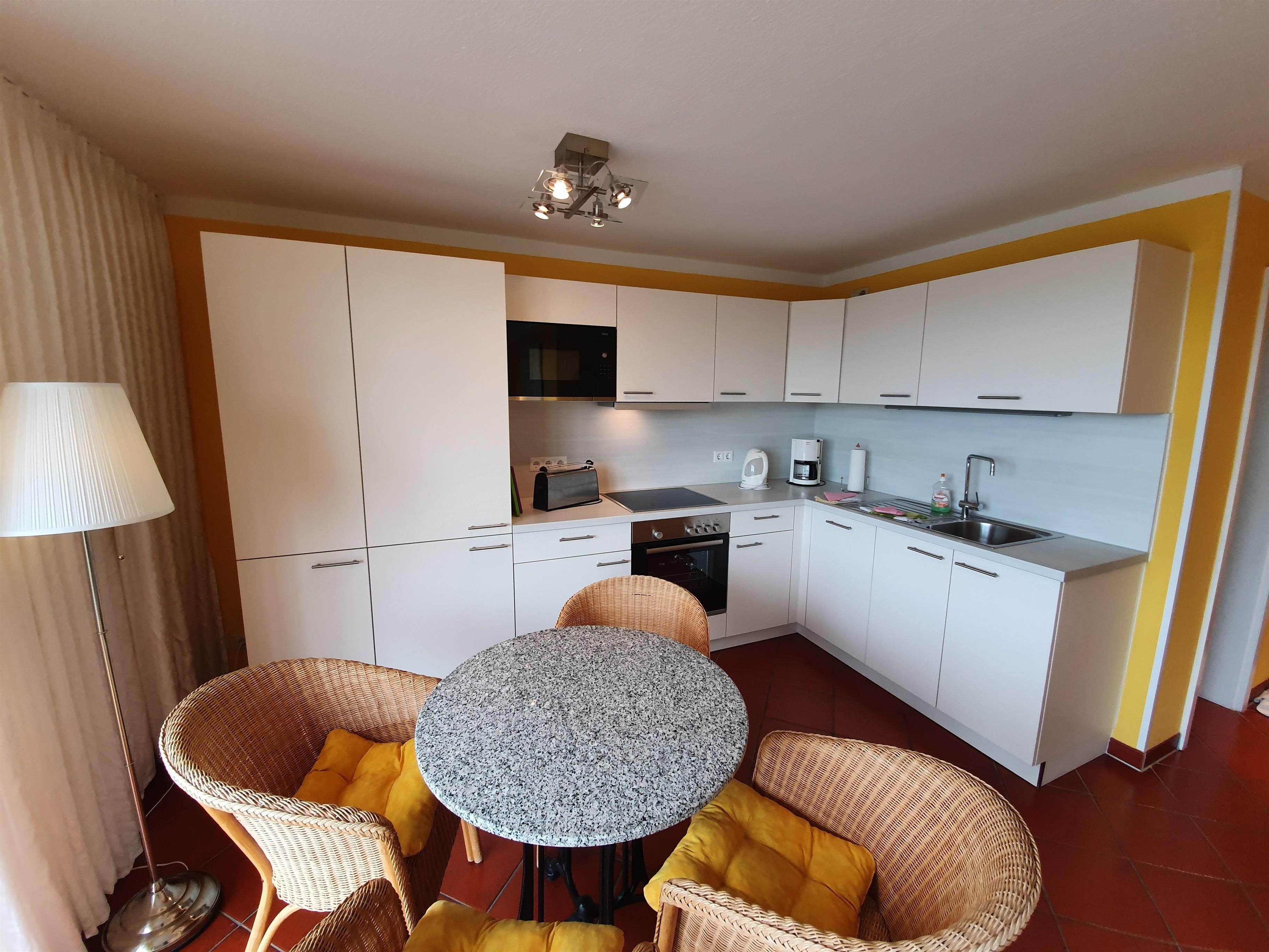 Ihre Wohnung ist aufgeteilt in einen Wohnraum mit Zugang zum Balkon, eine offene Küche, ein separates Schlafzimmer und ein Tageslichtbad mit Waschtisch, Glasdusche und WC. Das Wohnzimmer ist mit einem Essplatz und einer Sitzgruppe möbliert. Die technische Ausstattung beinhaltet ein Flachbild-TV, WLAN und Radio. Die Küche ist mit Kühlschrank, Cerankochfeld, Geschirrspüler, Gefrierschrank, Backofen, Mikrowelle, Kaffeemaschine, Wasserkocher und Toaster komplett ausgestattet. Das Schlafzimmer verfügt über ein Doppelbett und Verdunklungsmöglichkeiten.