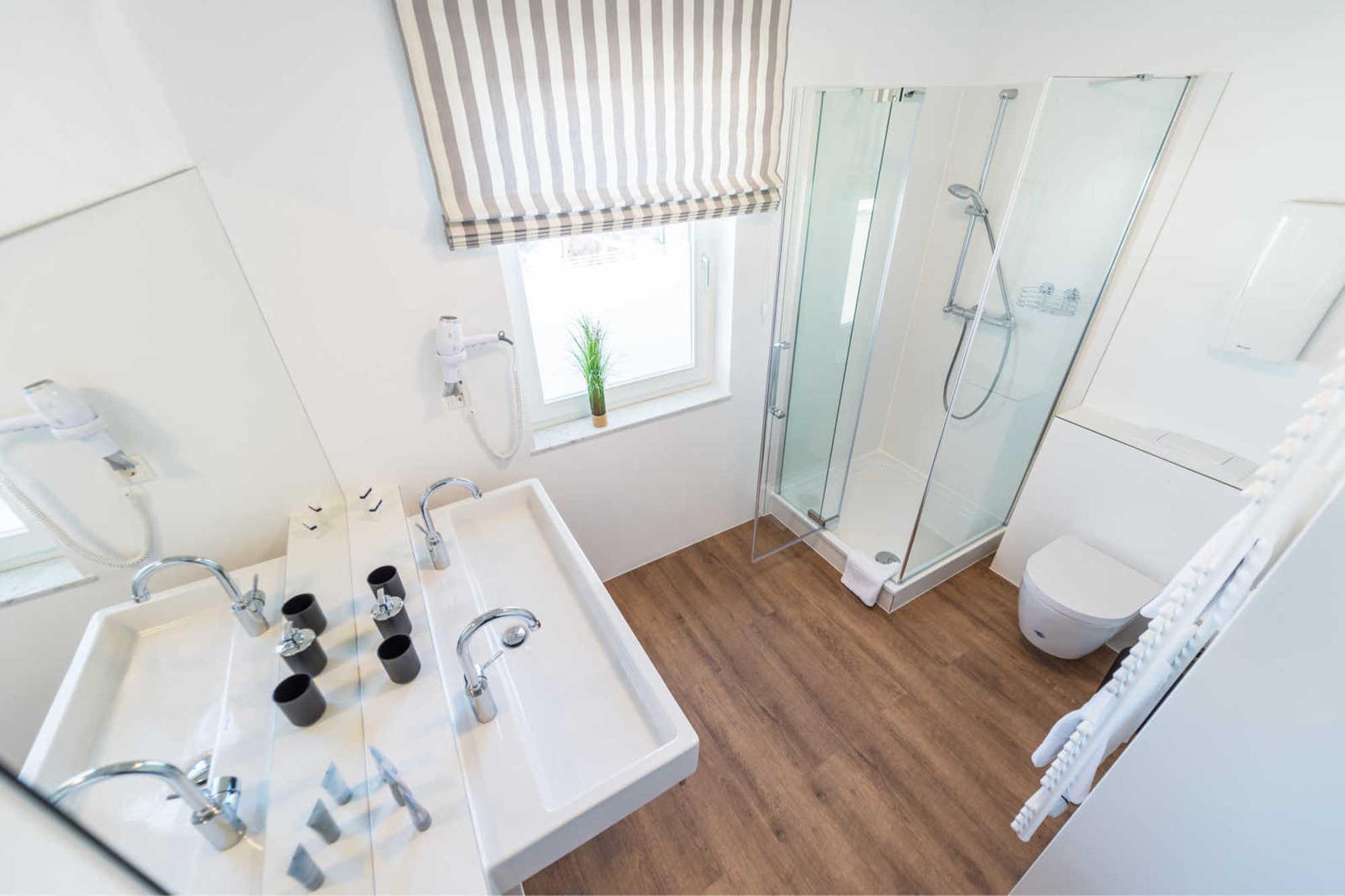 Neben dem Wohnraum mit offener Küche gibt es einen Schlafraum, sowie ein Badezimmer mit Waschtisch, Dusche und WC. Der Schlafraum ist mit einem Doppelbett, TV und einem großen Kleiderschrank ausgestattet. Außerdem finden Sie im komfortablen Wohnbereich neben der Sitzecke mit Schlafsofa für die 3. und 4. Person einen separaten Essplatz, TV mit integriertem Radio. Die moderne Küche ist mit Geschirrspülmaschine, Mikrowelle, Cerankochfeld, Kühlschrank und diversen Kleingeräten ausgestattet.