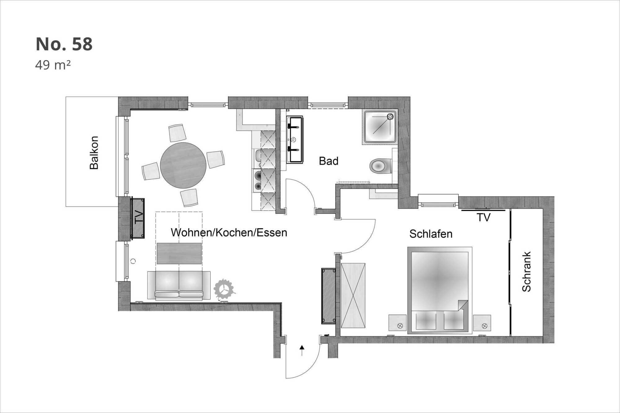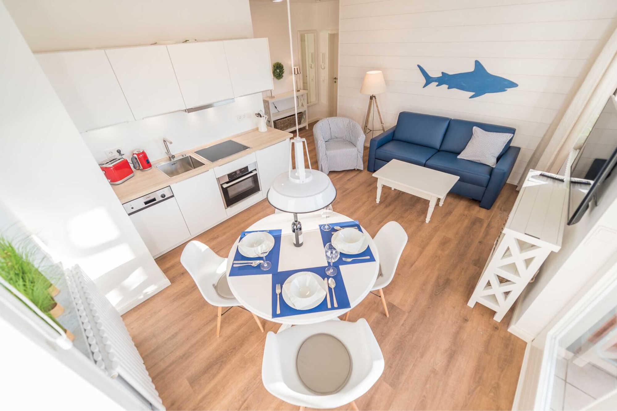 Neben dem Wohnraum mit offener Küche und Essbereich, gibt es einen separaten Schlafraum, sowie ein Badezimmer mit Waschtisch, Dusche, Handtuchheiztrockner und WC. Der Schlafraum ist mit einem Doppelbett, TV und einem großen Kleiderschrank ausgestattet. Außerdem finden Sie im komfortablen Wohnbereich neben der Sitzecke mit Schlafsofa für die 3. und 4. Person einen separaten Essplatz, Flachbild-TV mit integriertem Radio und kostenlosem Internetzugang. Die neue Küche ist mit Geschirrspülmaschine, Backofen inkl. Mikrowellenfunktion, Cerankochfeld, Kühlschrank und diversen Kleingeräten ausgestattet.