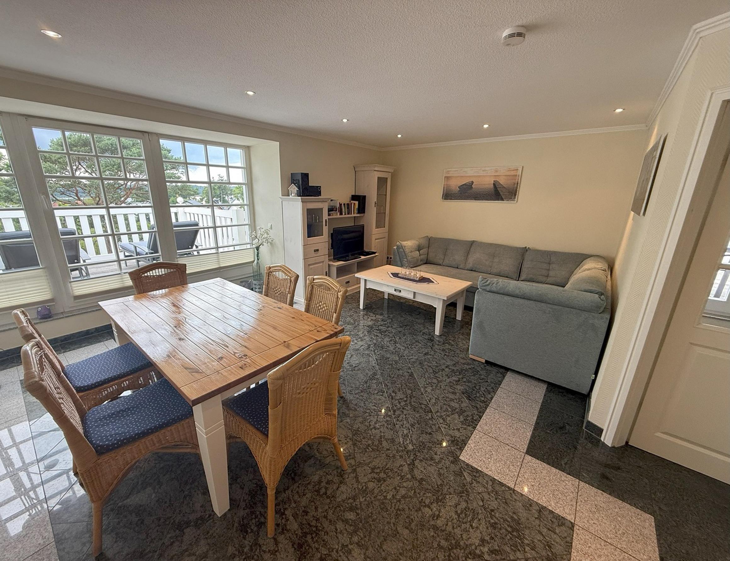 Ihre 3-Zimmer Penthousewohnung "Binzer Blick", mit umlaufender Dachterrasse, die Ihnen im Sommer zu jeder Tageszeit entspannte Sonnenstunden garantiert und Kaminofen im Wohnbereich, der auch in der kalten Jahreszeit kuschelige Stimmung aufkommen lässt, ist ca. 90 qm groß und mit bis zu 4 Personen zu nutzen. Neben dem großzügigen Wohnbereich gibt es zwei separate Schlafräume, Küche, Flur, ein Badezimmer mit Waschtisch, Badewanne (Duschwand) und WC. Ein Schlafraum ist mit einem großen Doppelbett, TV und einem Kleiderschrank ausgestattet. Der zweite Schlafraum verfügt über zwei Boxspringbetten, die sich bei Bedarf zusammenschieben lassen und einen großen Kleiderschrank. Im komfortablen Wohnraum gibt es einen separaten Esstisch, eine Sitzecke mit TV, kostenlosem Internetzugang und Musik-Anlage. Die abgeschlossene Küche ist mit Geschirrspülmaschine, Mikrowelle, Backofen, Kühlschrank und diversen Kleingeräten komplett ausgestattet. Ein wohnungseigener Parkplatz steht für Sie in der Tiefgarage (Doppelparker - 1,50m hoch) zur Verfügung.