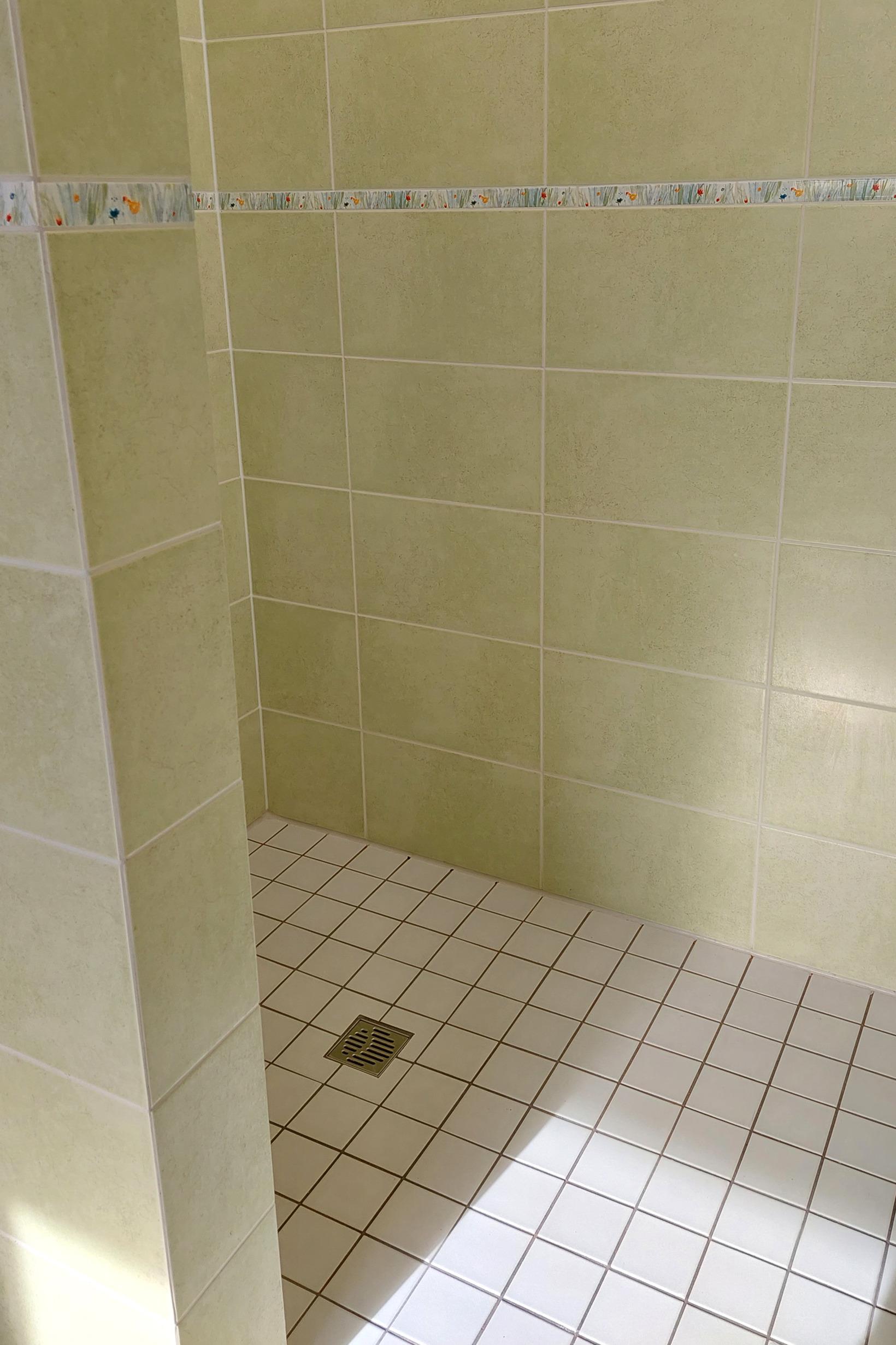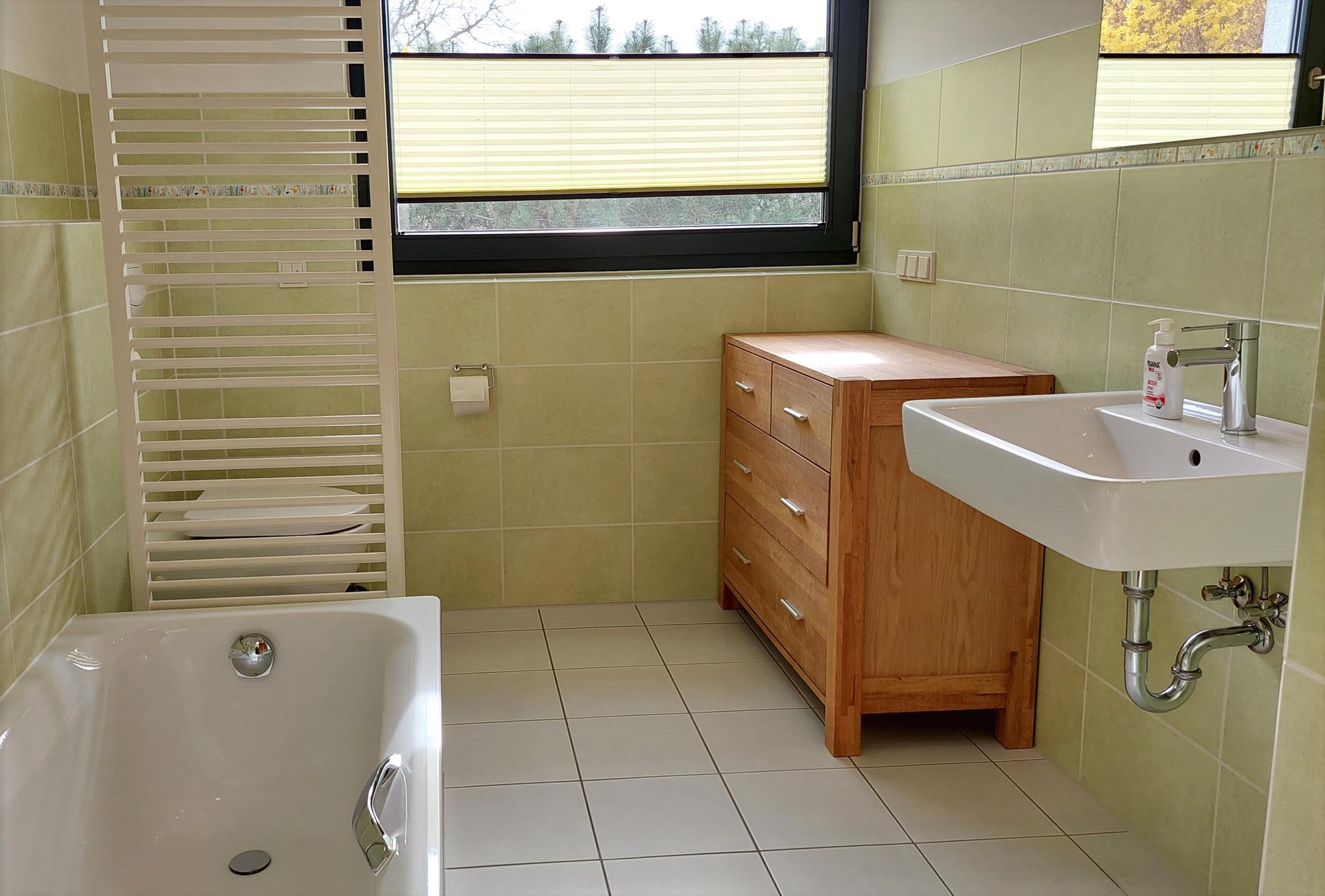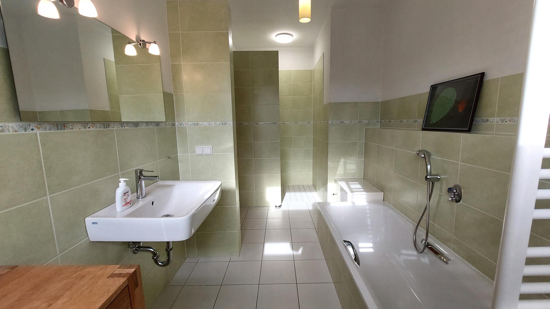 Das Tageslichtbad verfügt sowohl über eine Badewanne als auch eine große ebenerdige Dusche.