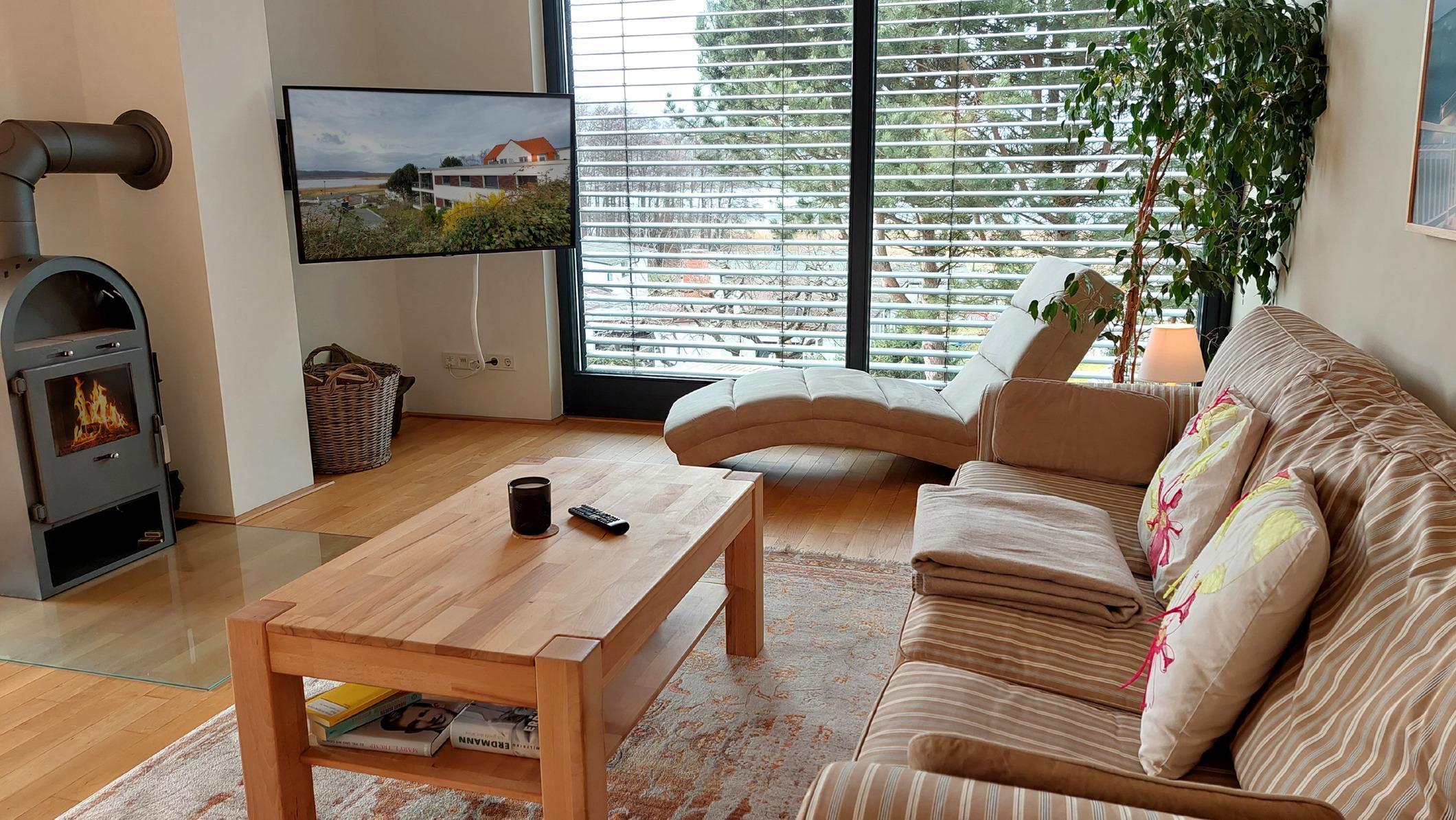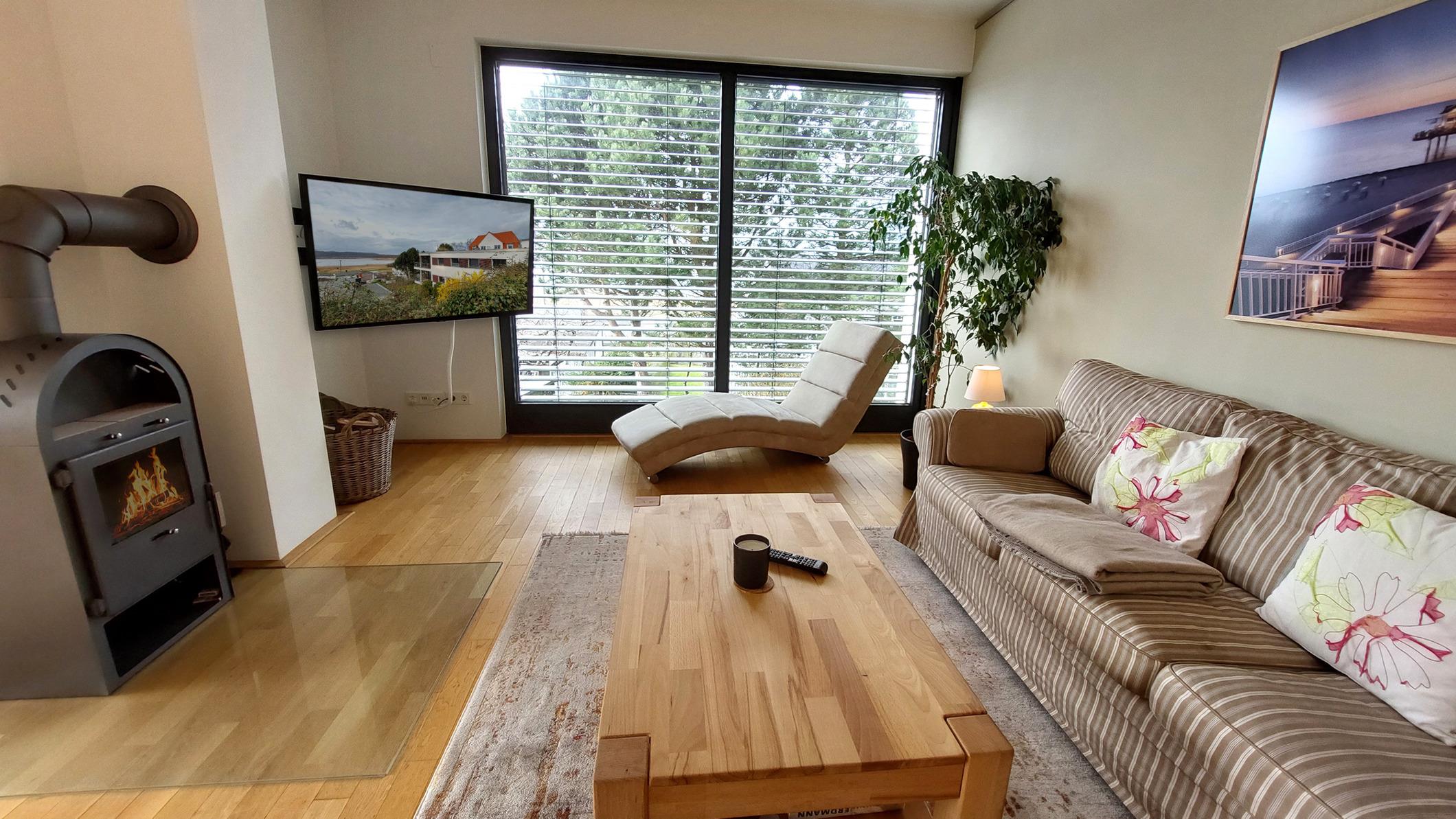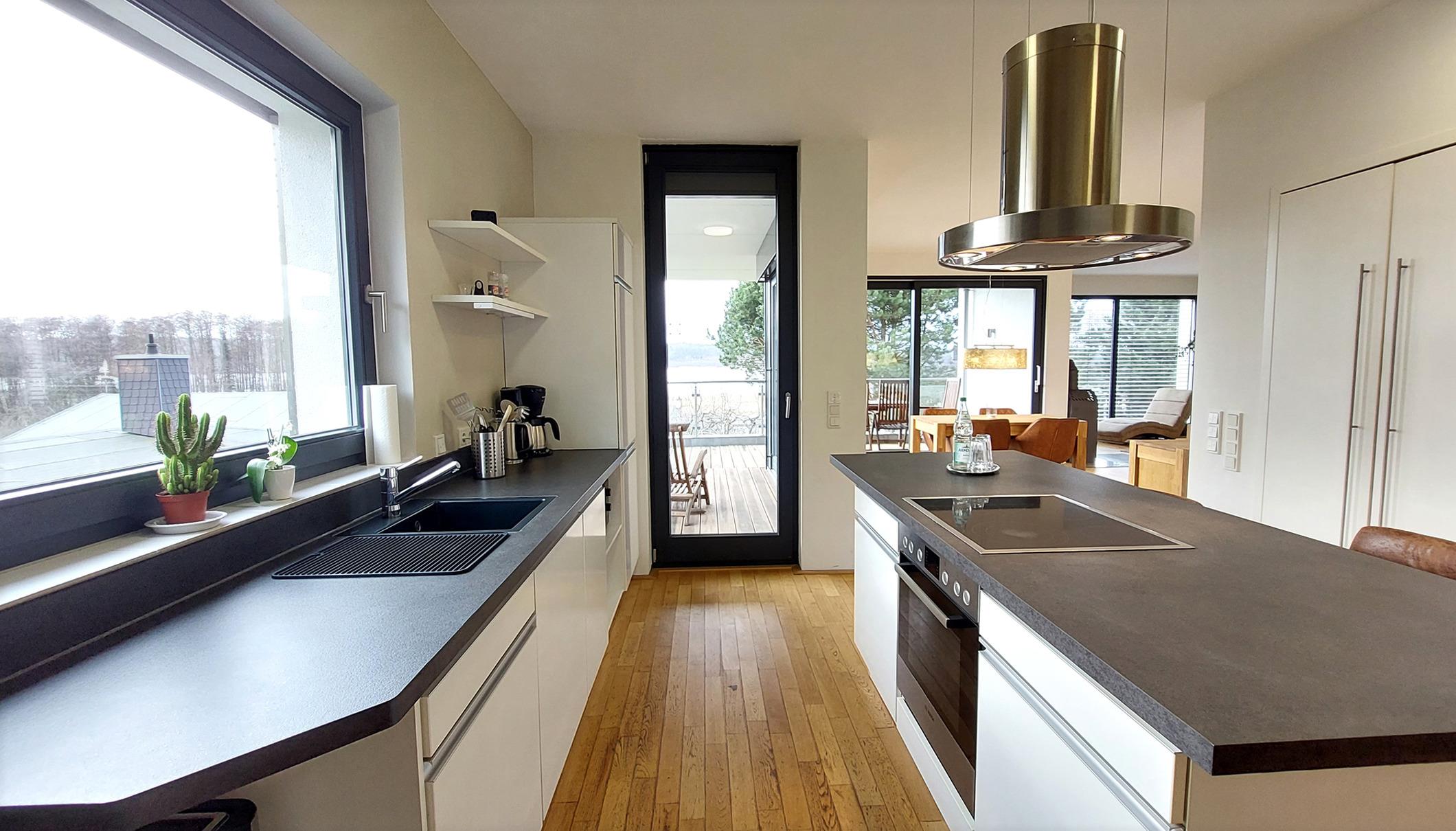 Highlights sind die große offene Wohnküche sowie der angrenzende Wohnbereich mit Kamin, Smart-TV und Zugang zum Süd-Westbalkon.