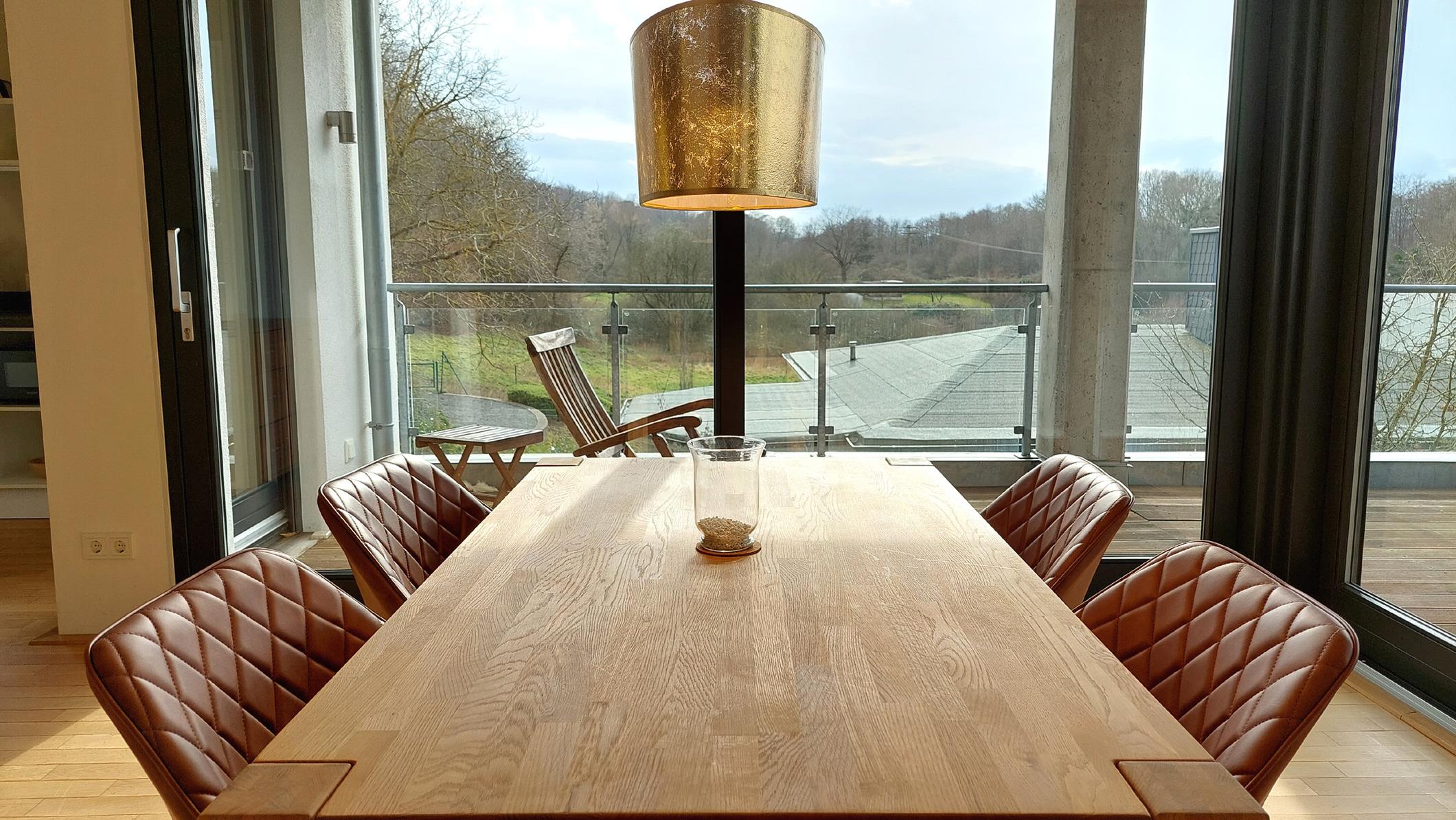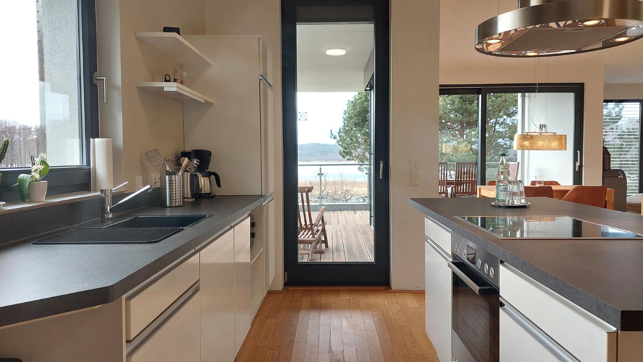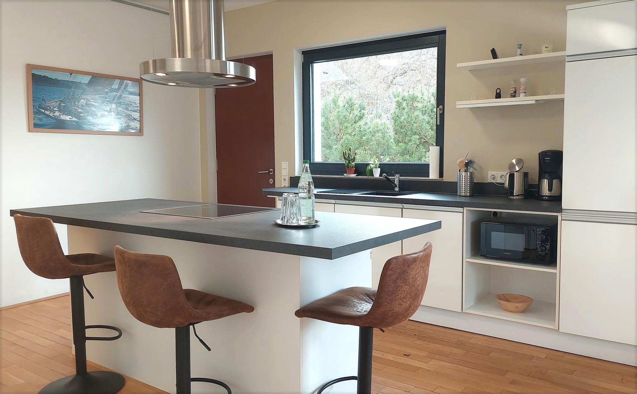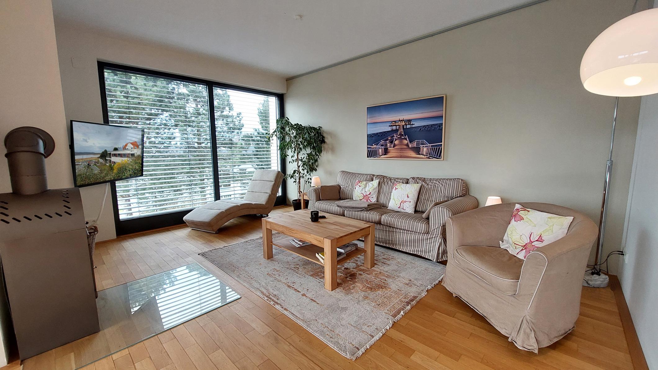 Highlights sind die große offene Wohnküche sowie der angrenzende Wohnbereich mit Kamin, Smart-TV und Zugang zum Süd-Westbalkon.