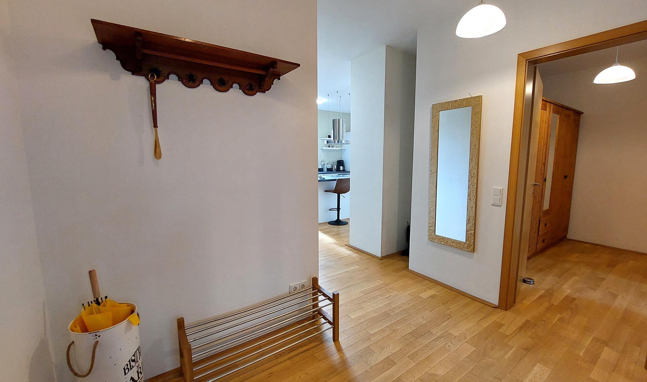 Der helle Flurbereich bietet eine Garderobe und viel Stauraum in einem großen Abstellraum. Dort befindet sich auch der wohnungseigene Safe.
