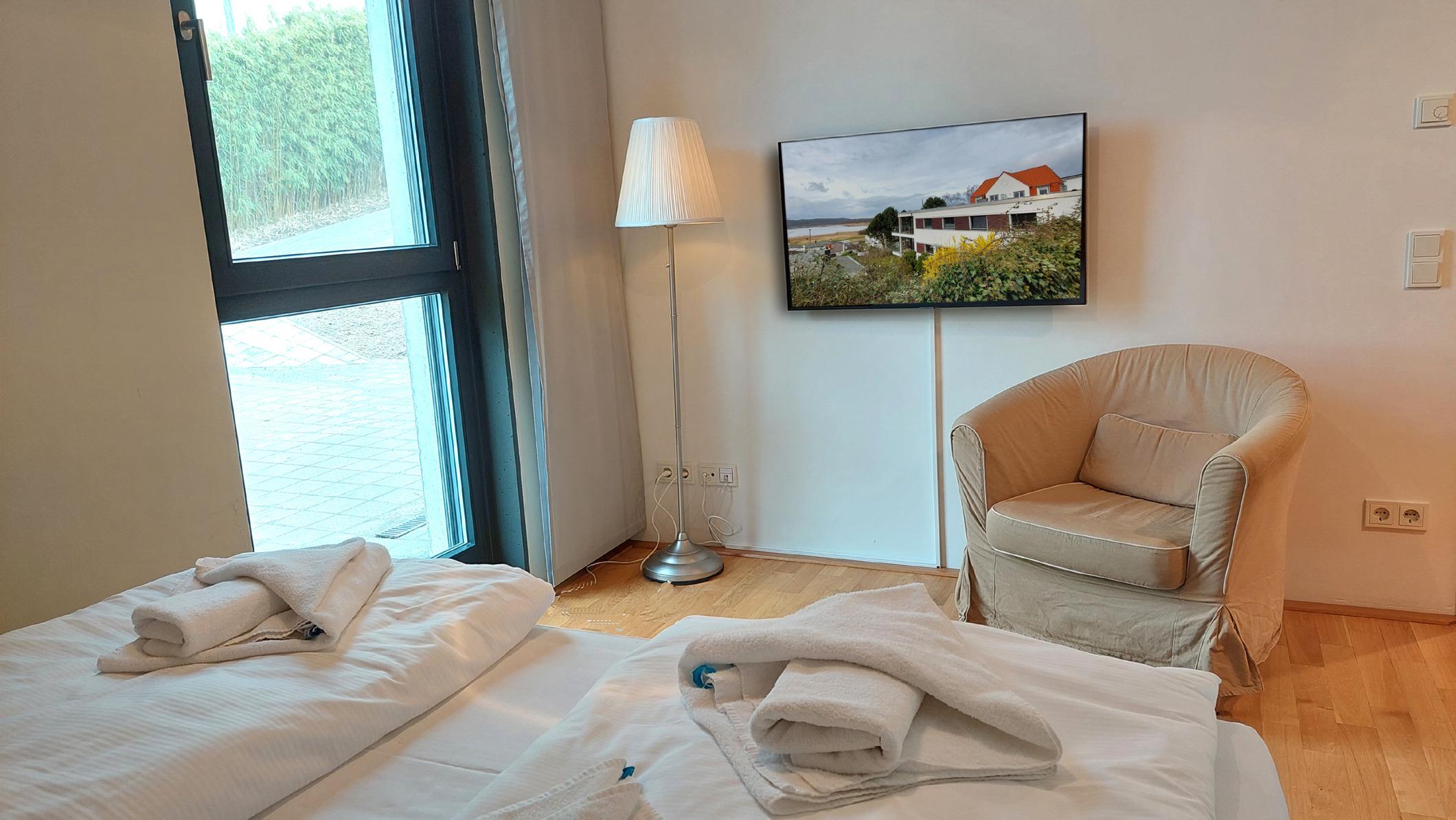 Es gibt zwei vollwertige Schlafzimmer mit Doppelbett und Kleiderschrank. Im Hauptschlafzimmer befindet sich ein TV.