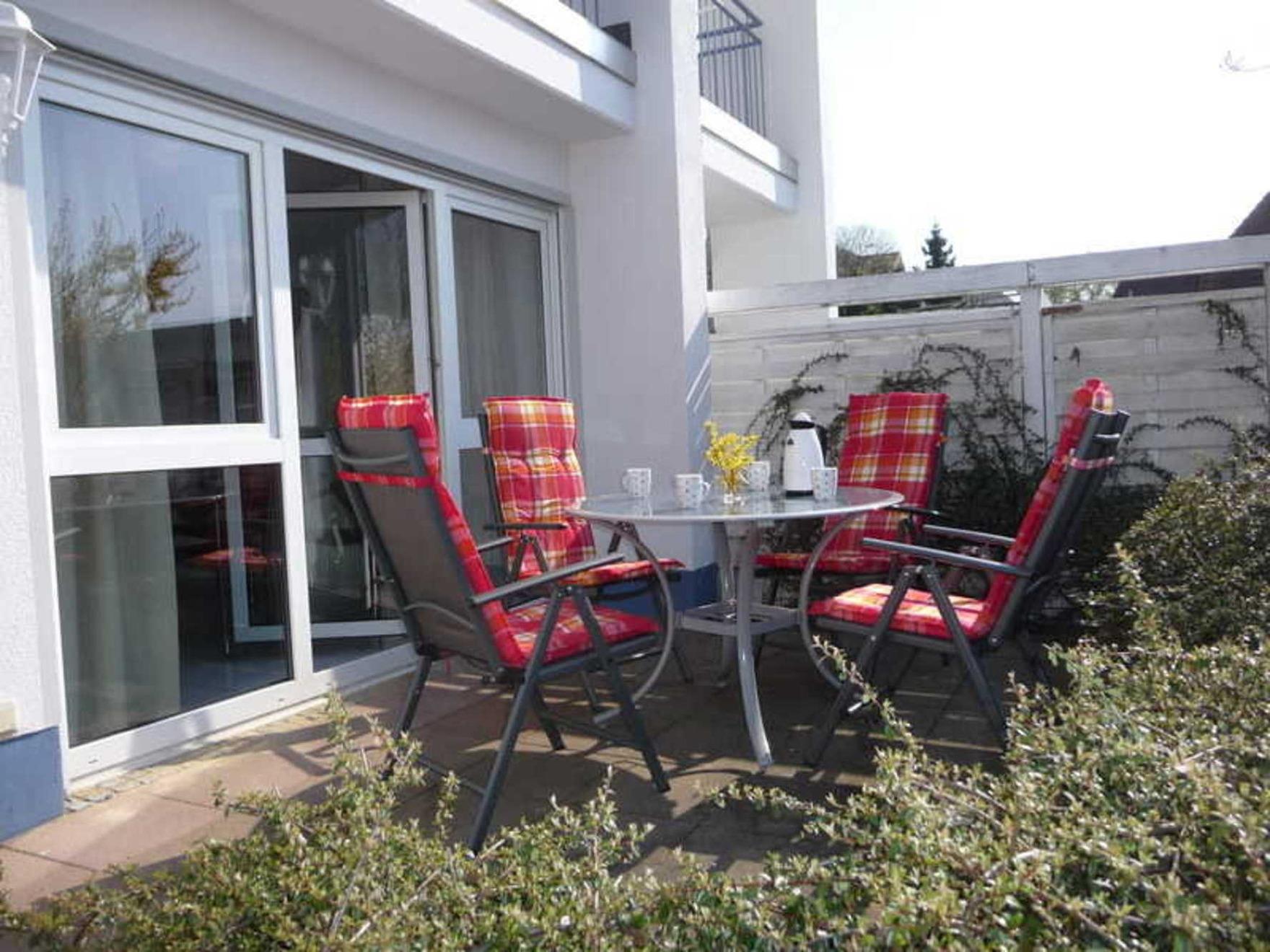 Ihre Nichtraucher-Terrassenwohnung 39RB5 hat eine Größe von ca. 60 qm und ist mit bis zu 4 Personen belegbar. Neben dem Wohnraum gibt es zwei separate Schlafräume, eine Küche sowie ein Badezimmer mit Waschtisch, Dusche/WC und festinstallierten Fön. Die beiden Schlafräume verfügen jeweils über ein Doppelbett und einen Kleiderschrank. Im komfortablen Wohnraum gibt es einen separaten Essplatz und eine gemütliche Sitzecke mit Kabel-TV, kostenfreiem WLAN-Zugang und Musik-Anlage. Die moderne Küche ist mit einem Backofen, Geschirrspüler, Kühlschrank, Ceran-Kochfeld, Mikrowelle und diversen Kleingeräten ausgestattet. Eine geschützte in Richtung Westen gelegene Terrasse schließt sich dem Wohnbereich an. Als kleines Highlight steht Ihnen ein gemeinschaftlicher Spiel- und Grillplatz im Garten zur Verfügung. Ihren Pkw können Sie kostenfrei auf dem hauseigenen Grundstück parken. Im Keller des Hauses befinden sich Münzwaschmaschine und Trockner.