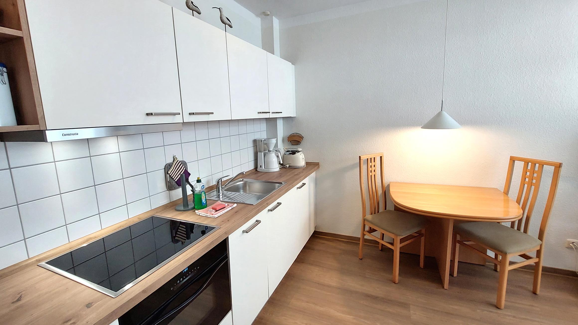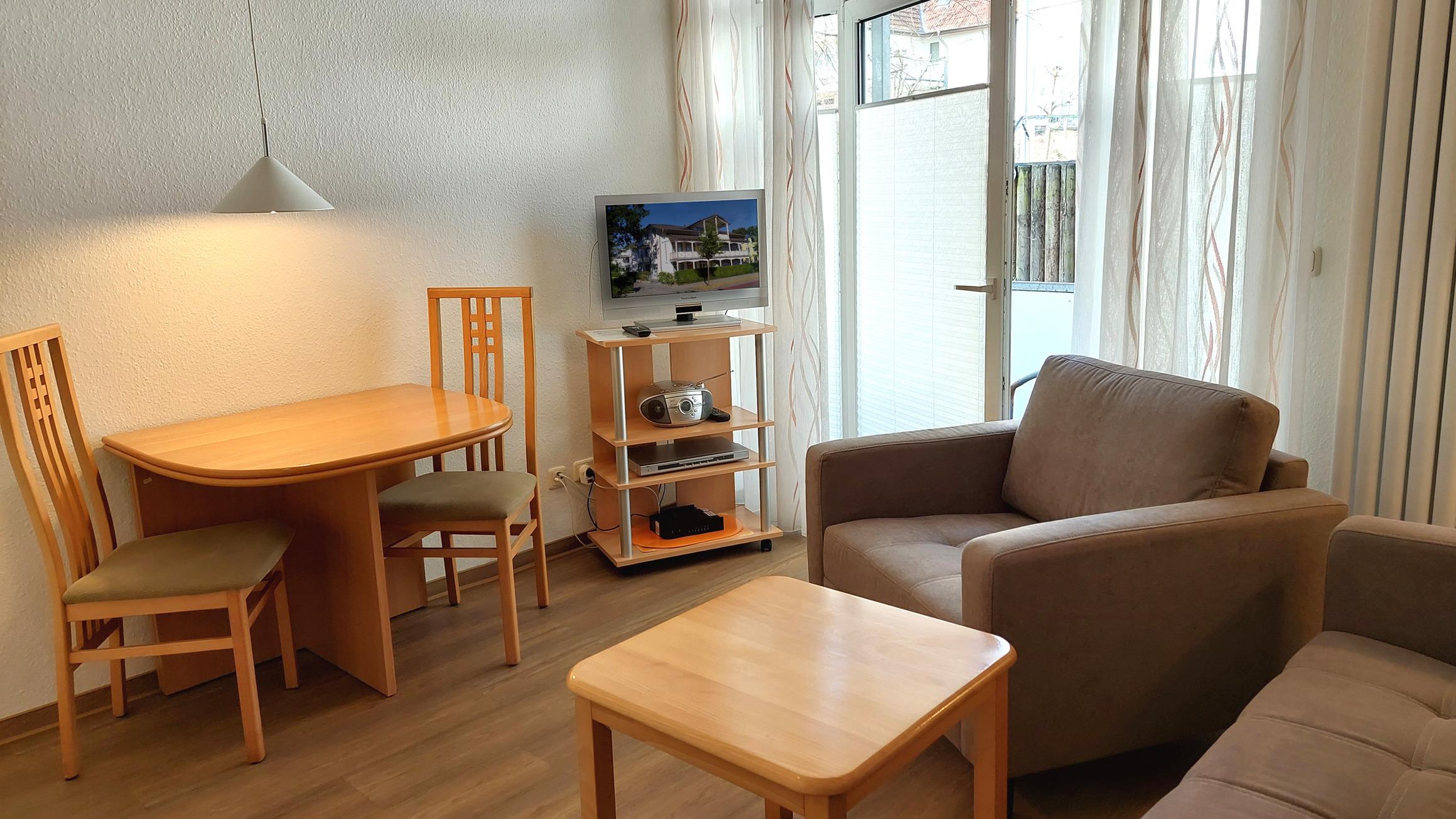 Ihre Nichtraucher-Ferienwohnung 90346 befindet sich im Erdgeschoss des Hauses Residenz Dünenstraße. Die 2 Zimmer - Wohnung hat eine Größe von ca. 38 qm und ist mit bis zu 2 Personen belegbar. [nbsp]Neben dem Wohn- und Essbereich mit Sitzecke gibt es ein separates Schlafzimmer, eine Küchenzeile sowie ein Badezimmer mit Waschtisch, Dusche/WC, Kosmetikspiegel und Fön. Das Schlafzimmer verfügt über ein Doppelbett, einen Kleiderschrank, ein Flachbildfernseher sowie Radiowecker. Im Wohnraum gibt es eine gemütliche Sitzecke mit Kabel-TV, WLAN und Musik-Anlage sowie einen gesonderten Essplatz Die Küchenzeile ist mit einem Backofen, Kühlschrank, Kochfeld, Mikrowelle, Kaffeemaschine, Wasserkocher, Toaster und diversen Kleingeräten ausgestattet. Ein geschützter in Richtung Nordwest ebenerdiger Balkon schließt sich dem Wohnbereich an. Ein wohnungseigener Außenstellplatz (Nr. 6) steht Ihnen an der Residenz zur Verfügung. Ihr Haustier ist in dieser Wohnung herzlich willkommen.