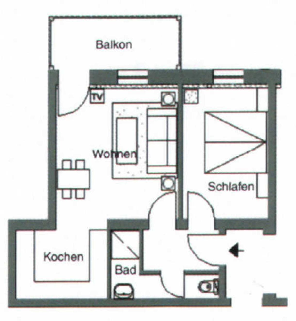 Ihre gemütlich eingerichtete Ferienwohnung verfügt über einen Balkon. Die 2-Raum Wohnung hat eine Größe von ca. 50 qm und ist mit bis zu 4 Personen belegbar. Neben dem schön eingerichteten Wohnraum mit integrierter Küche gibt es einen separaten Schlafraum und ein Badezimmer mit Waschtisch, Dusche und WC. Im Schlafzimmer befindet sich ein Doppelbett und ein Kleiderschrank. Im Wohnraum können auf dem Schlafsofa zwei Personen schlafen. Sie finden dort auch TV und Telefon. Die Küche ist mit Geschirrspülmaschine, Ceranfeld, Backofen, Mikrowelle, Kühlschrank und diversen Kleingeräten komplett ausgestattet. Ein PKW-Stellplatz steht Ihnen direkt am Haus zur Verfügung.