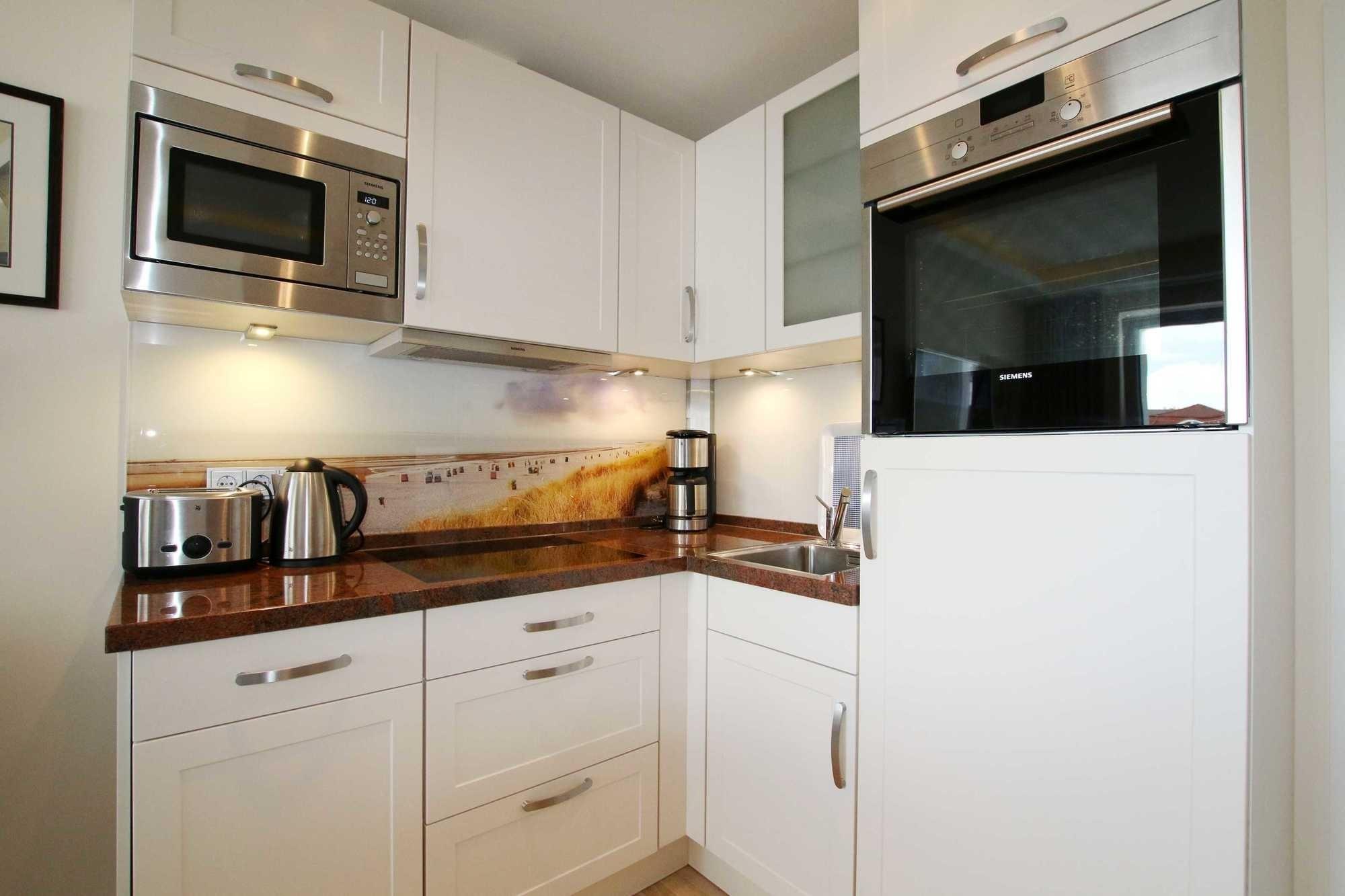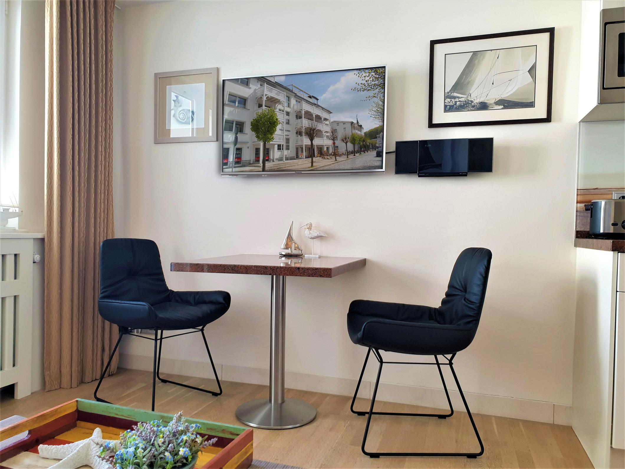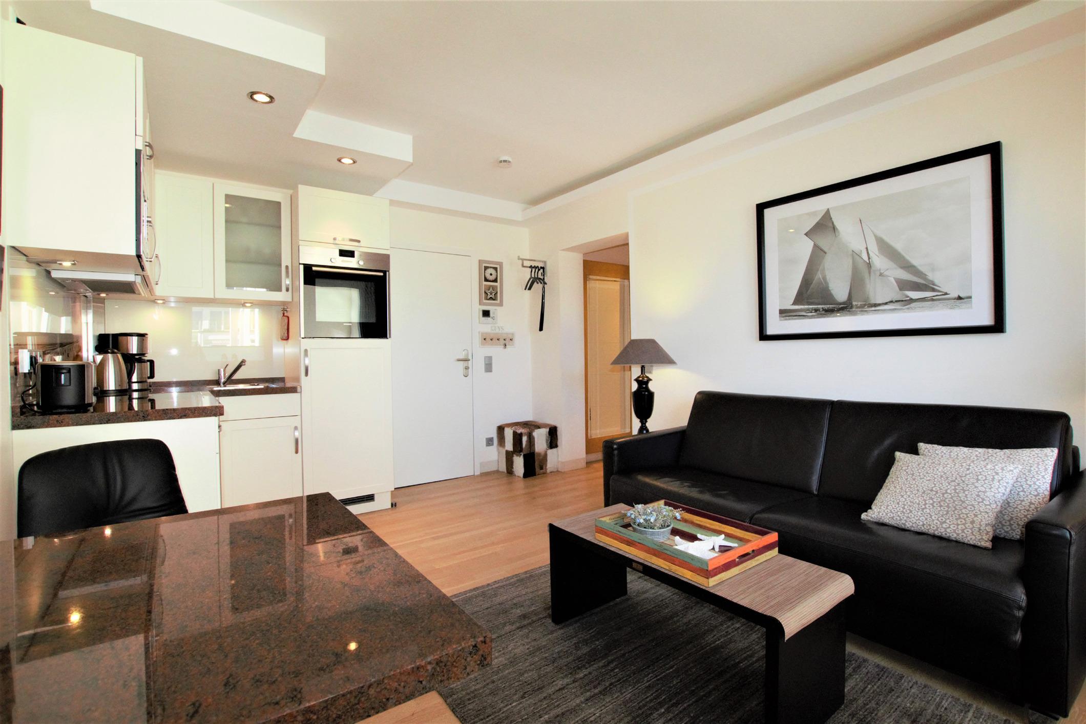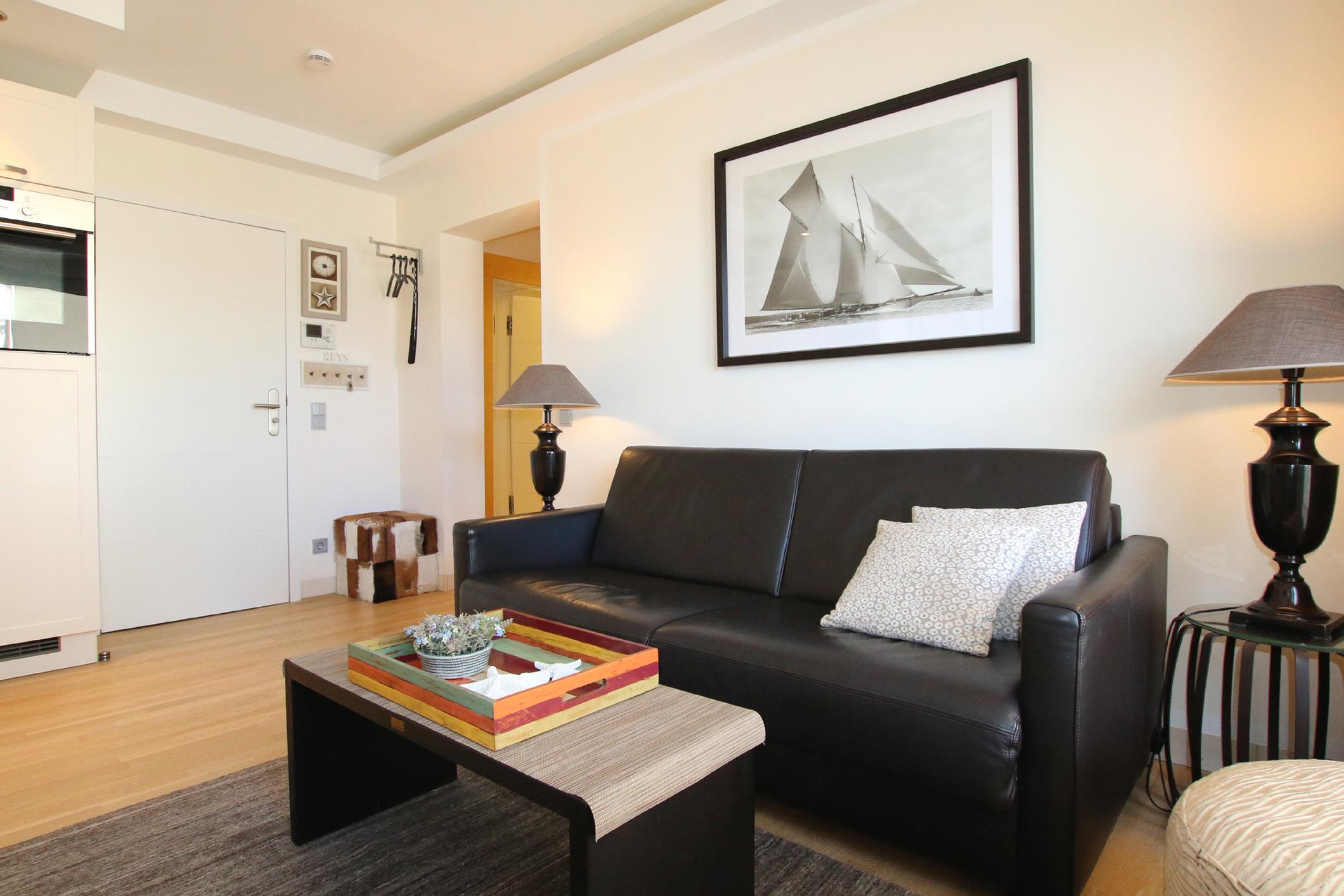 Im Wohnraum erwartet Sie eine offene Küche mit Granitarbeitsplatte, Granitesstisch, Einbaugeräten (Mikrowelle, Geschirrspüler, Backofen, Cerankochfeld, Kühlschrank mit Gefrierfach) und Kleingeräten (Kaffeemaschine, Wasserkocher, Toaster), ein 42 Zoll LED-Flachbildfernseher, Stereoanlage (Radio/CD/Airplay Funktion und iPhone Docking Station), Video-Gegensprechanlage, kostenfreier unbegrenzter Internetzugang über WLAN und LAN sowie ein Ledersofa. Der Schlafraum verfügt über ein komfortables Markenboxspringbett mit hochwertigen Matratzen, einem identischen 42 Zoll Flachbildfernseher, Kleiderschrank etc. In beiden Zimmern ist Eichenparkett ausgelegt und alle Fenster sind mit Plissees versehen. Der 8 m² große und mit verstellbaren Teakholzmöbel ausgestattete Balkon ist von beiden Zimmern begehbar. Er ist komplett überdacht und windgeschützt platziert. Das moderne Natursteinbad verfügt über eine große ebenerdige Dusche, Fußbodenheizung, fest installierten Fön, Handtuchtrockner und Kosmetikspiegel. Für Kleinkinder ist diese Wohnung nicht geeignet.
