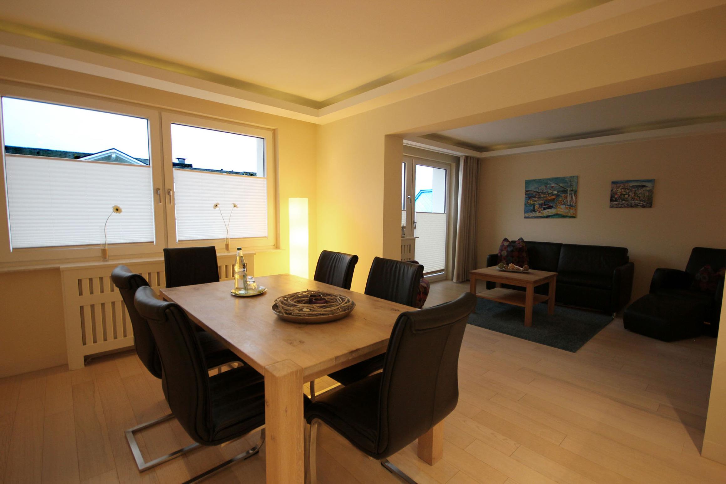 Im großzügigen Wohnbereich erwartet Sie eine bequeme Ledersitzgruppe zum gemeinsamen Verweilen, ein Flachbild-TV, Blue-ray/DVD-Player sowie ein kostenfreier WLAN-Zugang. Die offen gestaltete Winkelküche mit Marken-Einbaugeräten, u.a. mit Geschirrspüler, Backofen, Cerankochfeld, Kühlschrank sowie Kaffeemaschine, Nespressomaschine, Wasserkocher, Toaster bietet Ihnen zudem einen großen Esstisch mit Freischwinger-Stühlen.