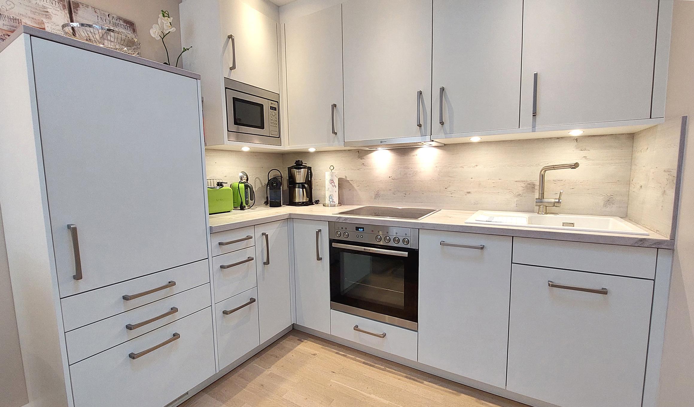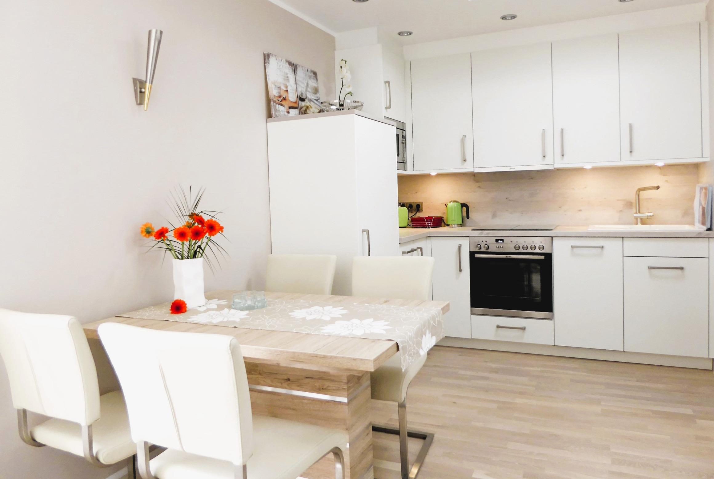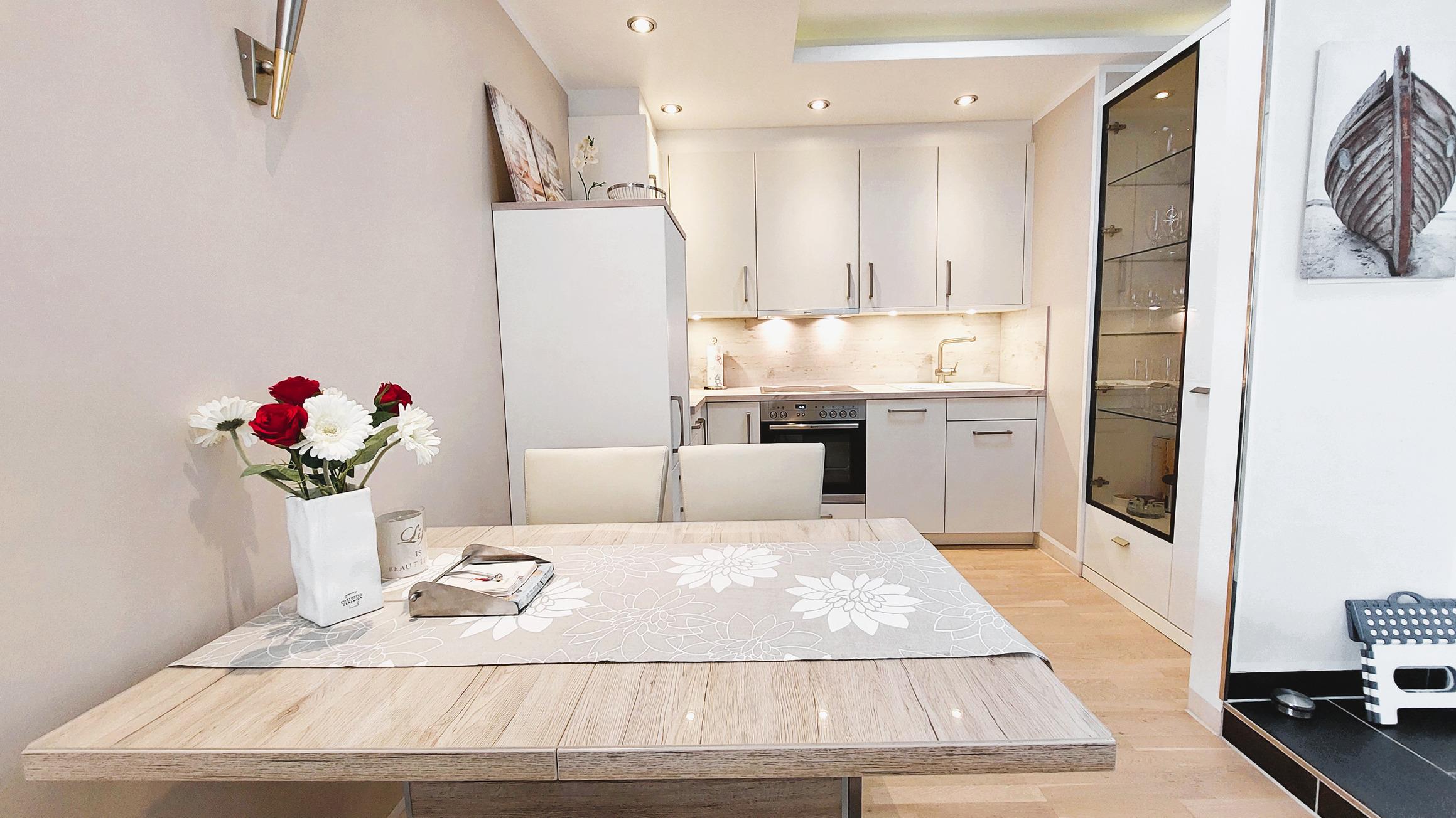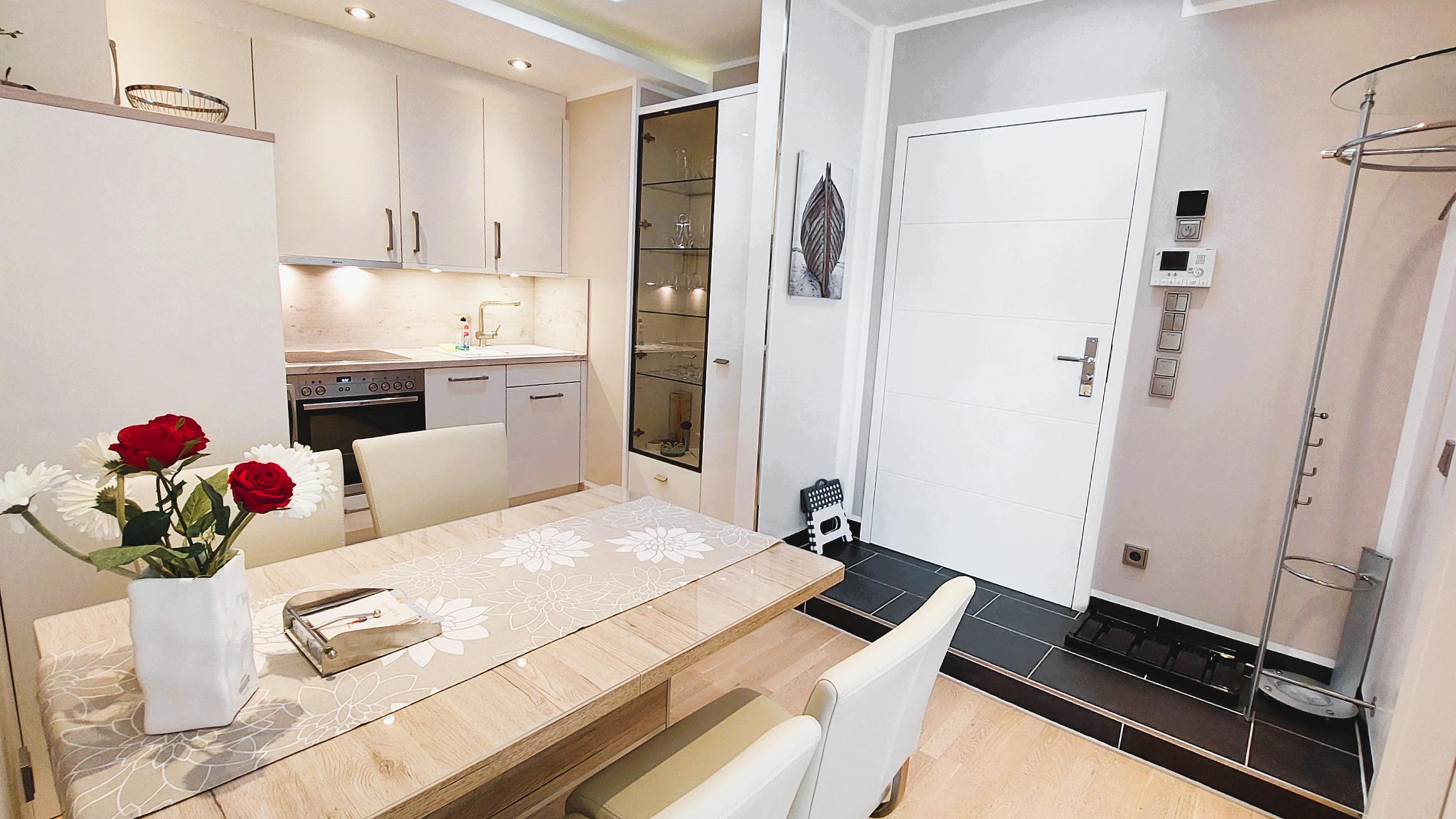 Vom Eingangsbereich, samt weiterer Garderobe und Monitorsprechanlange, gelangen Sie dann in den Essbereich und die vollausgestattete Einbauküche. Diese verfügt über Backofen, Cerankochfeld, Kühlschrank (mit Gefrierfach), Geschirrspüler, Mikrowelle und viele weitere nützliche Küchenhelfer.