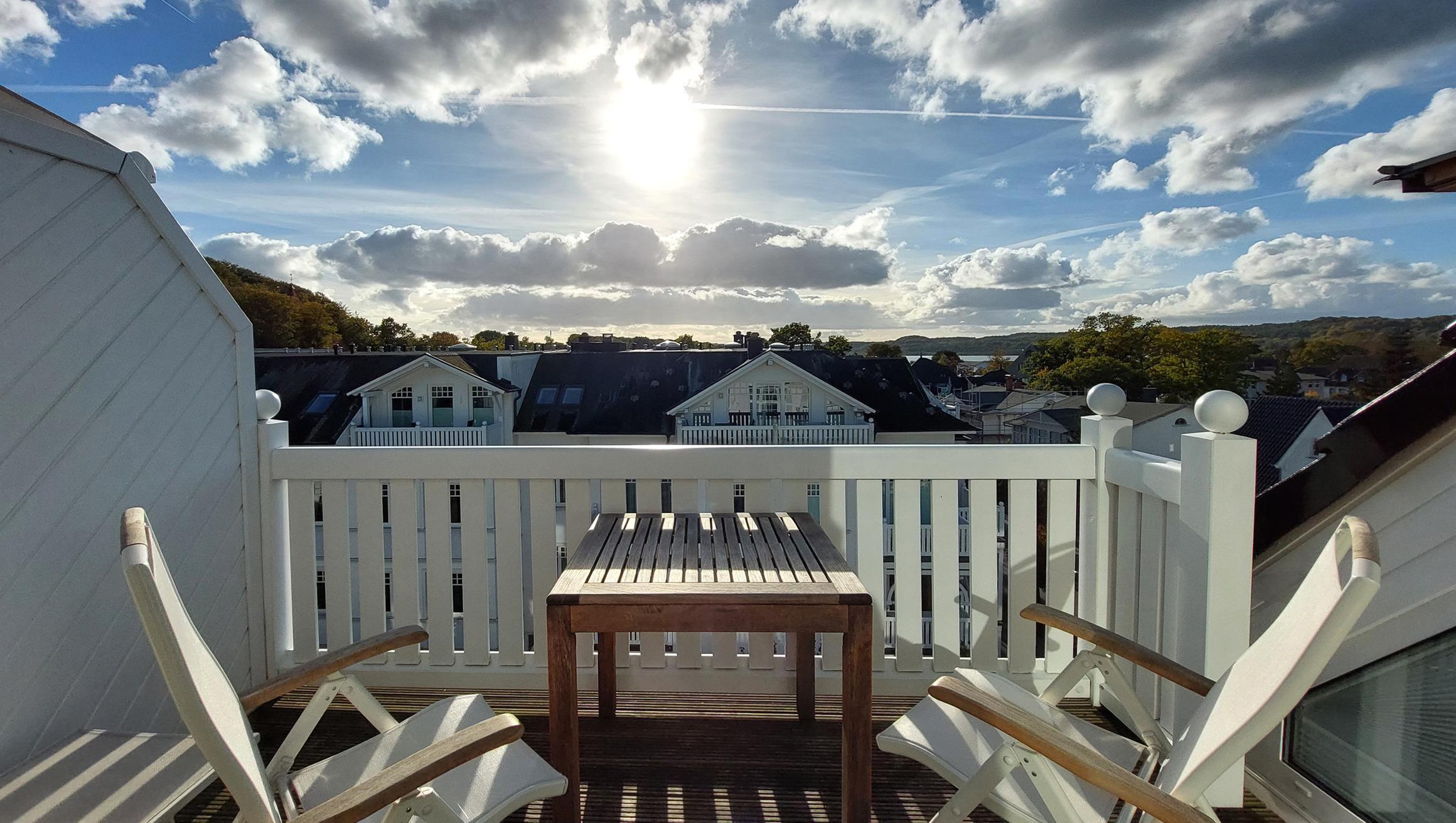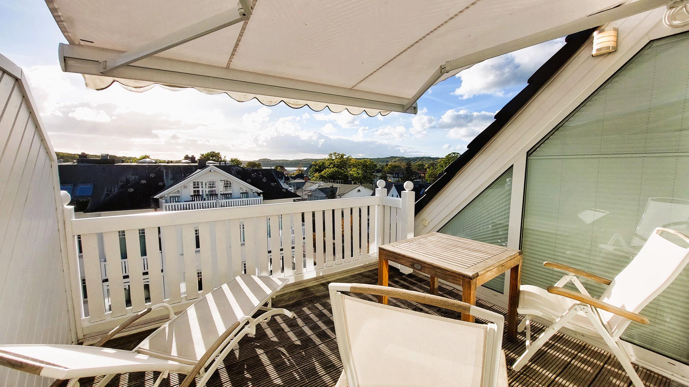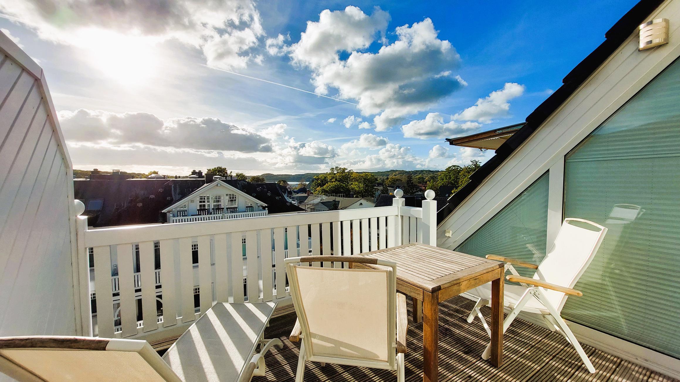 Das moderne Fenstersystem liefert diverse Möglichkeiten zum Öffnen und Verdunkeln sowie einen wunderschönen Blick über die Dächer von Binz bis hin zum Schmachter See.