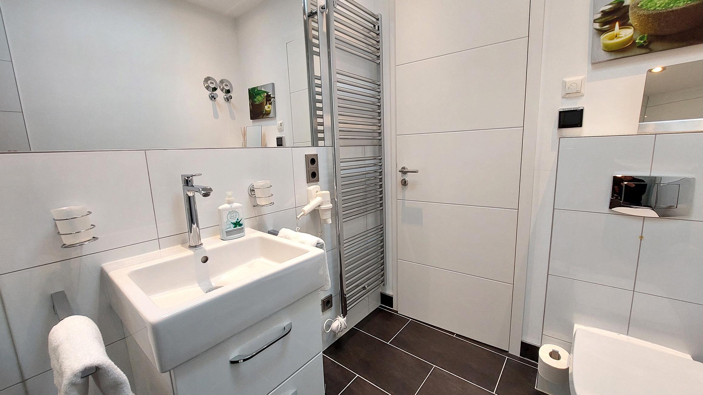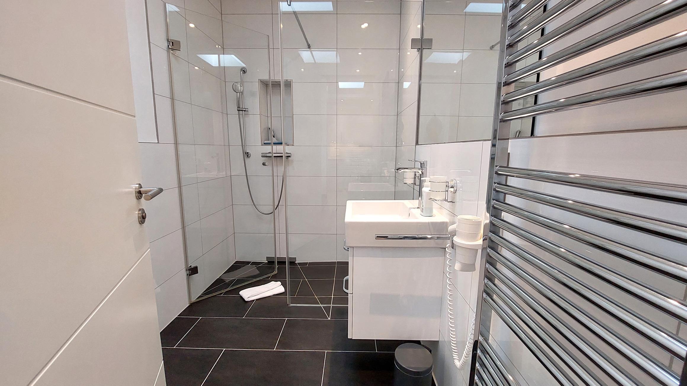Das Tageslichtbad bietet eine große, ebenerdige Dusche, WC, Waschtisch, Fön und Handtuchheizung.