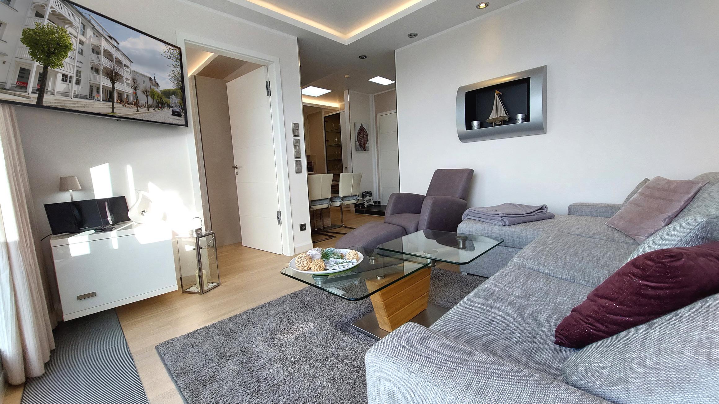 Die gemütliche Sitzlandschaft samt Fernsehsessel lädt zum Relaxen ein. Zur technischen Ausstattung gehört ein Smart-TV samt Blu-ray-Player sowie eine kleine Musikanlange. Zudem steht ein schnelles WLAN-Netz kostenfrei zur Verfügung, sodass auch bei schlechtem Wetter keine Langeweile droht.