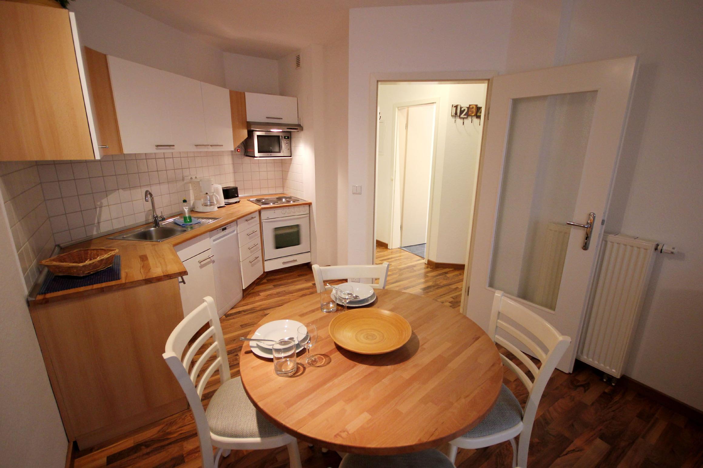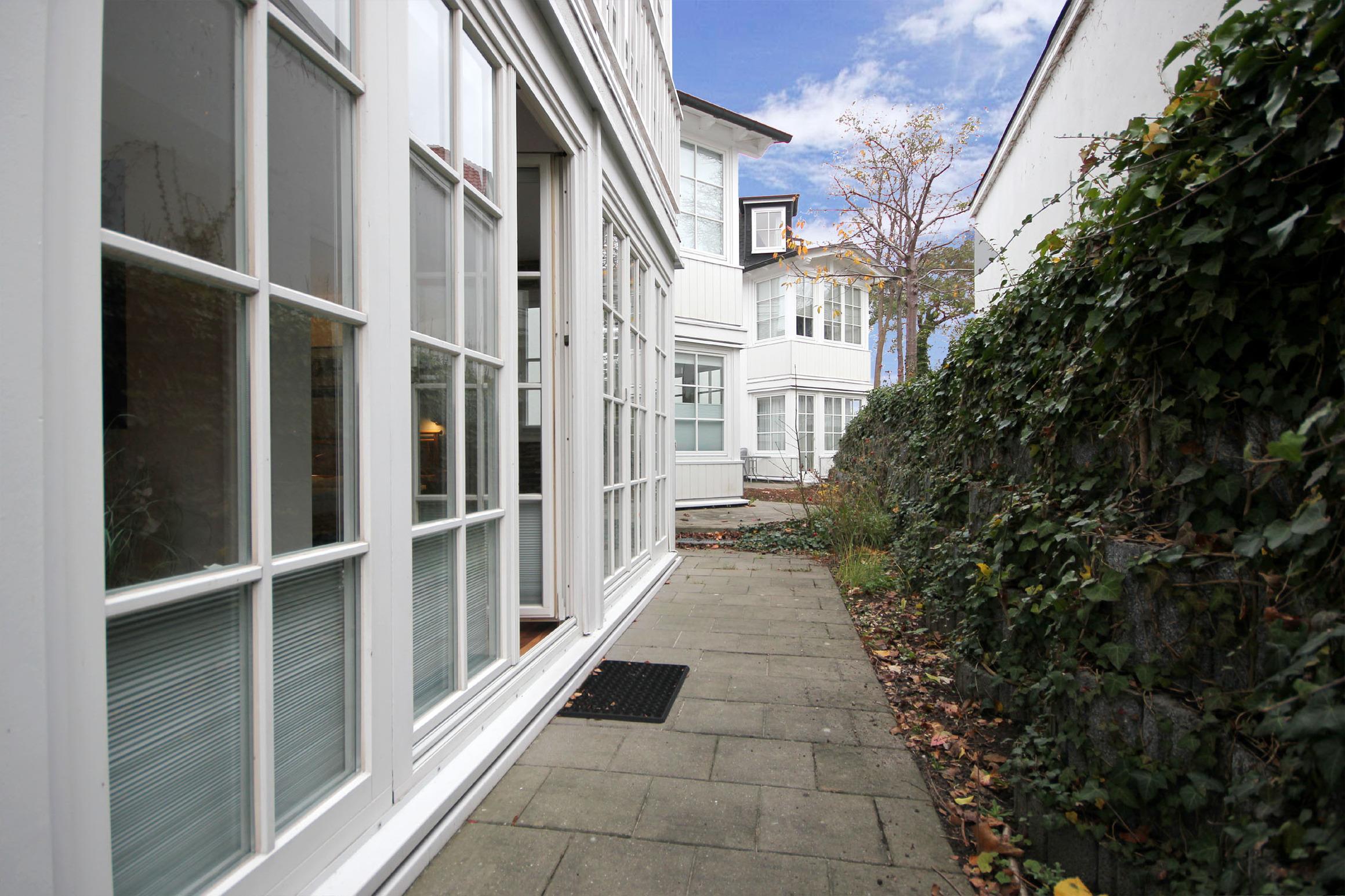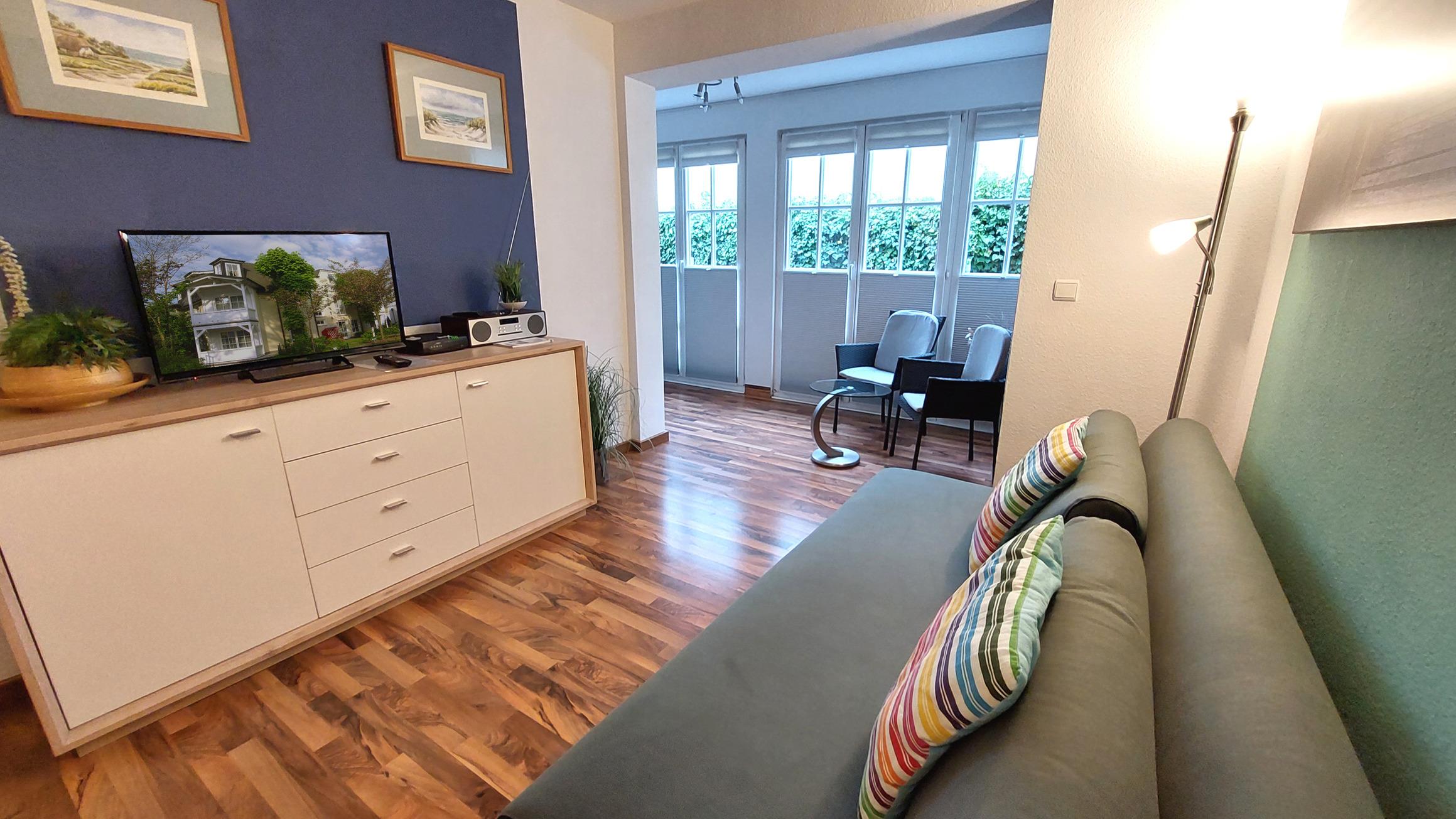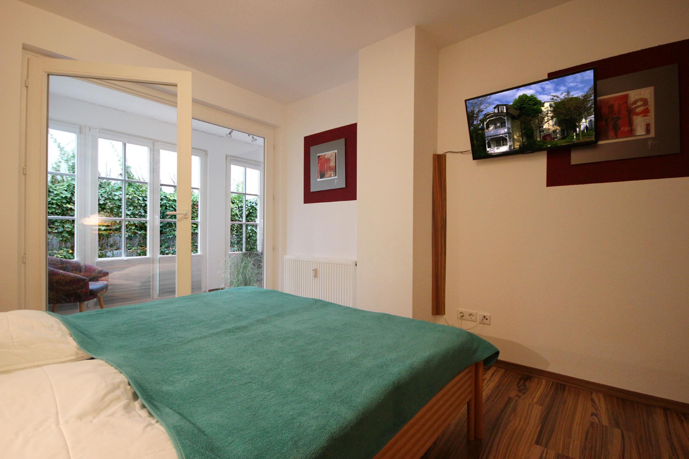 Ihre Ferienwohnung 12RB2 befindet sich im Erdgeschoss der Villa und ist für bis zu 4 Personen ausgestattet. Sie hat eine Größe von ca. 47 m² und verfügt über eine kleine Terrasse nach Osten. Die Wohnung hat neben dem Wohnraum mit integrierter Kochzeile einen separaten Schlafraum, Flur und ein helles Badezimmer mit Waschtisch, Dusche und WC. Im Schlafraum befinden sich ein Doppelbett sowie ein Flachbild-TV. Im Wohnraum finden Sie neben der Sitzecke mit Schlaffunktion einen separaten Essplatz, TV, Musikanlage mit CD-Player und WLAN. Die Küchenzeile ist mit Geschirrspülmaschine, Backofen, Kühlschrank, Mikrowelle, Kaffeemaschine, Toaster, Wasserkocher und diversen Kleingeräten komplett ausgestattet. Vom Wohn- und Schlafbereich gelangen zu einem gemütlichen Wintergarten mit Zugang zur Terrasse. Ein wohnungseigener Stellplatz steht für Sie direkt in der Tiefgarage zur Verfügung. Ebenso befindet sich ein abschließbarer Fahrradraum im Keller des Hauses.