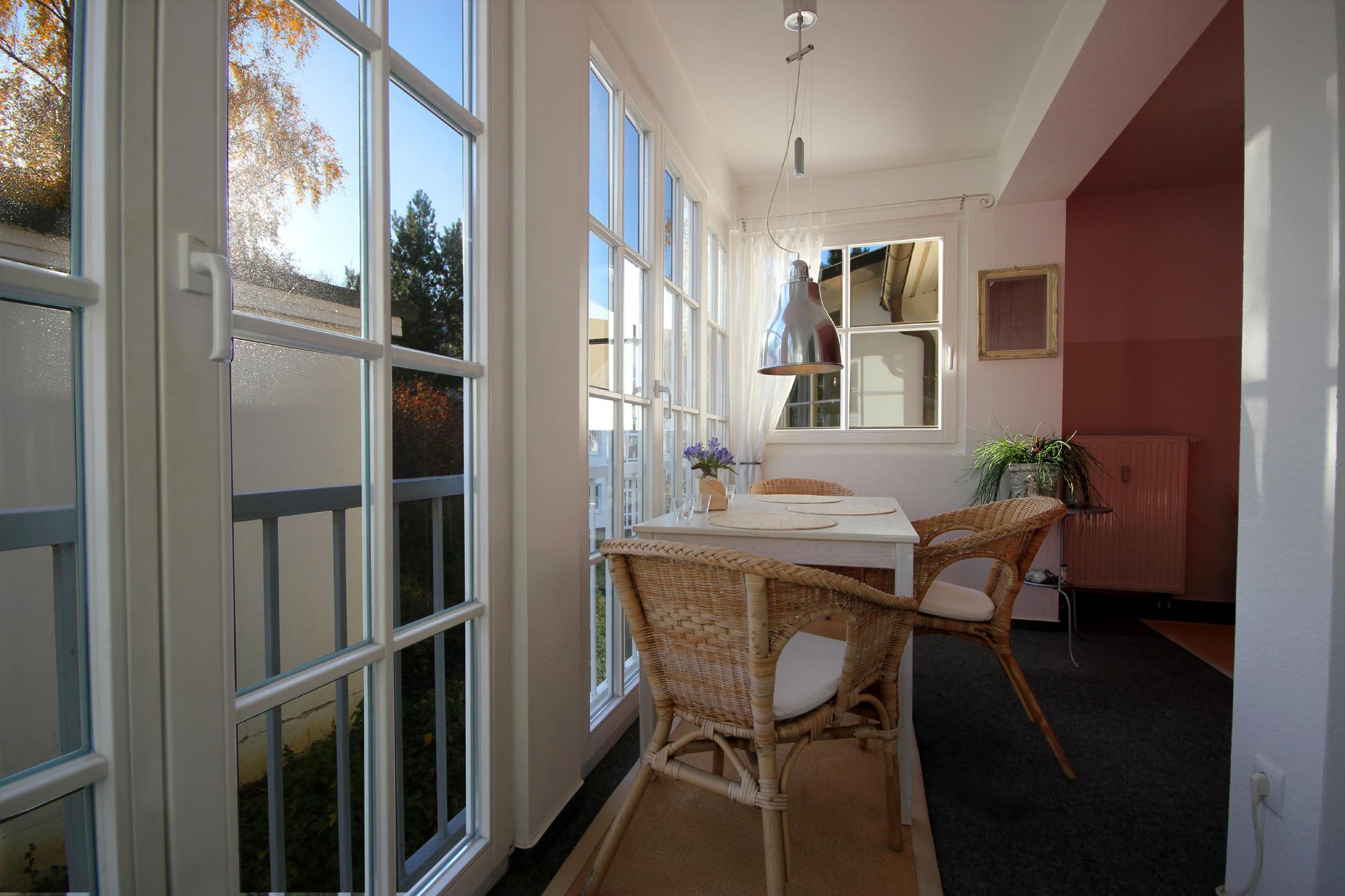 Ihre gemütliche Ferienwohnung 12RB5 befindet sich im 1. Obergeschoss der Villa und ist für bis zu 2 Personen ausgestattet. Sie hat eine Größe von ca. 43 m² und verfügt über einen Wintergarten nach Osten. Die Wohnung hat neben dem Wohnraum mit integrierter Kochzeile einen separaten Schlafraum, einen Flur und ein Badezimmer mit Waschtisch, Kosmetikspiegel, Haartrockner, Dusche und WC. Im Schlafraum befinden sich ein Doppelbett sowie ein Kleiderschrank. Im Wohnraum finden Sie neben der Sitzecke einen TV und WLAN. Die Kochecke ist mit 2-Cerankochfeldern, Kühlschrank, Kaffeemaschine, Toaster, Wasserkocher und weiteren Küchenhelfern ausgestattet. Vom Wohn- und Schlafbereich gelangen zum Wintergarten mit Essbereich. Ein wohnungseigener Stellplatz steht für Sie direkt in der Tiefgarage zur Verfügung. Ebenso befindet sich ein abschließbarer Fahrradraum im Keller des Hauses.