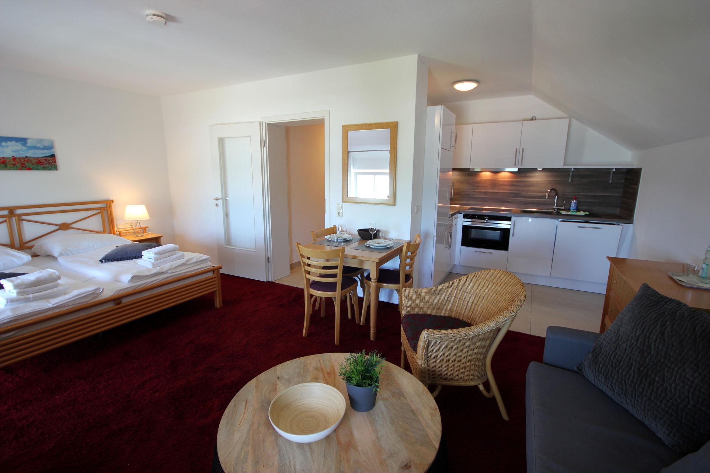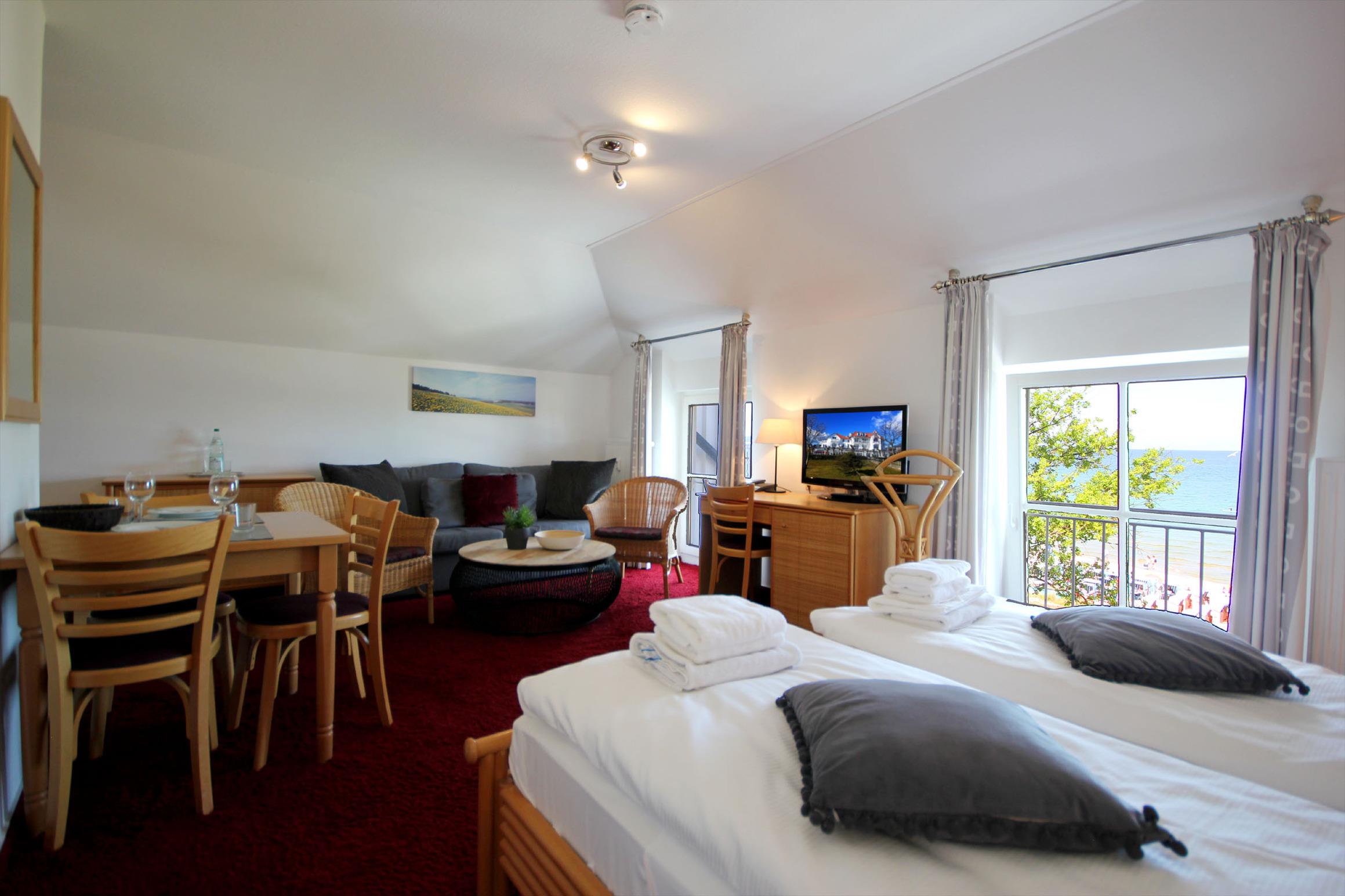 Ihre 1-Zimmer Ferienwohnung 225RB20 befindet sich im 2. Obergeschoss, ist ca. 45 qm groß und für bis zu 4 Personen gut geeignet. Neben dem kombinierten Wohn- und Schlafraum mit Doppelbett sowie Schlafsofa, auf dem die 3. und 4. Person gut schlafen können, gehört ein Essbereich, Flachbild TV sowie WLAN zur Nichtraucherwohnung. Ebenfalls können Sie eine voll ausgestattete integrierte Küchenzeile mit Geschirrspüler, Nespresso-Maschine, Backofen, Mikrowelle, Wasserkocher, Toaster und Kaffeemaschine nutzen. Das Badezimmer erwartet Sie mit Waschtisch, WC und Dusche. Vom Wohn- und Schlafbereich genießen Sie den Blick auf die Strandpromenade sowie auf die Binzer Bucht. Haustiere sind herzlich willkommen.