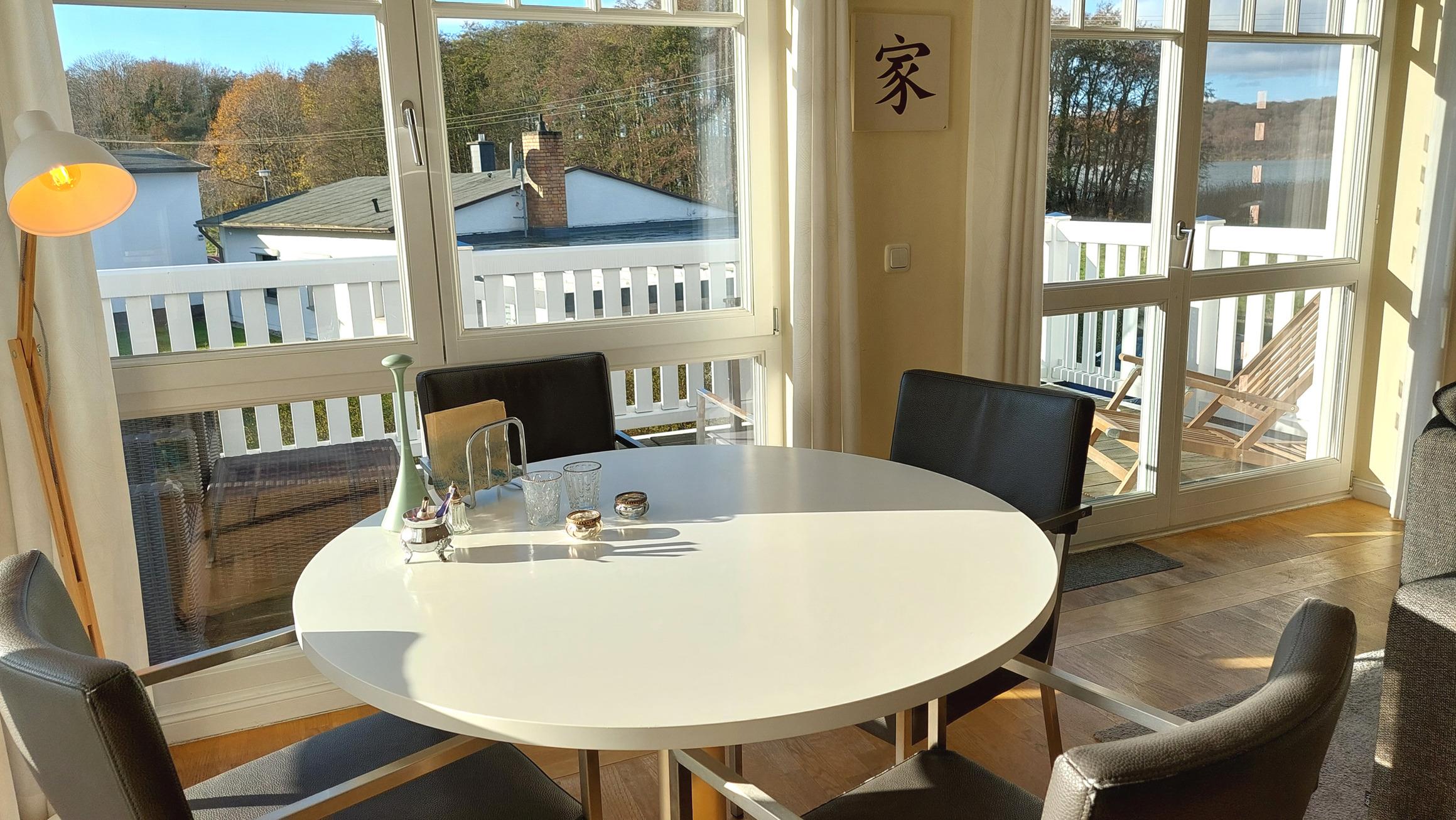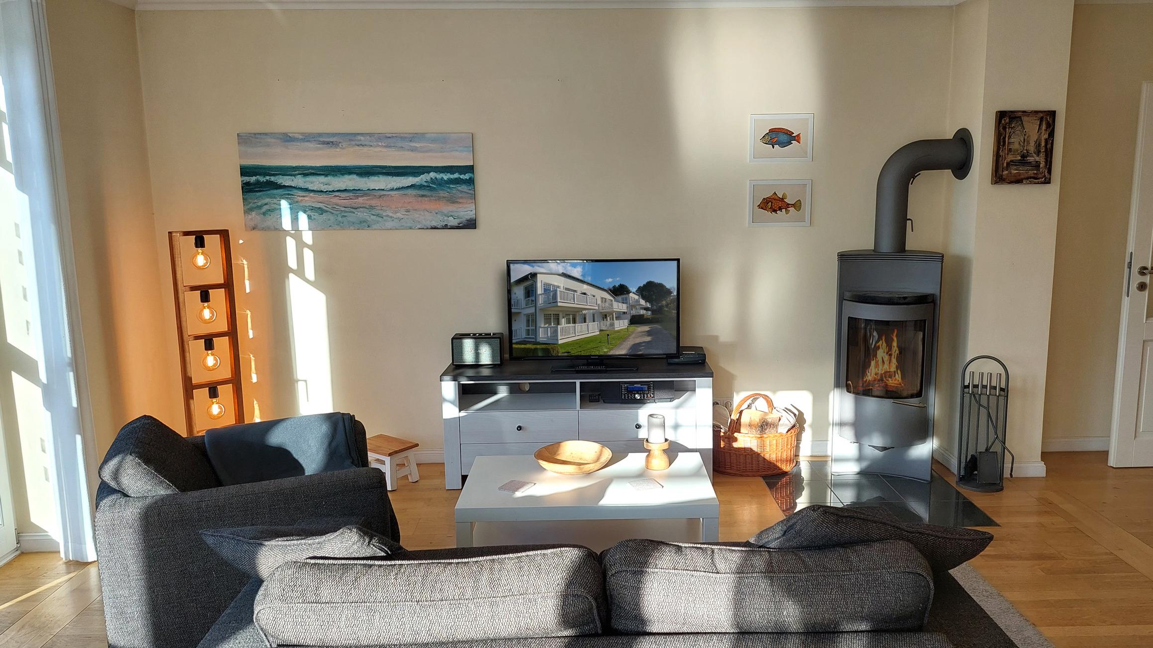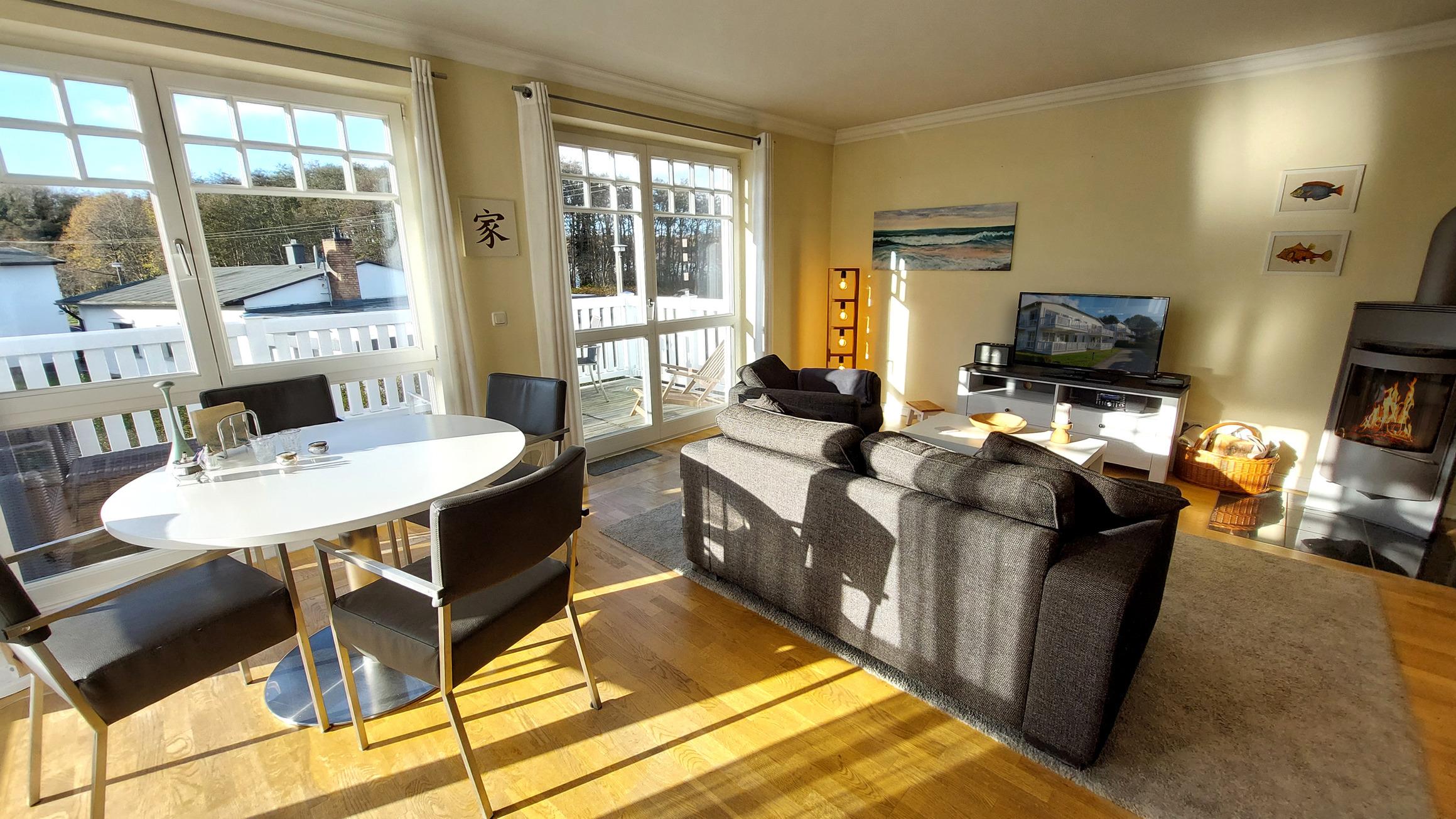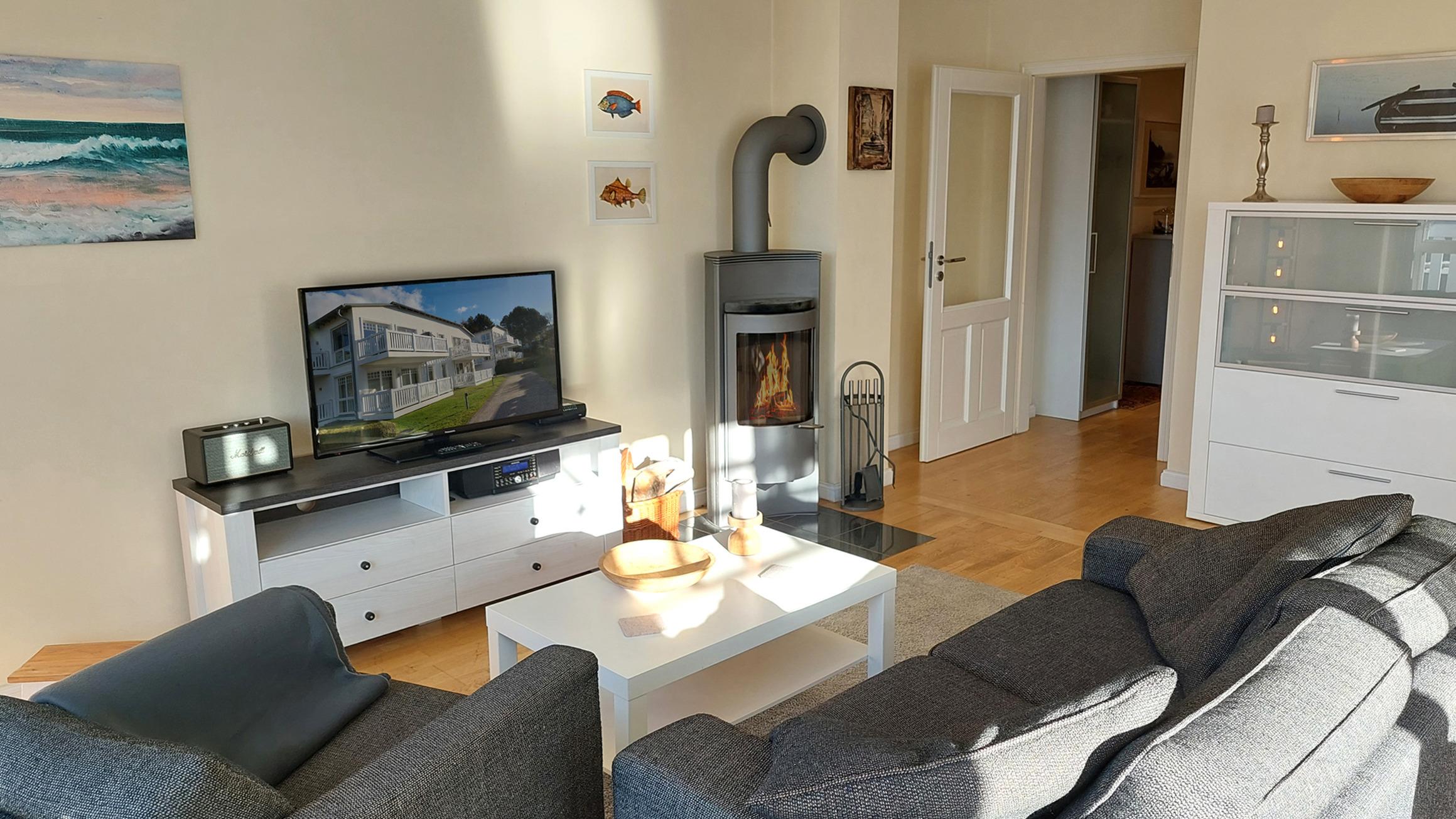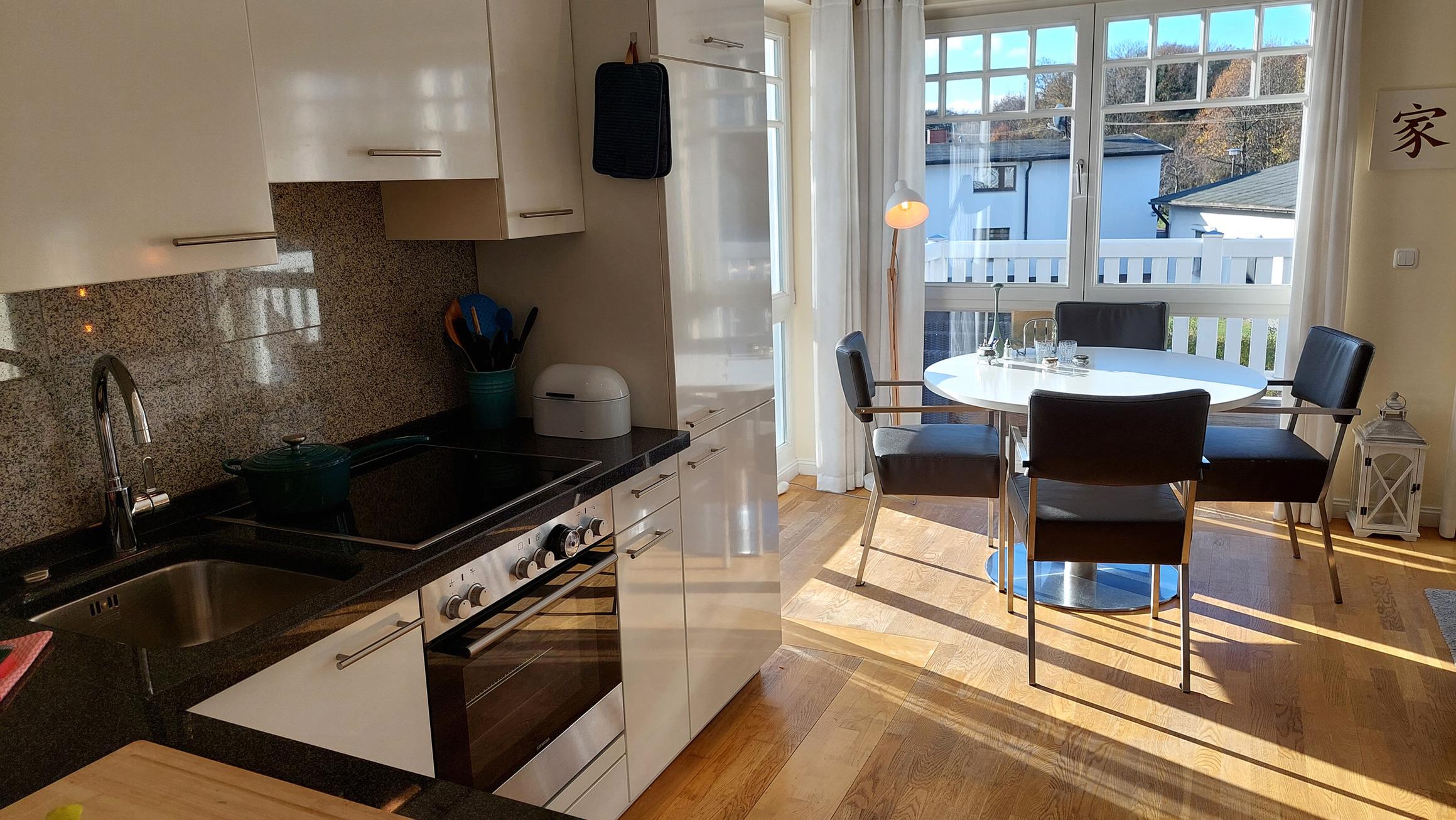 Die Ferienwohnung mit Parkettboden und Fußbodenheizung ist aufgeteilt in einen lichtdurchfluteten modernen Wohnraum mit Kaminofen, einer integrierten Markeneinbauküche mit Granitarbeitsplatte, sowie einer Essecke.
