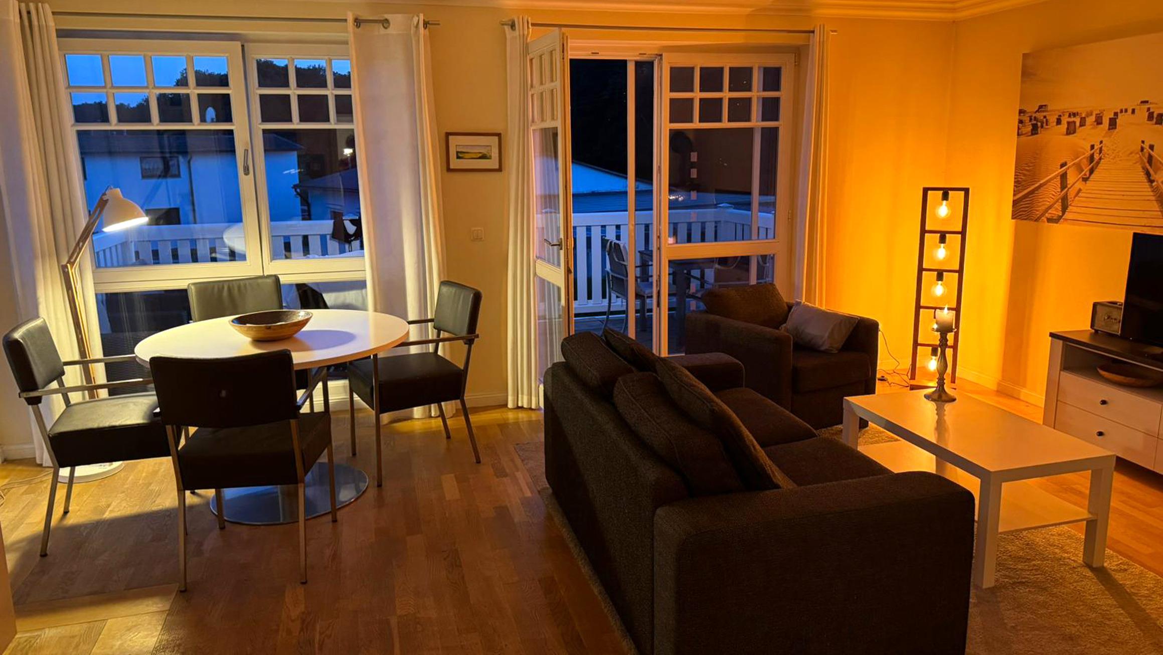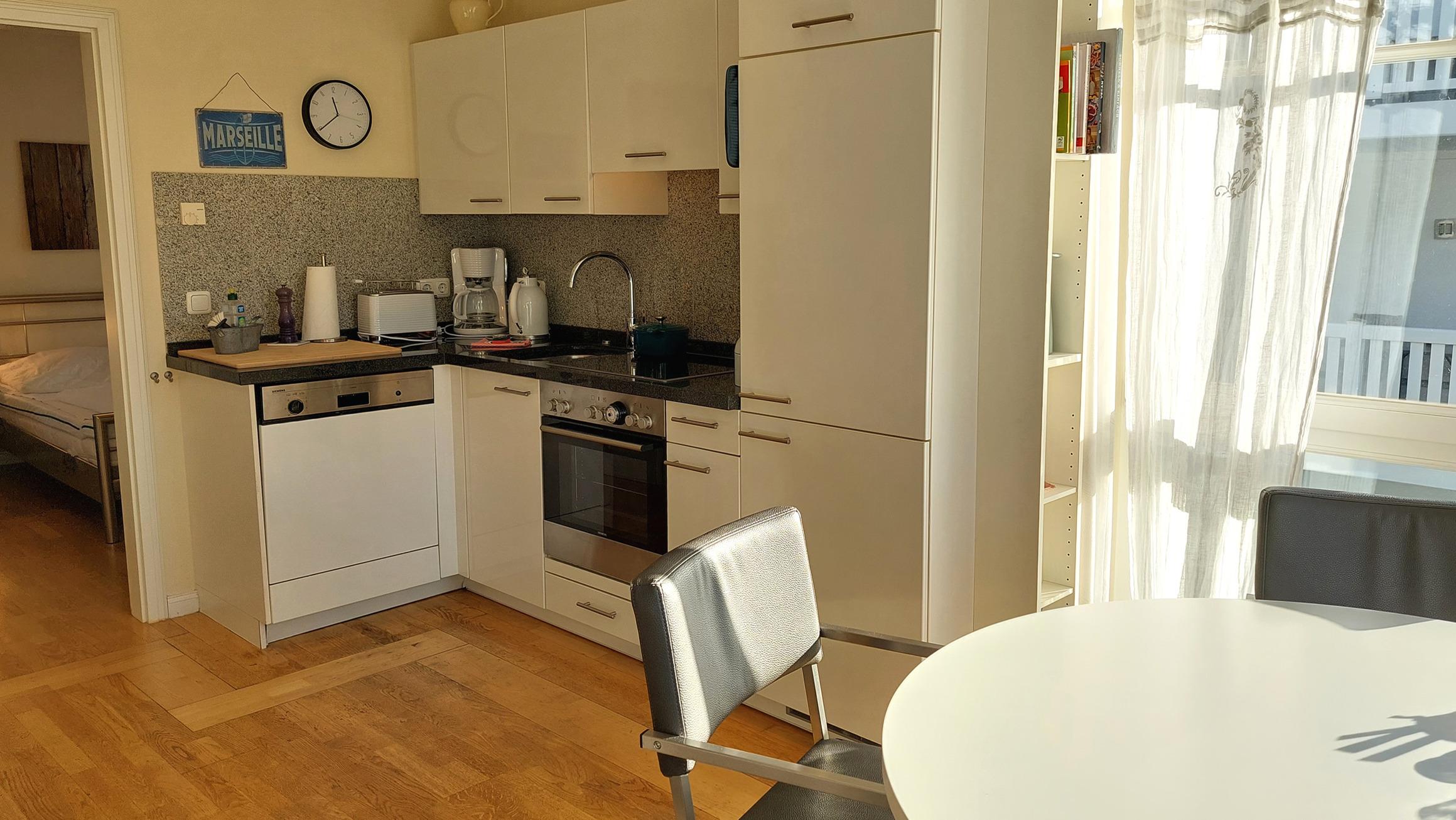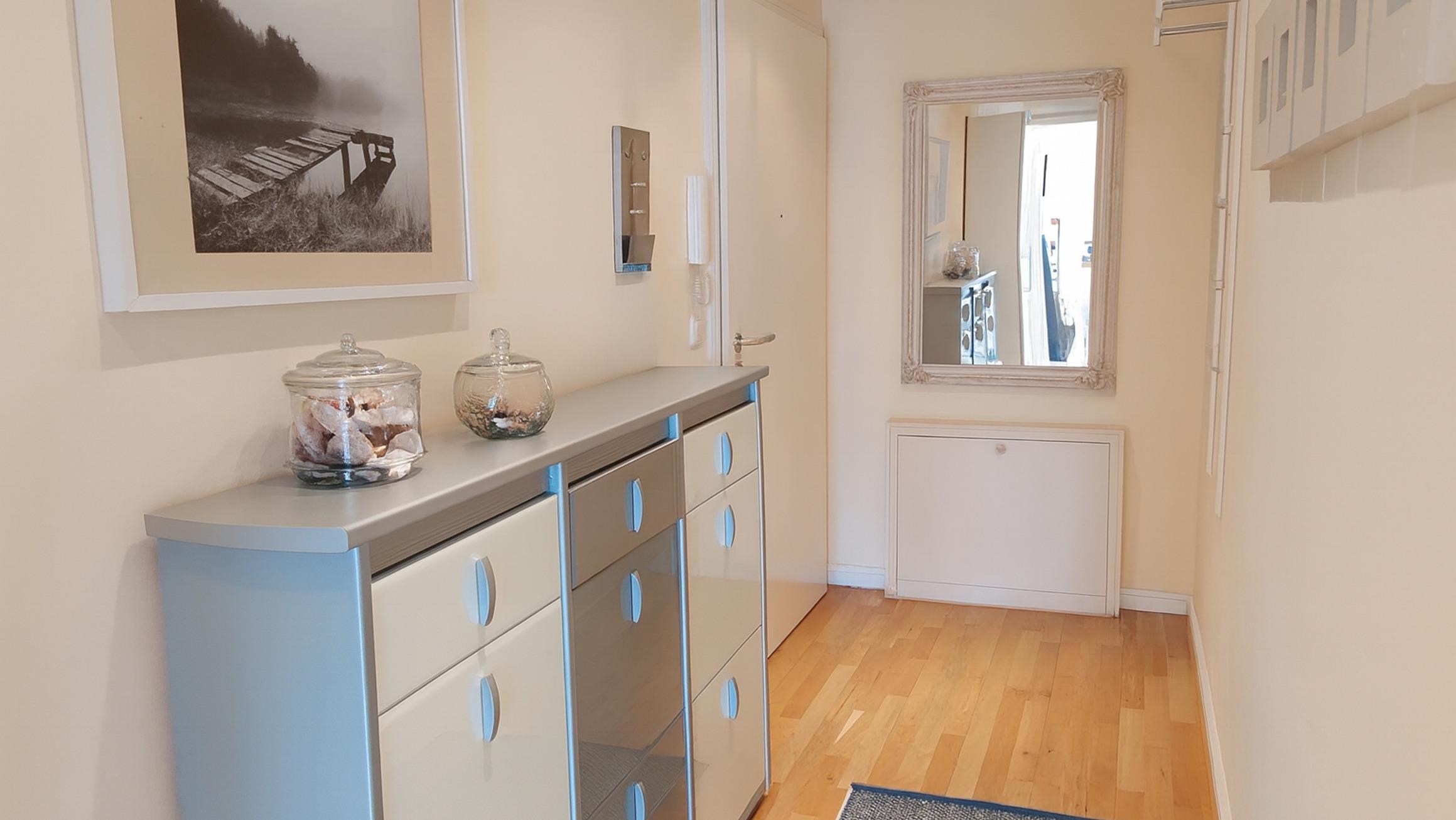 Das Schlafzimmer verfügt über ein Doppelbett, einen großzügigen Kleiderschrank sowie eine Kommode. Das Duschbad über WC und Waschtisch, der Flur über Garderobe und Schuhschrank. Sie finden die Küche mit Kühlschrank/Gefrierfach, Backofen, Ceranfeld, Geschirrspüler und weiteren Elektrogeräten komplett ausgestattet vor. Teakholztisch- und Stühle, ein klappbarer Sonnenschirm sowie zwei zu einer Couch zusammen zu stellende Outdoorsessel laden Sie zum Verweilen auf dem großzügigen Bankirai-Balkon ein und runden das stimmige Gesamtbild der Wohnung ab. Die technische Ausstattung beinhaltet einen WLAN Internetzugang, eine Musik-Anlage mit Subwoofer (Radio-CD-MP3-USB-SD Card Anschlüsse) und einen Smart-TV.