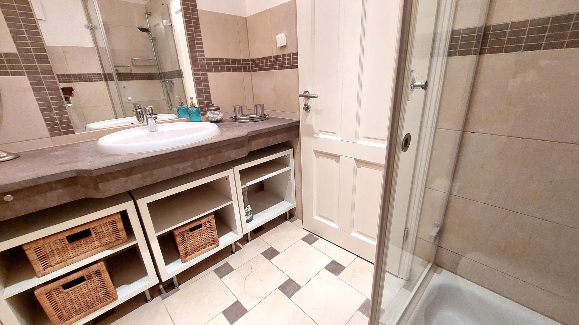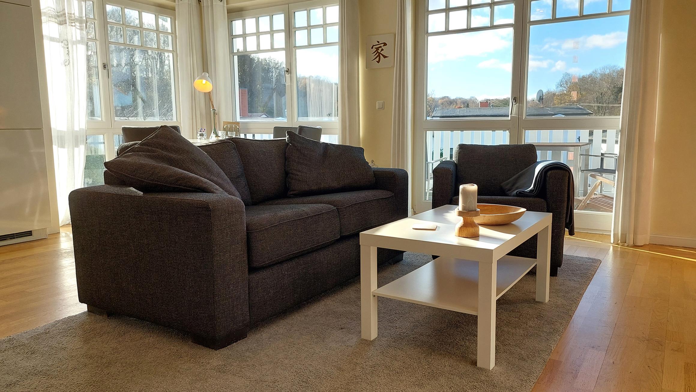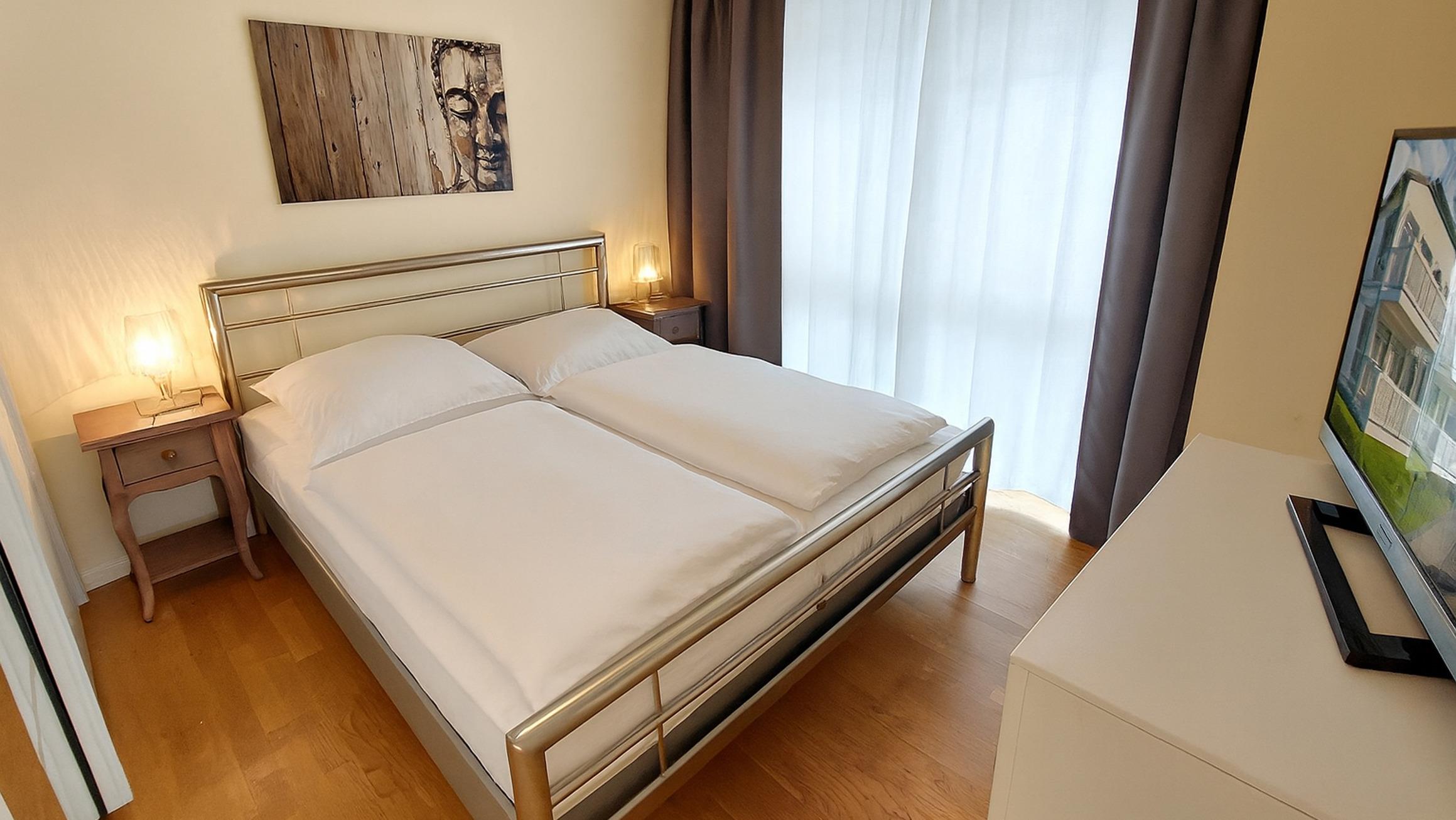 Das Schlafzimmer verfügt über ein Doppelbett, einen großzügigen Kleiderschrank sowie eine Kommode. Das Duschbad über WC und Waschtisch, der Flur über Garderobe und Schuhschrank. Sie finden die Küche mit Kühlschrank/Gefrierfach, Backofen, Ceranfeld, Geschirrspüler und weiteren Elektrogeräten komplett ausgestattet vor. Teakholztisch- und Stühle, ein klappbarer Sonnenschirm sowie zwei zu einer Couch zusammen zu stellende Outdoorsessel laden Sie zum Verweilen auf dem großzügigen Bankirai-Balkon ein und runden das stimmige Gesamtbild der Wohnung ab. Die technische Ausstattung beinhaltet einen WLAN Internetzugang, eine Musik-Anlage mit Subwoofer (Radio-CD-MP3-USB-SD Card Anschlüsse) und einen Smart-TV.