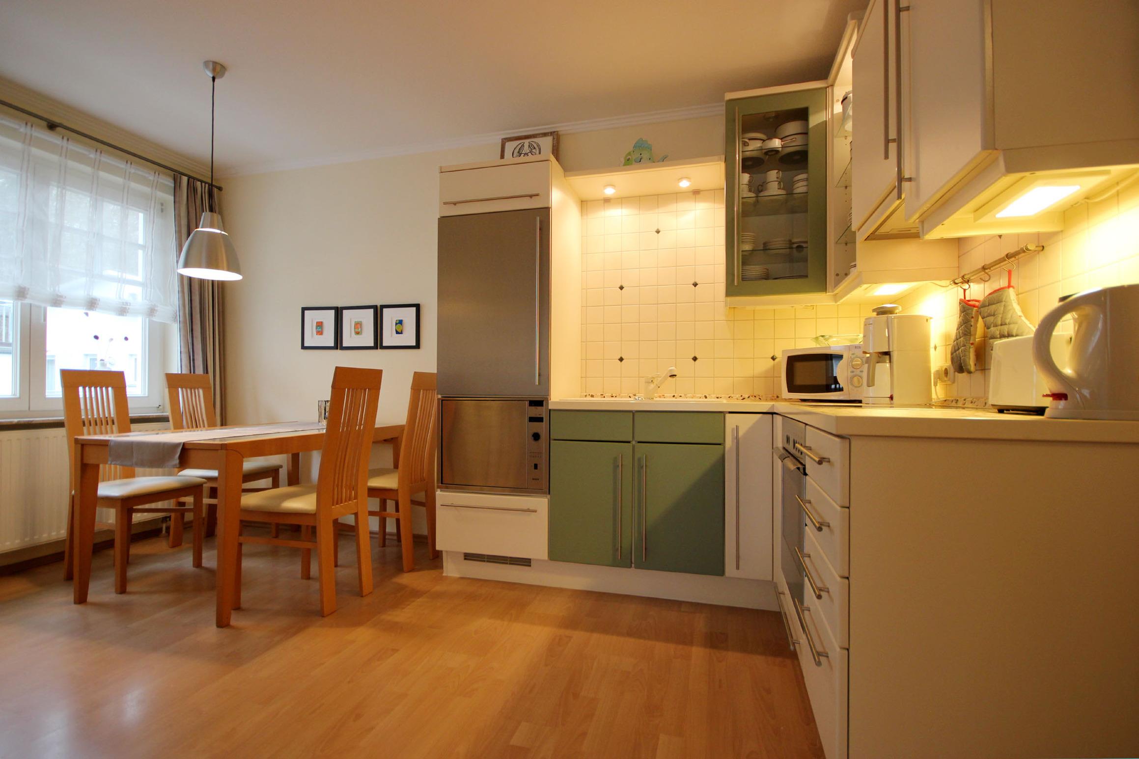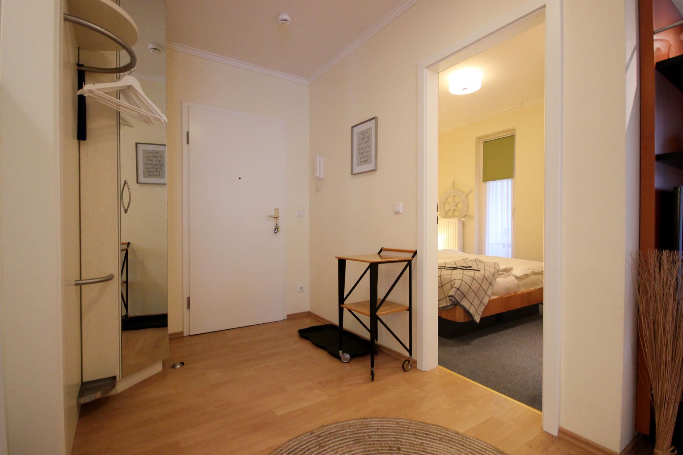 Neben dem Wohnraum mit offener Küche und Essplatz gibt es einen separaten Schlafraum, sowie ein Badezimmer mit Waschtisch, Dusche, WC und Haartrockner. Der Schlafraum ist mit einem Doppelbett und einem großen Kleiderschrank ausgestattet. Im komfortablen Wohnraum finden Sie ein Schlafsofa welches Platz für eine dritte Person bietet. Zur technischen Ausstattung gehört kostenloser WLAN-Zugang und ein großer Flachbildfernseher. Die moderne Küche ist mit Geschirrspülmaschine, Backofen, Mikrowelle, Kühlschrank, Kaffeemaschine, Wasserkocher und diversen anderen Küchenhelfern ausgestattet. Besonderes Highlight dieser Wohnung ist ein eigener Außenstellplatz direkt am Haus ohne Höhenbegrenzung.