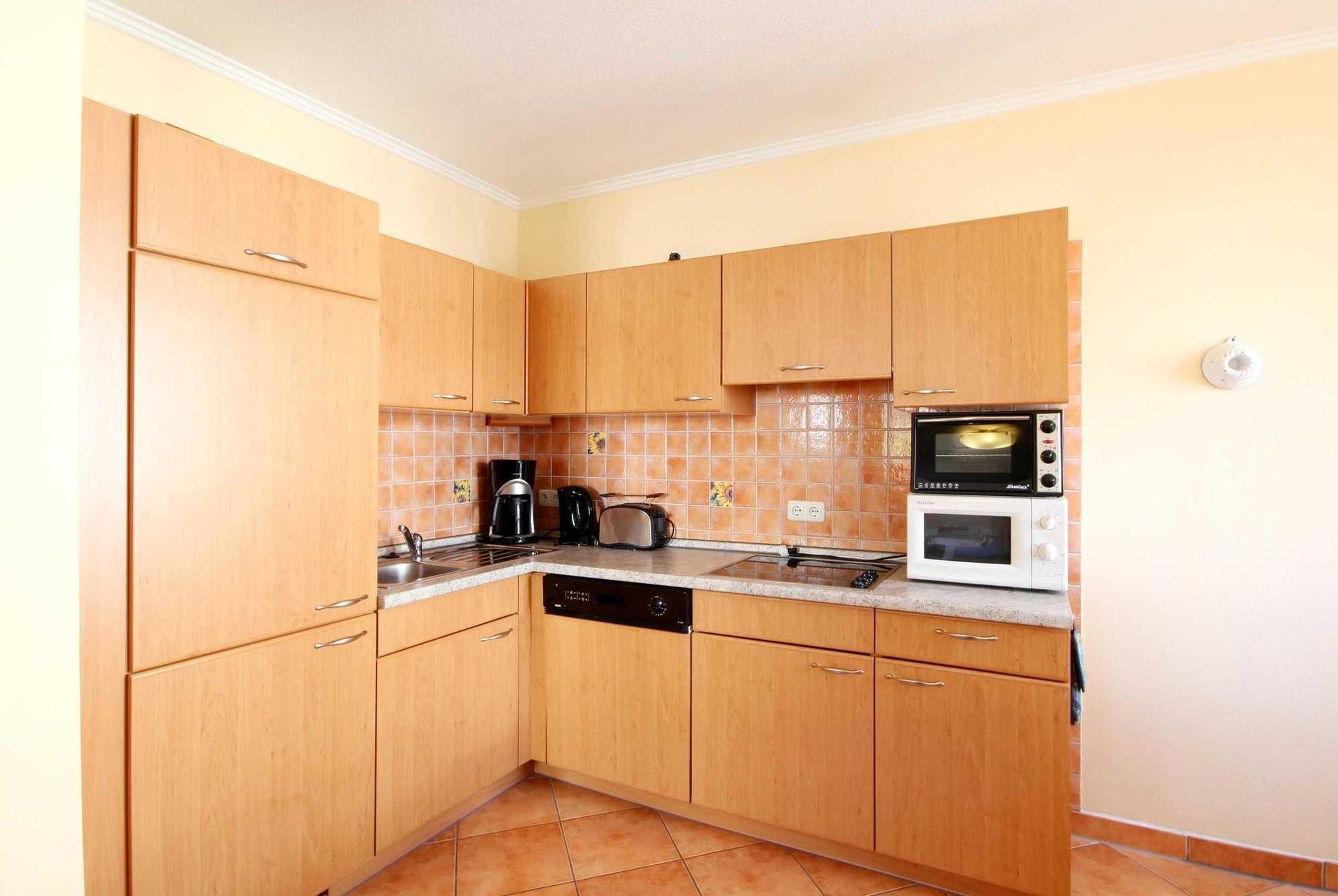 Neben dem Wohnraum mit offener Küche und Essplatz, gibt es einen separaten Schlafraum, sowie ein Badezimmer mit Waschtisch, Dusche und WC. Der Schlafraum ist mit einem Doppelbett und einem großem Kleiderschrank. Von hier aus kommen haben Sie direkten Zugang zum Balkon. Im schönen Wohnraum finden Sie einen Flachbildfernseher; Musikanlage, den kostenlosen Internetzugang sowie das gemütliche Schlafsofa für die 3. und 4. Person. Die Küche ist perfekt für Ihren Urlaub ausgestattet und verfügt im Detail über Mini-Backofen,Cerankochfeld, Geschirrspüler, Mikrowelle, Kühl-/Gefrierkombination, Kaffeemaschine, Wasserkocher und diverse andere „Küchenhelfer".