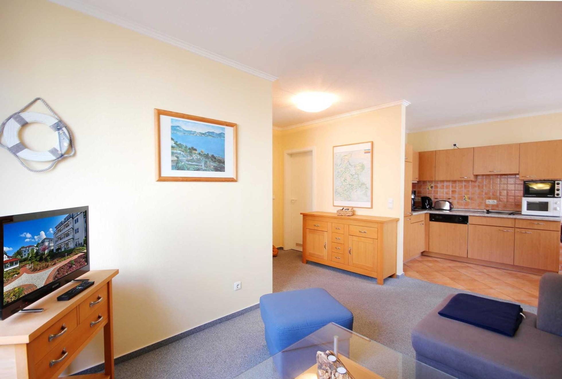Ihre Ferienwohnung 9RB5 (Nichtraucher) befindet sich im 1. Obergeschoss der Villa Grieben in der Residenz am Klünderberg. Die 2 - Zimmer - Wohnung hat eine Größe von ca. 45 qm und ist mit bis zu 4 Personen belegbar. Ein schöner Nord-Ostbalkon befindet sich vor dem Schlafzimmer.