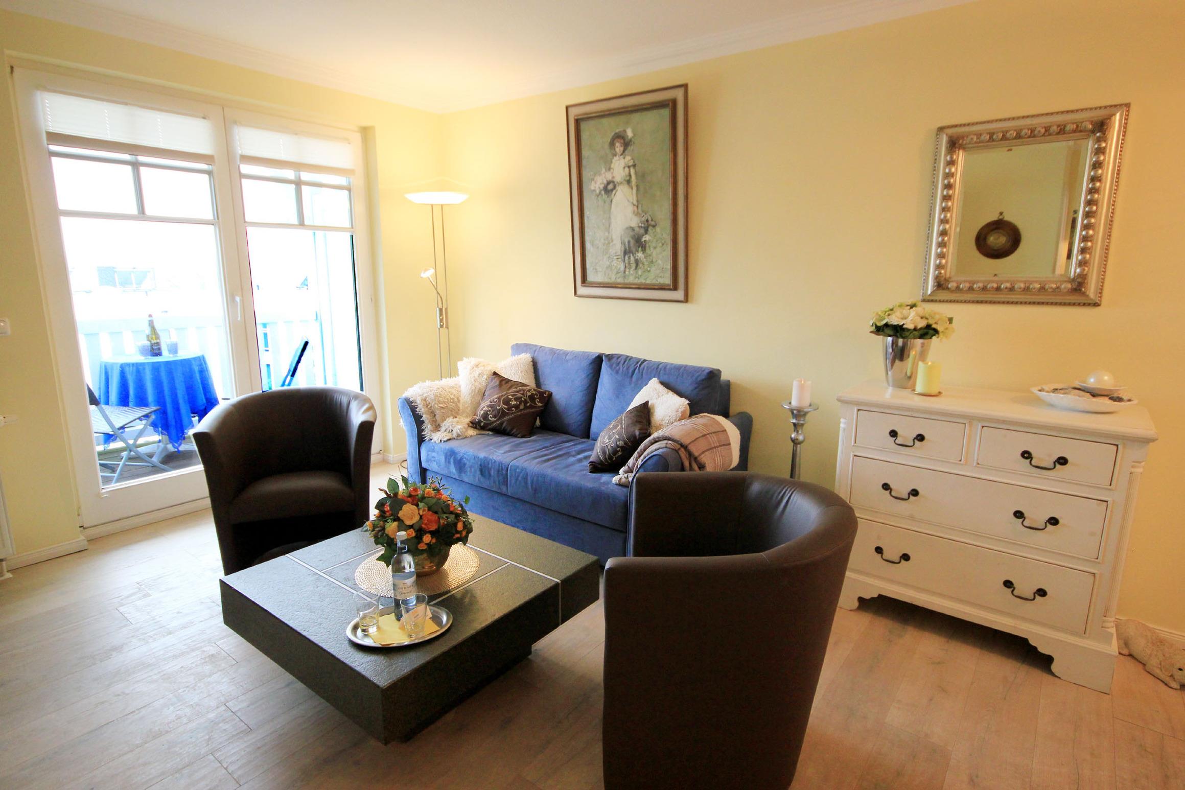 Ihre gemütliche Ferienwohnung 9RB7 in der Villa Grieben befindet sich in der ersten Etage des Hauses. Die 2 Zimmerwohnung verfügt über ca. 48 qm und ist mit bis zu 4 Personen belegbar. Vom überdachten und in Richtung Südwest gelegenen Balkon genießen Sie einen weiten Blick über die Dächer von Binz. Neben dem Wohnraum gibt es eine separate Küche, ein Schlafzimmer sowie ein Duschbad mit Waschbecken und WC. Der Schlafraum ist mit einem Doppelbett (1,60m x 2m) und einem großen Kleiderschrank ausgestattet. Im Wohnraum mit Zugang zum Balkon bietet eine Schlafcouch eine weitere Schlafmöglichkeit für zwei Personen. Außerdem finden Sie im modernen Wohnbereich zwei bequeme Sessel, einen Flachbild – TV sowie einen kostenfreien WLAN-Zugang. Die separate Küche begrüßt Sie mit einer komplett ausgestatteten Küchenzeile u.a. mit Geschirrspüler, Backofen, Mikrowelle, Kühlschrank, Gefrierschrank, ausreichend Geschirr und diversen Kleingeräten.