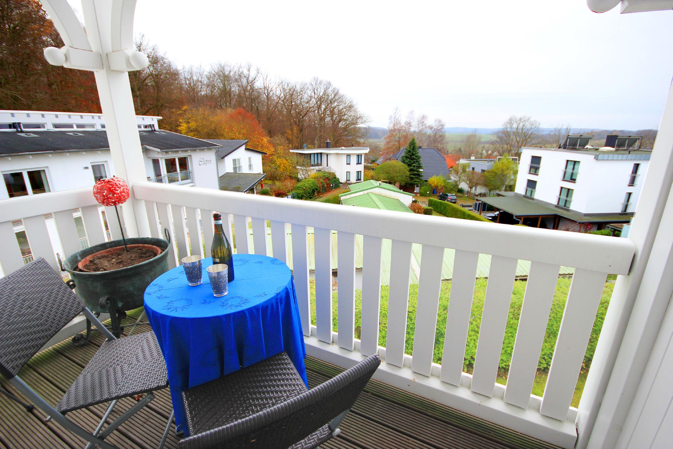 Die Unterkunft befindet auf dem Klünderberg. Die leichte Hanglage auf einem der Binzer Hügeln garantiert aus vielen Wohnungen schöne Ausblicke auf den Binzer Ortskern, teilweise bis zur Ostsee.