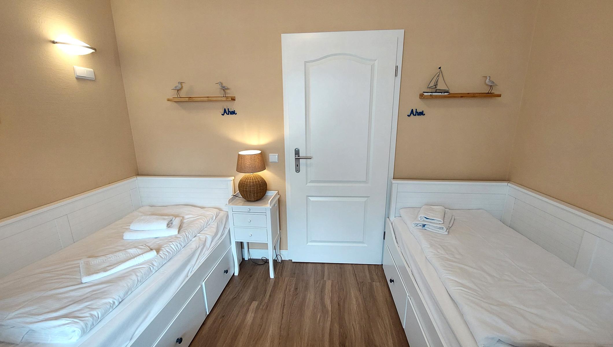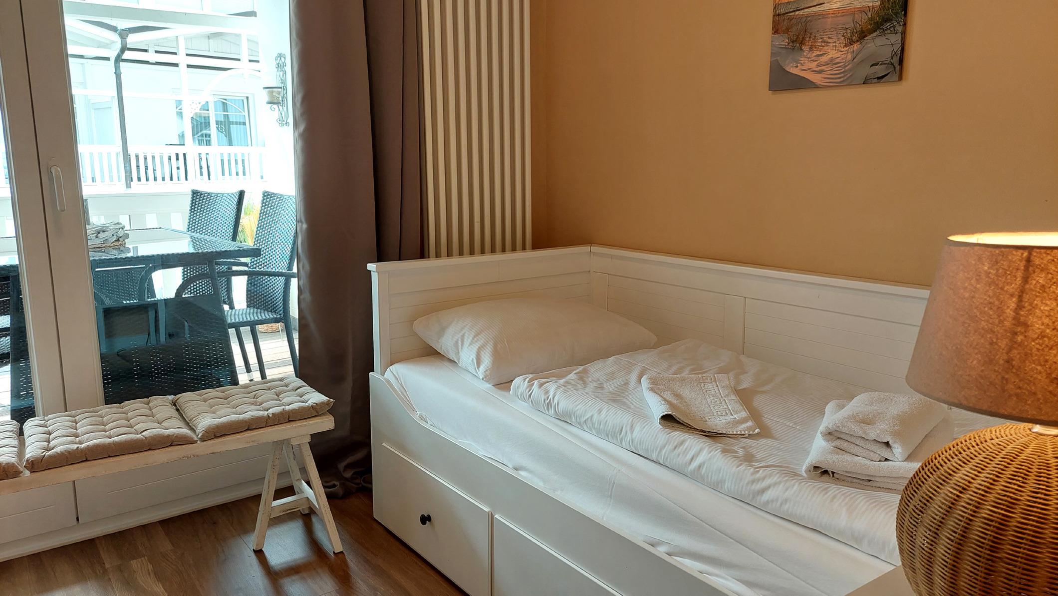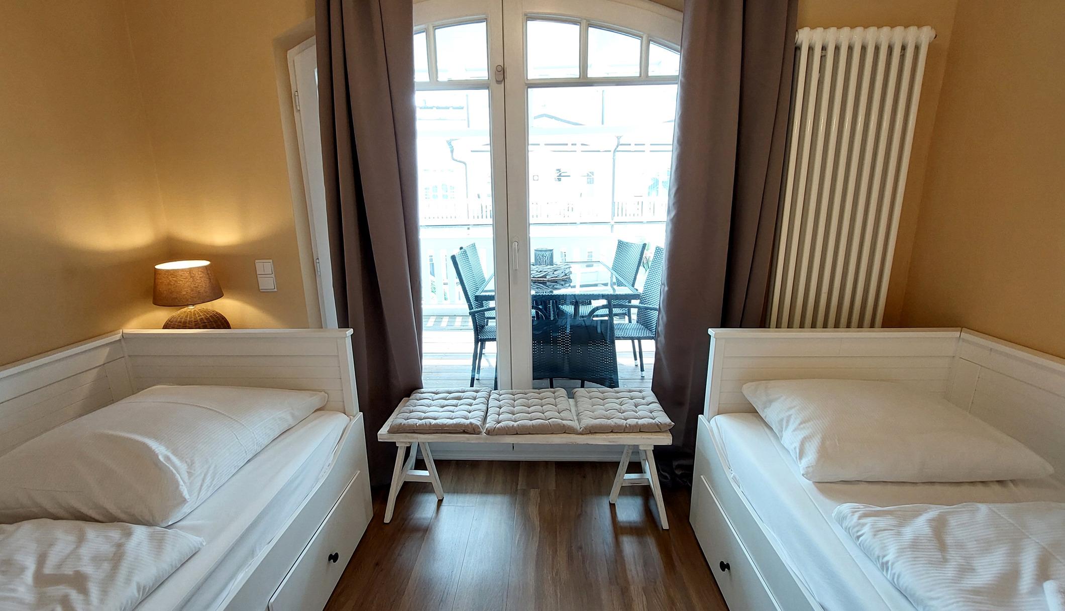 Im zweiten Schlafbereich finden Sie zwei Einzelbetten, einen weiteren Zutritt zum Balkon sowie eine Verdunklungsmöglichkeit vor.