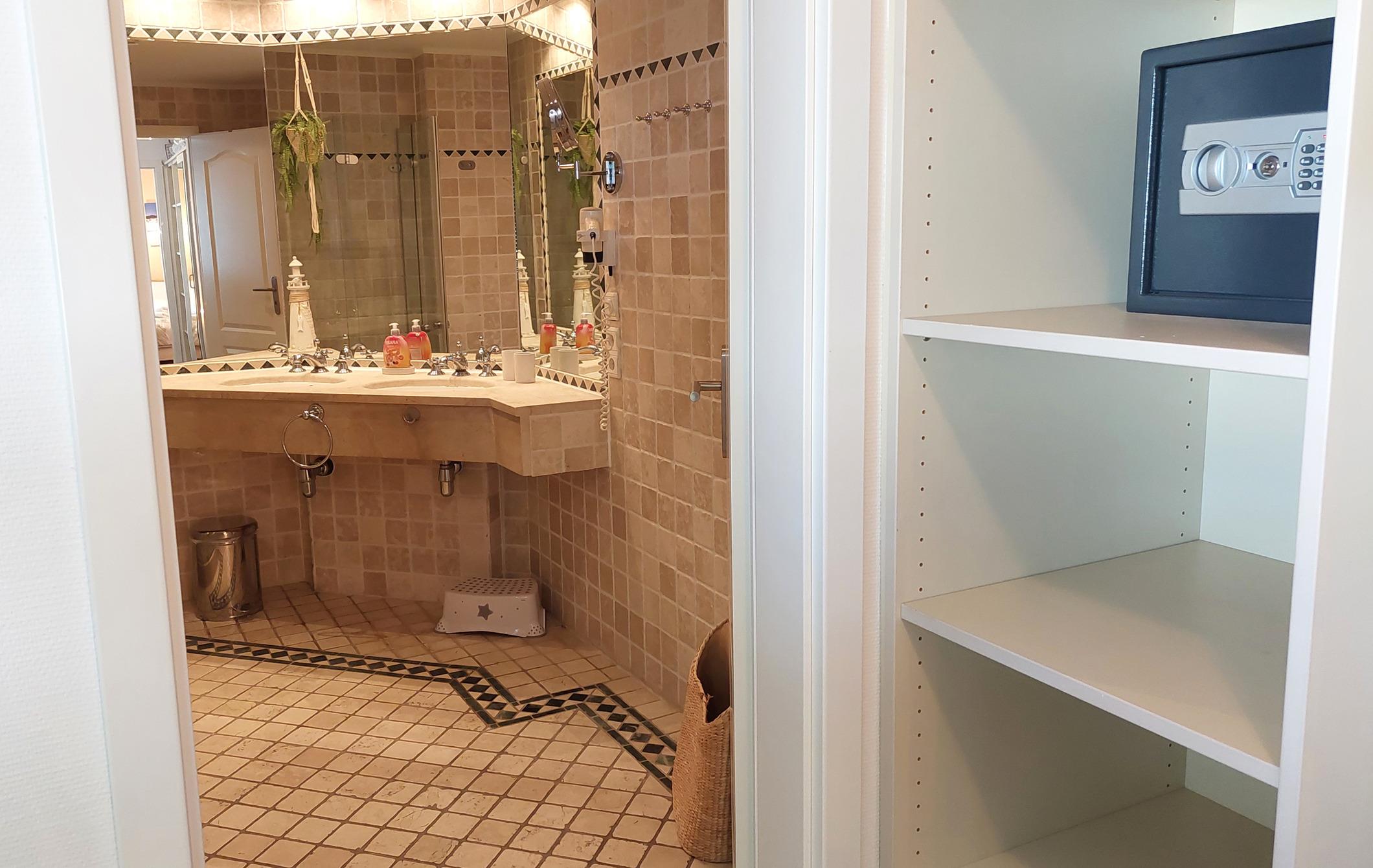 Im Hauptschlafzimmer erwartet Sie ein bequemes Doppelbett, Verdunklungsstoffe für eine erholsame Nacht sowie ein separates Ankleidezimmer mit Kleiderschrank, Safe und zusätzlichem Badzugang.