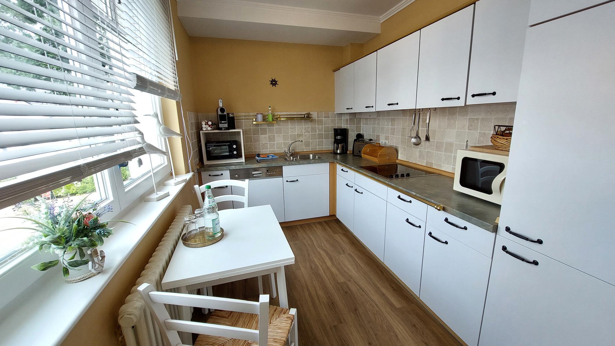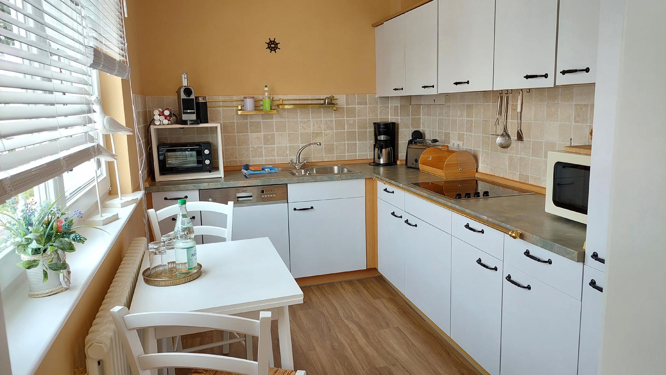Die separate Küche ist komplett ausgestattet mit einem Geschirrspüler, einer Kaffeemaschine, einer Kaffeekapselmaschine, einem Wasserkocher, Toaster, Mini-Backofen, Mikrowelle, Cerankochfeld, Kühlschrank mit kleinem Gefrierfach sowie umfangreichem Kücheninventar.
