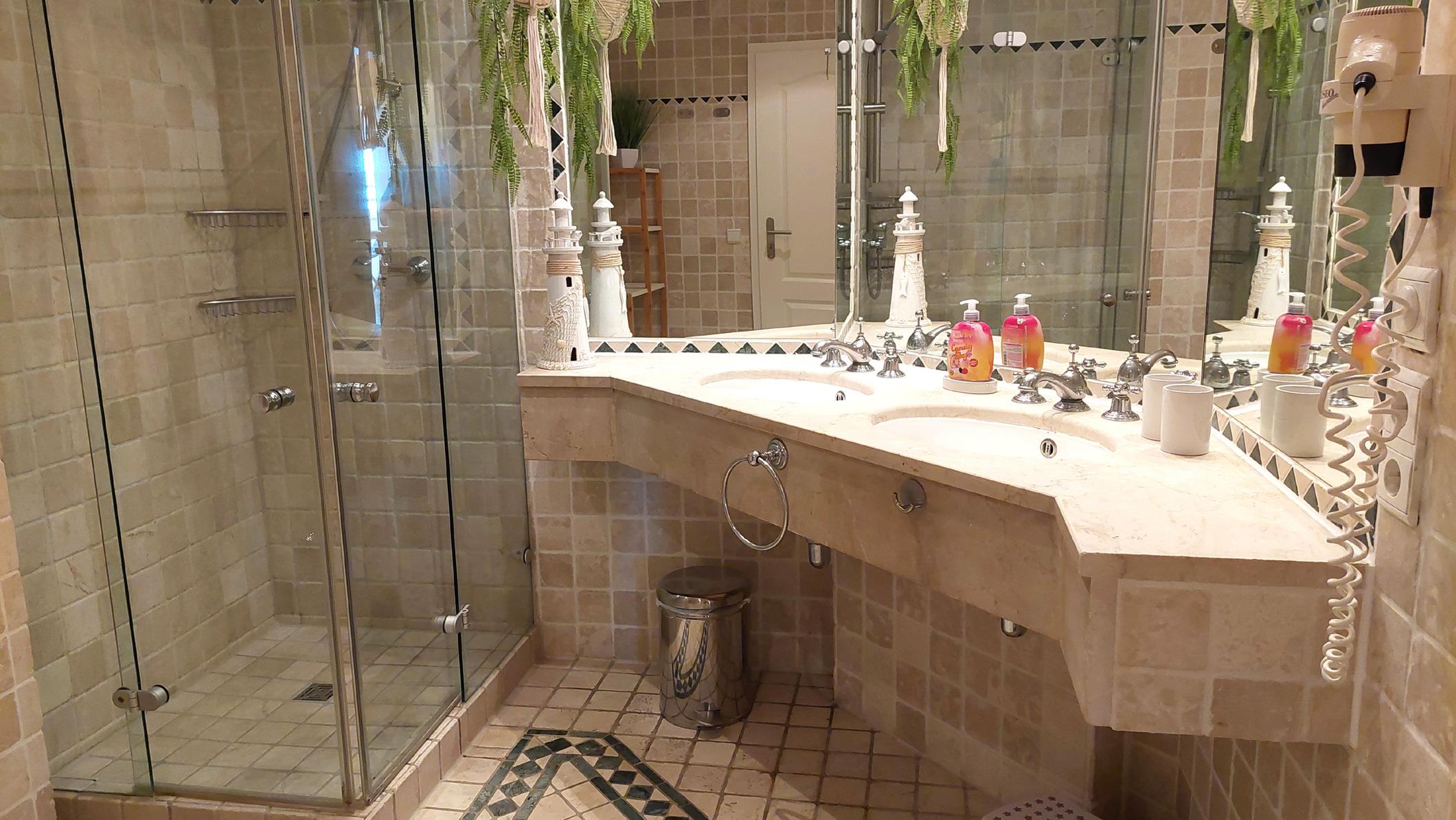 Das Badezimmer mit Antikmamor verfügt über einen Doppelwaschtisch, Dusche, Kosmetikspiegel, Haartrockner und WC.