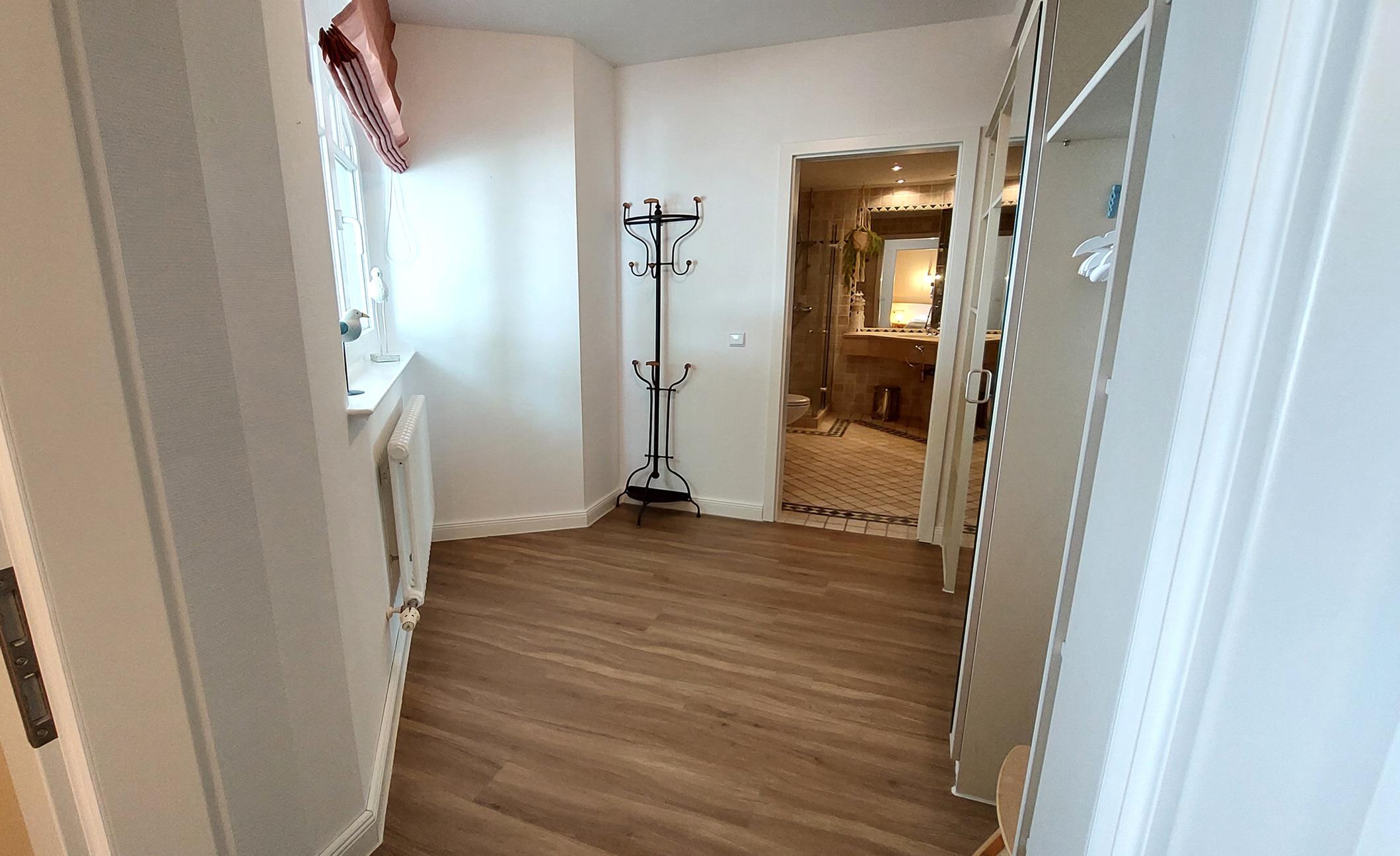 Über den geräumigen Flur samt Garderobe und Sitzgelegenheit gelangen Sie in das Badezimmer, in den Wohnbereich und in beide Schlafzimmer.