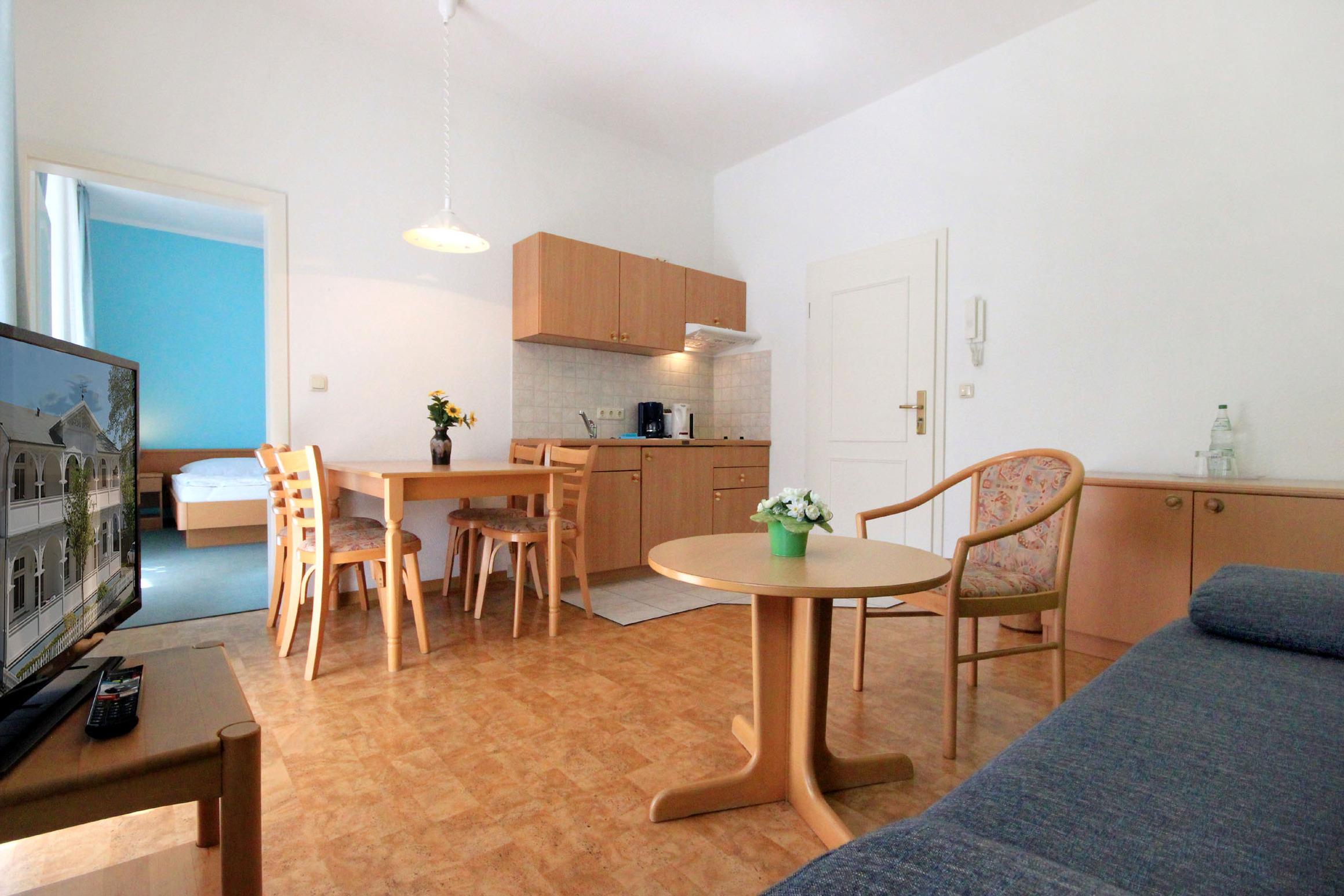 Im Wohnraum gibt es eine gemütliche Sitzecke mit Schlaffunktion für die 3. Person, Flachbild-TV sowie einen separaten Essplatz
