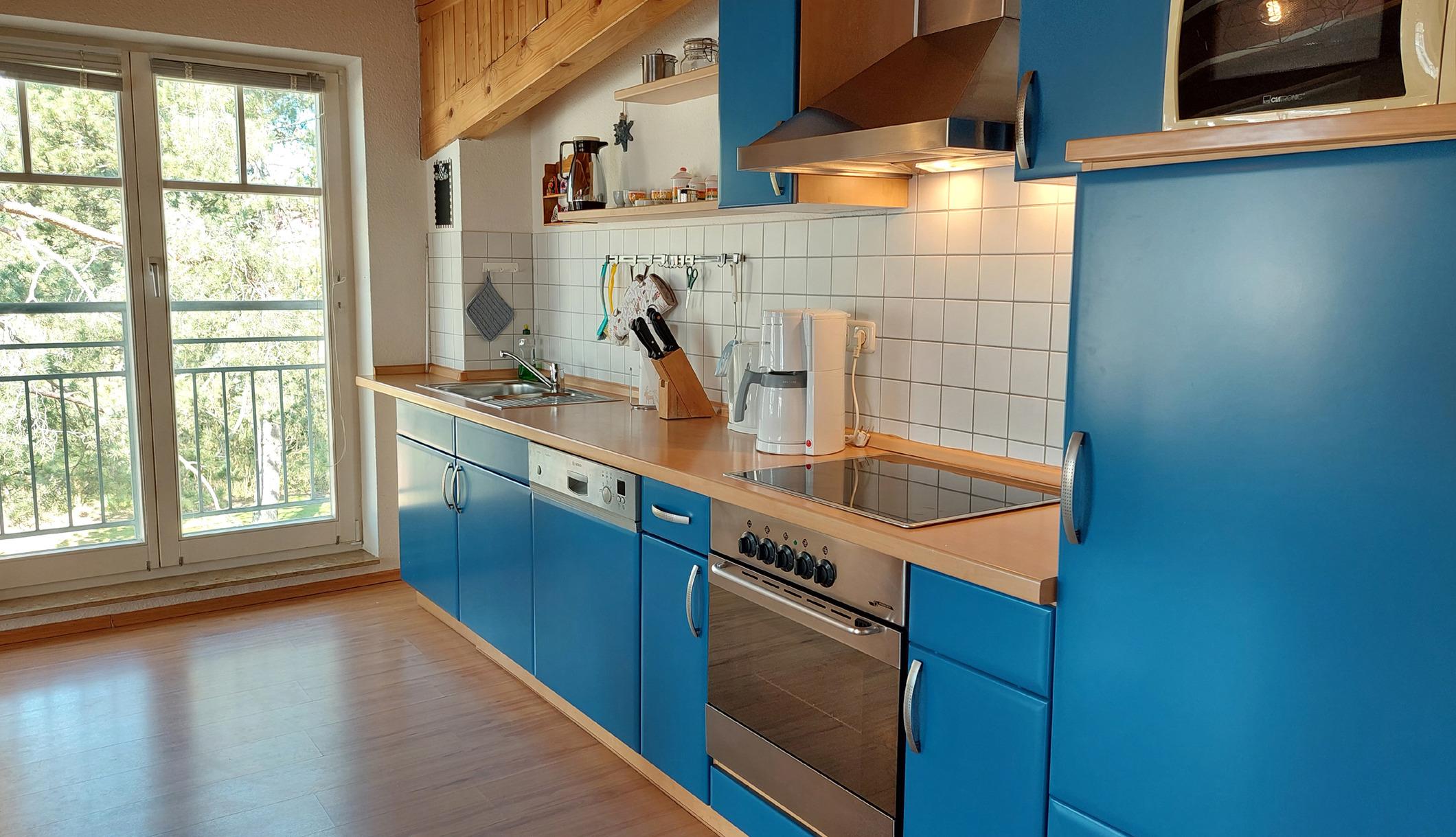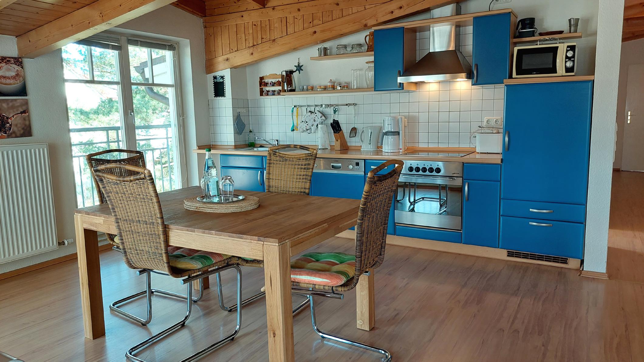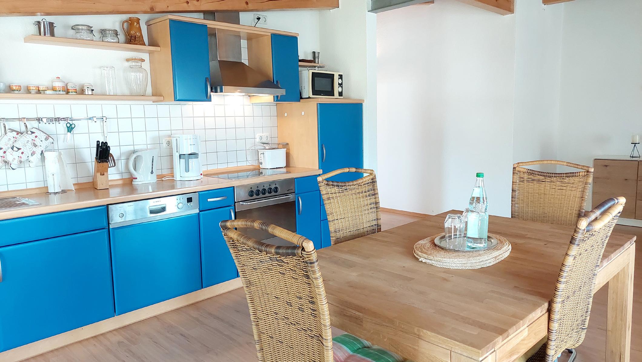 Der offene Koch-und Essbereich verfügt über eine gute ausgestattete Küchenzeile mit Geschirrspüler, Backofen, Wasserkocher, Kaffeemaschine, Mikrowelle, Toaster und vielen weiten nützlichen Küchenutensilien.