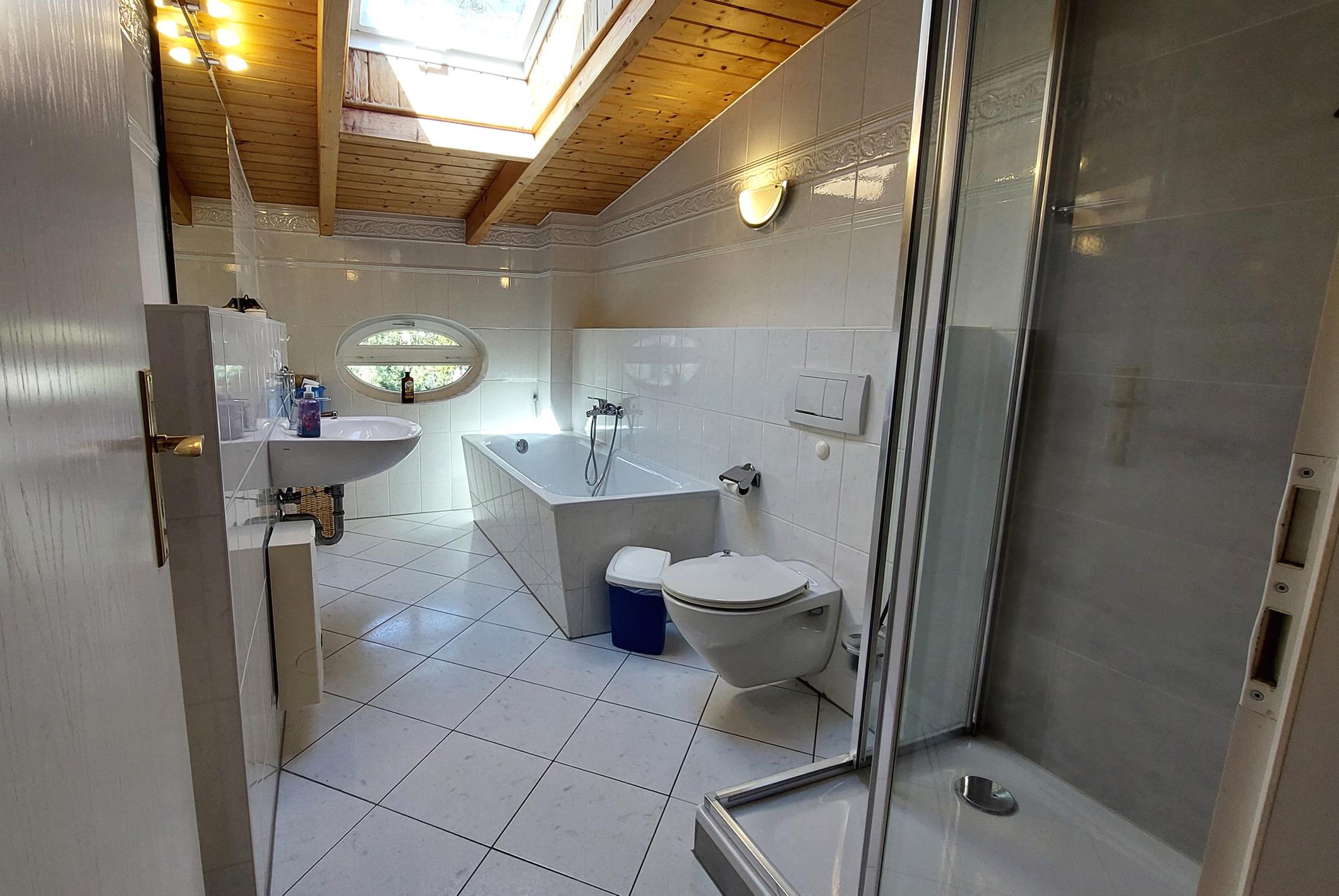 Das lichtdurchflutete Tageslichtbad bietet einen Waschtisch, WC, Dusche und eine Badewanne.