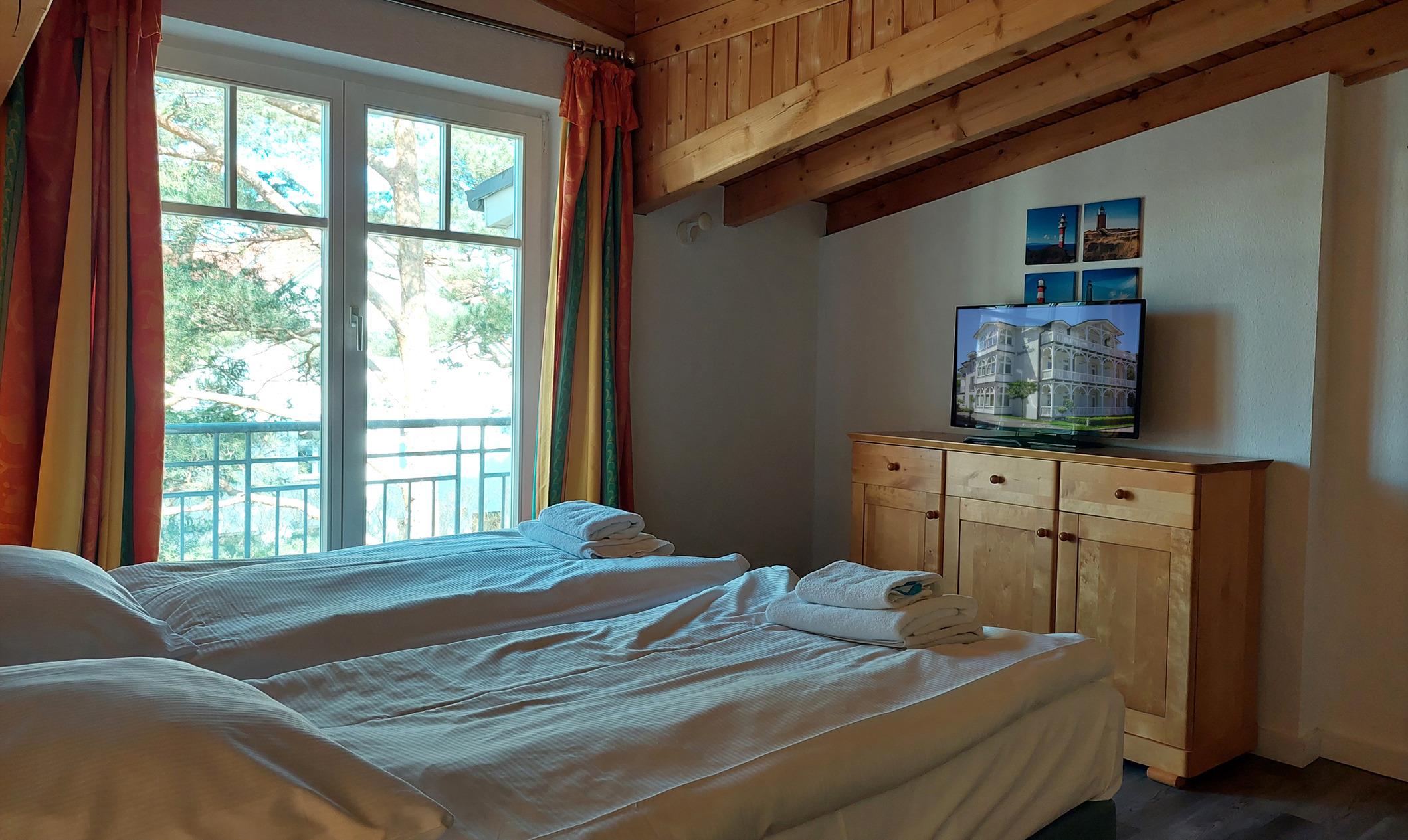 Ihre Ferienwohnung 90279 wurde 2023 neu eingerichtet und befindet sich im 2. Obergeschoss und ist ca. 60 qm groß. Diese 2-Raum-Nichtraucher Dachgeschosswohnung hat ein Schlafzimmer mit einem Doppelbett, Kleiderschrank, TV und separatem Balkon.