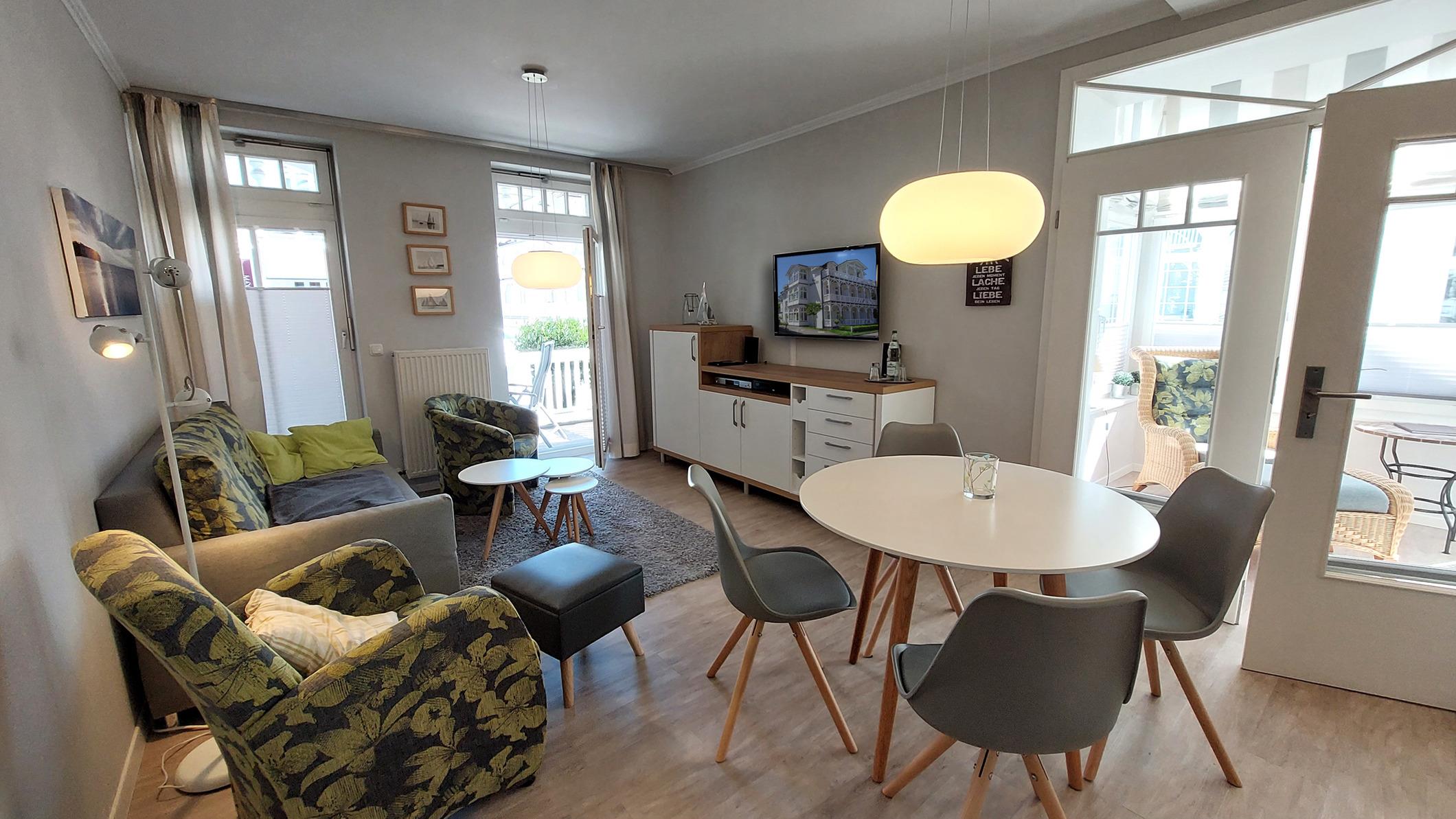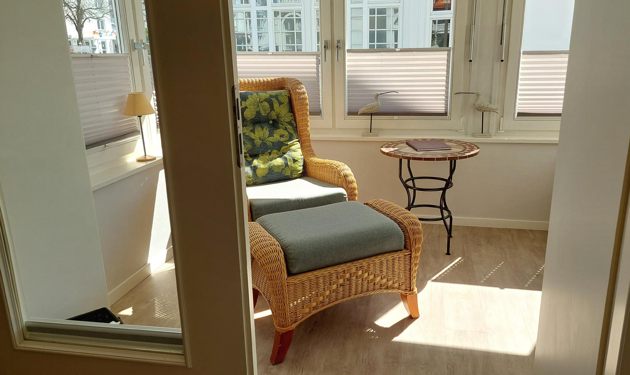Ihre hochwertig ausgestattete Ferienwohnung 90400 befindet sich im Erdgeschoss der Villa und ist ca. 53 qm groß. Die 2-Raum-Nichtraucher-Wohnung ist für bis zu 4 Personen geeignet und verfügt über einen hellen Wintergarten mit gemütlicher Sitzecke sowie einen Balkon.