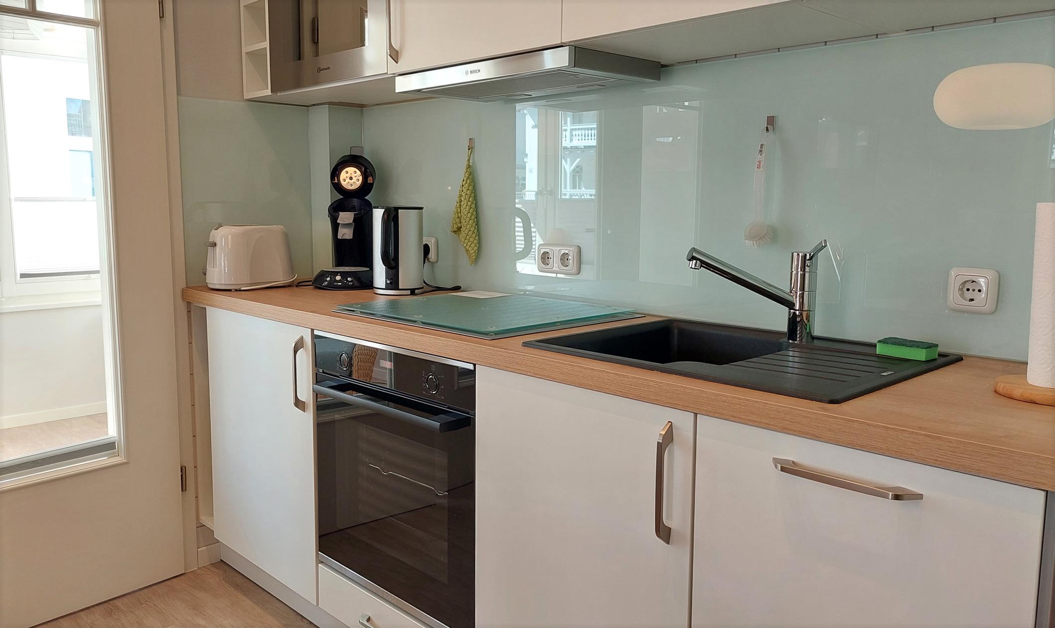 Diese schöne Wohnung verfügt über einen großzügigen Wohnraum, mit Schlafcouch (1,60 m x 2 m), Flachbildfernseher, WLAN, Sound-Anlage mit CD-, DVD- und Blue-Ray-Player. Zur umfangreich ausgestatteten, integrierte Wohnküche, mit Backofen, Geschirrspüler, Mikrowelle mit Grillfunktion, 2 Kaffeemaschinen (Filter und Pads), Wasserkocher, Toaster, Ceran-Kochfeld mit Dunstabzugshaube, gehört außerdem der separate Essplatz. Das Schlafzimmer verfügt über ein Doppelbett sowie einen geräumigen Kleiderschrank. Der separate Wintergarten bietet einen Rückzugsort und lädt zum Schmökern ein. Mit dem zweiten Sofa (1,20 x 2 m) ist dort eine weitere Schlafmöglichkeit vorhanden. Das geräumige Badezimmer besticht mit einem Doppelwaschtisch, großzügig dimensionierter Dusche mit extraflachem Einstieg, Fön und WC.