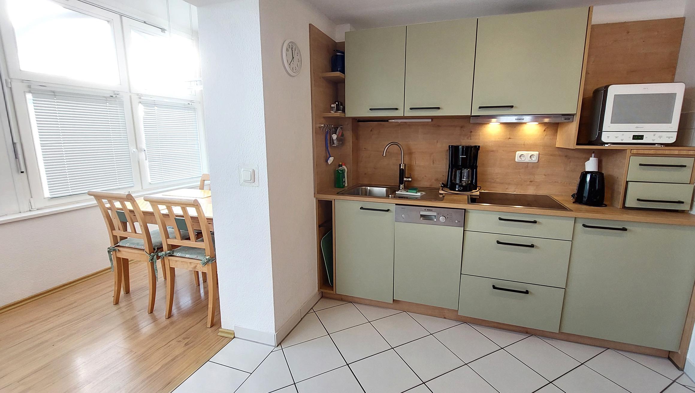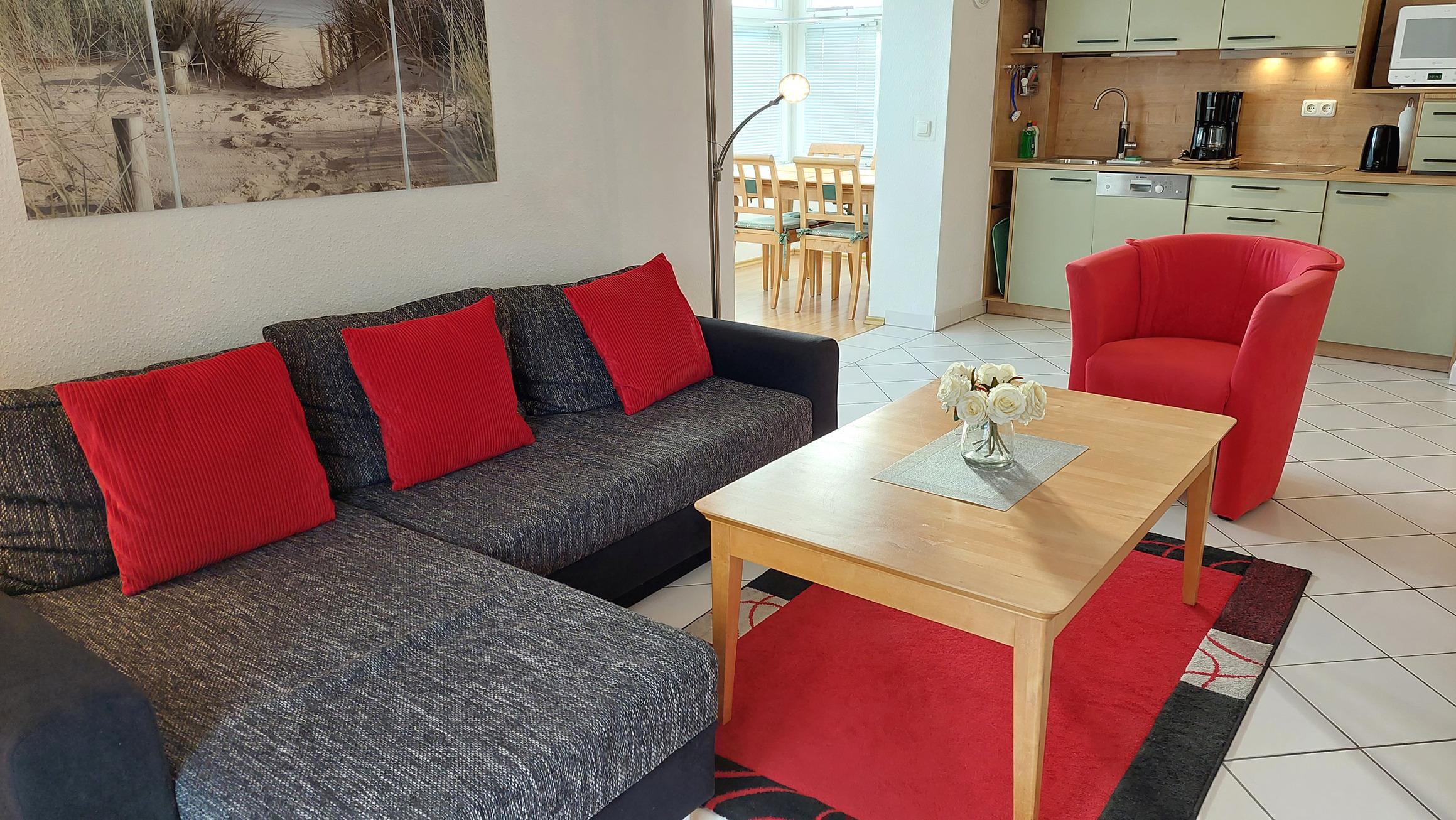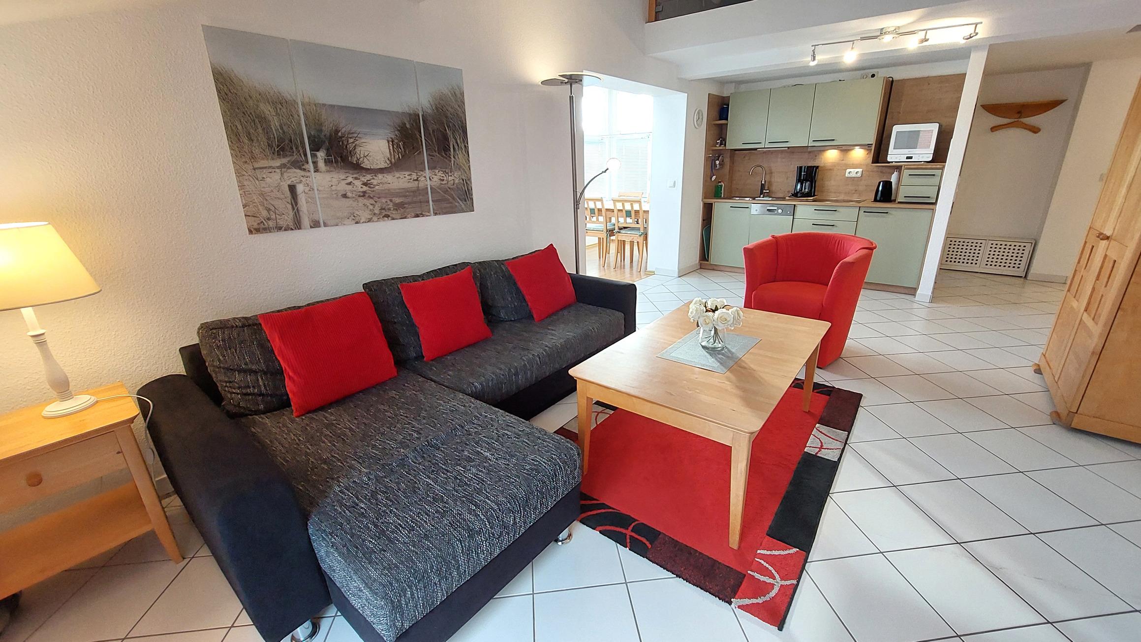 Der großzügige Wohnraum verfügt über eine Schlafcouch für die 3. und 4. Person, Flachbildfernseher, Musikanlage mit CD-, DVD-Player, kostenlosem WLAN-Zugang sowie eine voll ausgestattete Wohnküche. Die Küchenzeile ist mit Geschirrspüler, Kaffeemaschine, Wasserkocher, Toaster und Ceran-Kochfeld mit Dunstabzugshaube und diversen anderen Küchenhelfern komplett ausgestattet. befindet. Das separate Schlafzimmer verfügt über ein Doppelbett sowie einen Kleiderschrank. Das Badezimmer verfügt über ein Waschbecken, Dusche und WC. Ihr Vierbeiner ist hier Herzlich Willkommen!