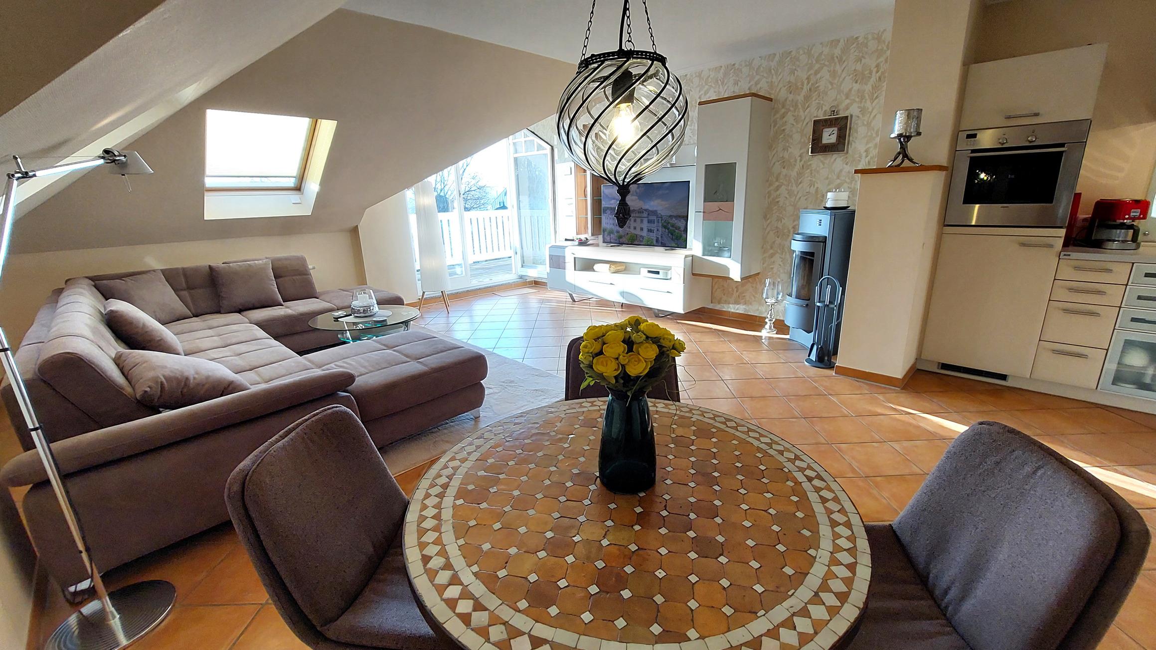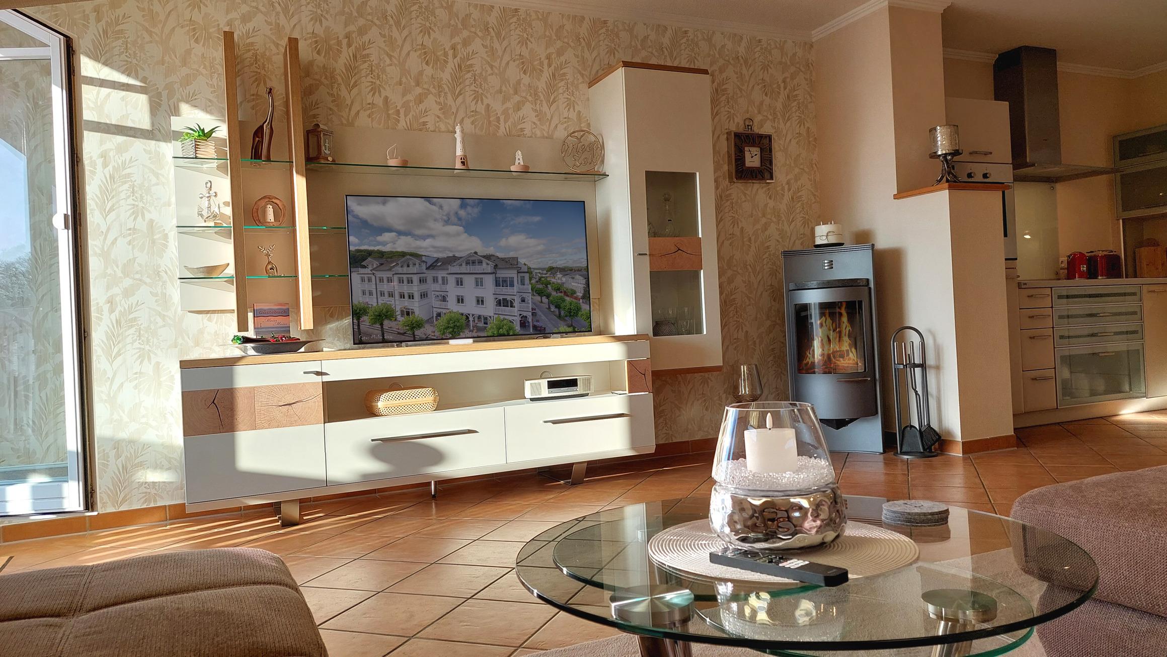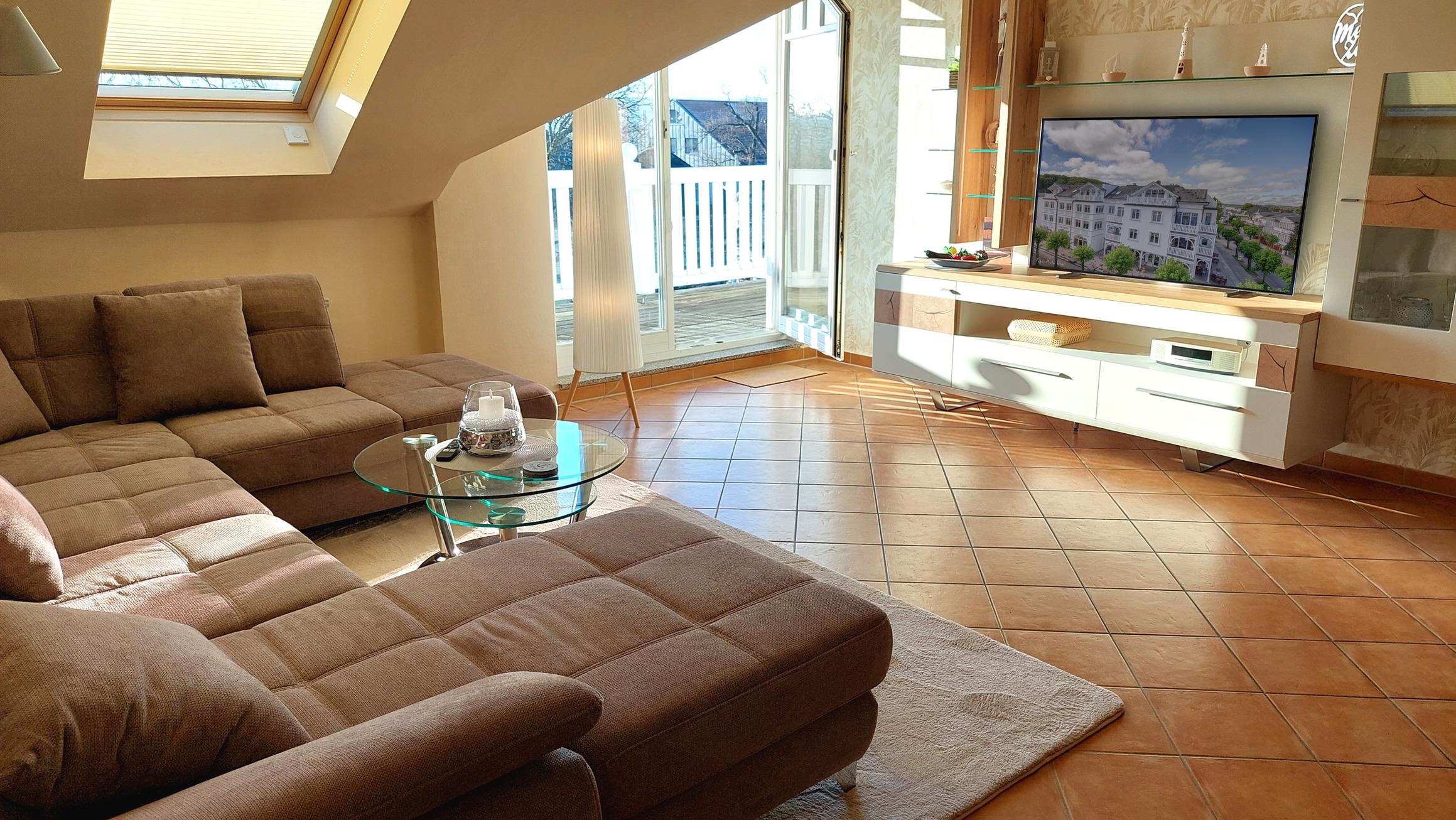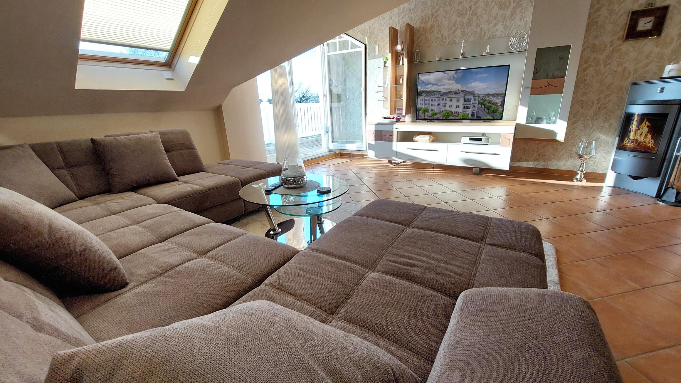 Ihre Ferienwohnung 21RB22 befindet sich im 3. Obergeschoss. Die großzügige 2-Raum-Wohnung hat eine Größe von ca. 64 qm und ist mit bis zu 3 Personen belegbar.[nbsp] Vom Südbalkon der Wohnung haben Sie einen schönen Blick über die Dächer von Binz bis auf den Schmachter See. Neben dem Wohnraum mit integrierter Markenküche (Alno) gibt es einen separaten Schlafraum, ein Badezimmer mit Waschtisch, sehr großer Dusche, WC und einen Abstellraum. Im Schlafraum befindet sich ein Doppelbett und ein Kleiderschrank. Im Wohnraum kann auf dem großen Schlafsofa eine weitere Person schlafen. Außerdem finden Sie im Wohnraum TV und Radio/CD-Spieler. An den etwas kühleren Tagen können Sie den Kaminofen für gemütliche Stunden anheizen. Die Küche ist mit Geschirrspülmaschine, Backofen, Herd, Kühlschrank und diversen Kleingeräten komplett ausgestattet. Alle unsere Gäste haben einen kostenfreien W-Lan Zugang in dieser Wohnung.