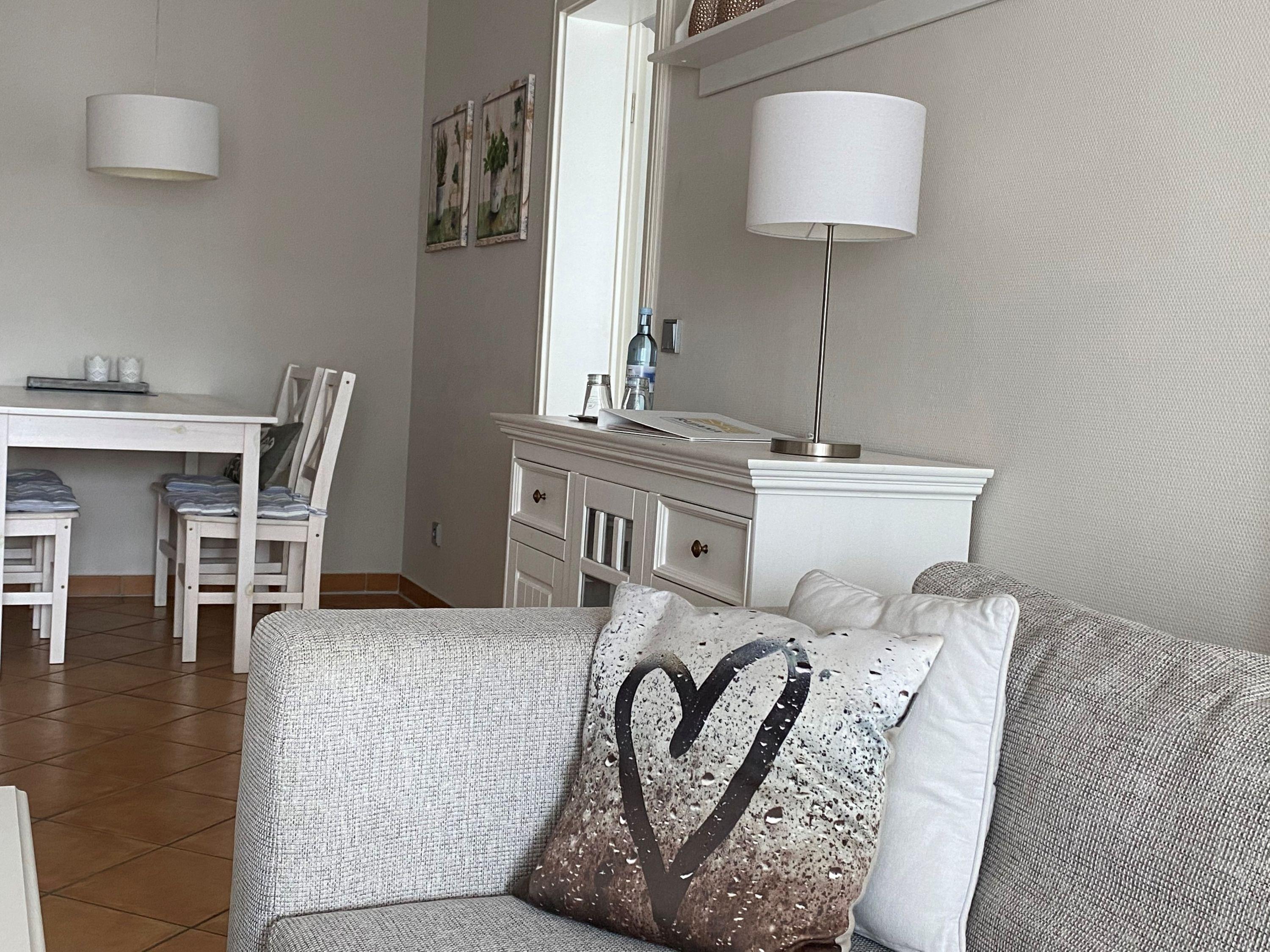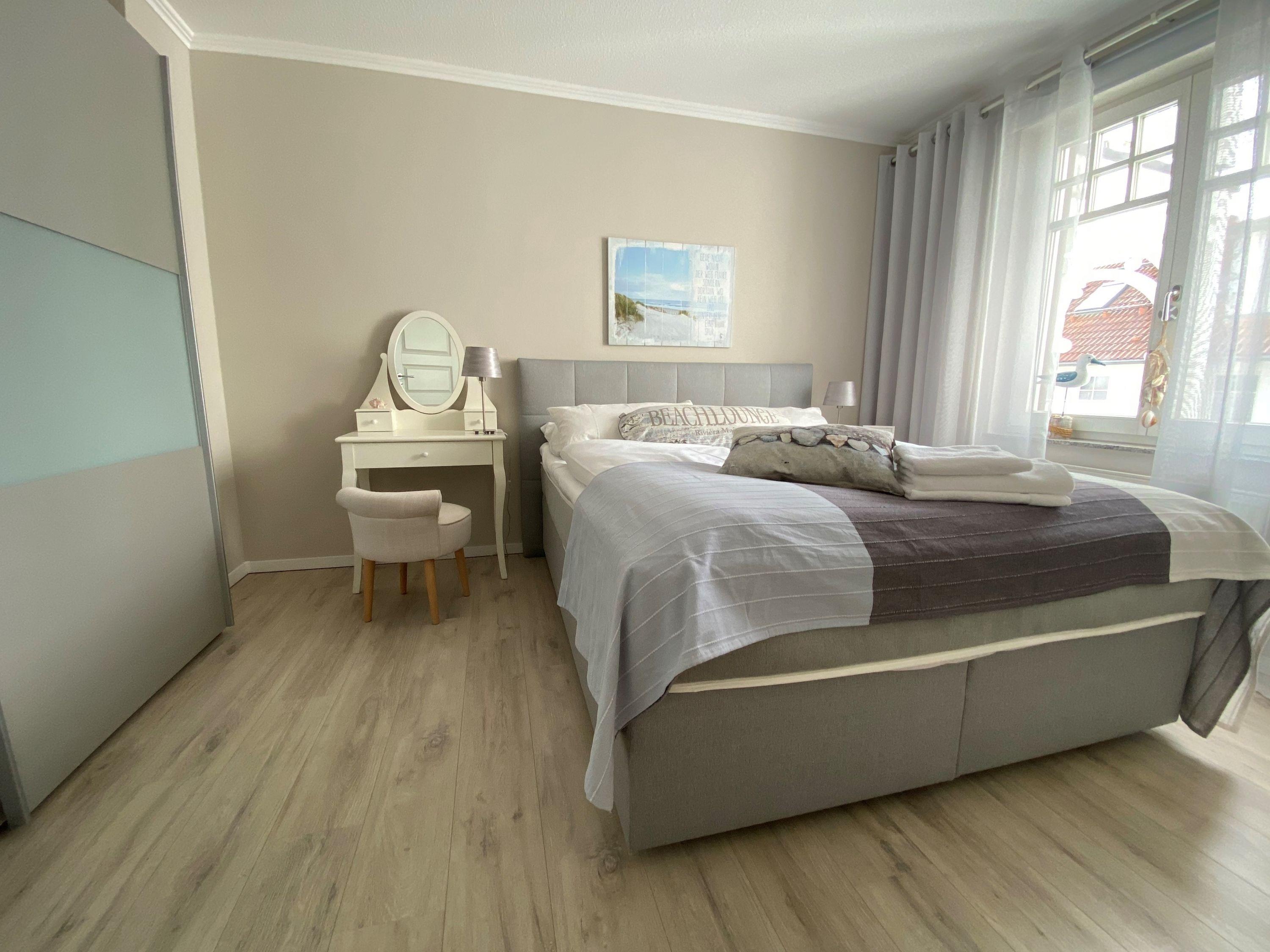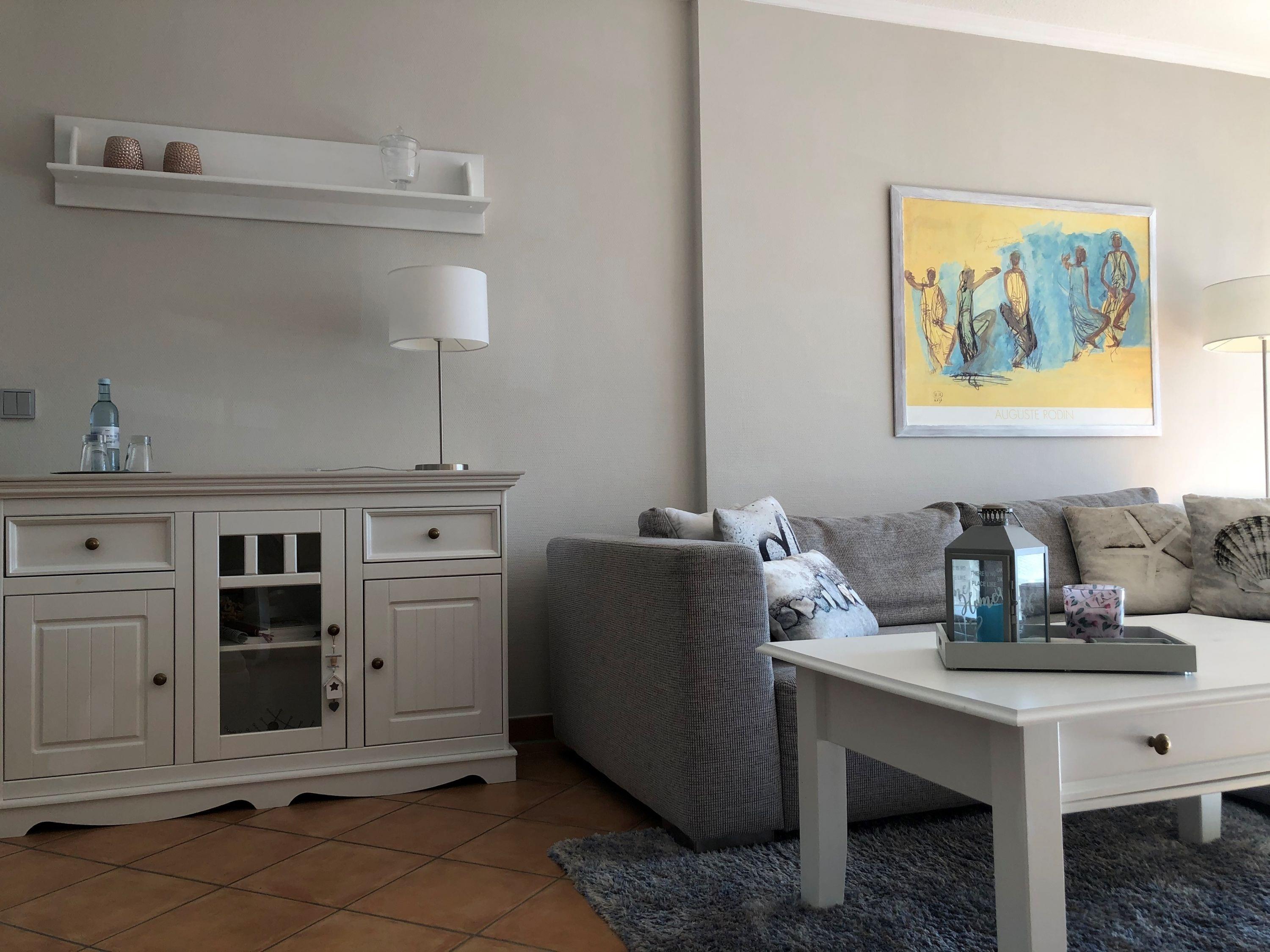 Die Wohnung wurde aufwendig saniert und hochwertig ausgestattet. Bei der Einrichtung wurde viel Wert auf natürliche Materialen und eine maritime Note in dezenten, natürlichen Farben gelegt. Der Wohnbereich ist mit weißen Massivholzmöbeln ausgestattet und verleiht dem Raum skandinavische Frische und maritime Leichtigkeit. Im Wohnraum befindet sich ein gemütlicher Essplatz sowie das zum Entspannen einladende Ecksofa, welches eine Schlaffunktion für die 3. und 4. Person bietet. Als Unterhaltungselektronik stehen ein Smart LED-Flachbildfernseher, DVD-Player und Radio/CD-Spieler zur Verfügung. Der Internetzugang ist über WLAN kostenfrei. Das moderne Bad verfügt über hochwertige Armaturen, Handtuchheizkörper, Dusche, WC sowie Waschtisch, Fön und Fußbodenheizung. Die in den Wohnbereich integrierte Küche ist modern mit einer Kühl-/Gefrierkombination, einem Backofen mit 4-Platten-Cerankochfeld, einer Geschirrspülmaschine, einer NESPRESSO-Kapselmaschine, Filterkaffeemaschine, Wasserkocher, Toaster, einem hochwertigen Messerset sowie diversen Kleingeräten ausgestattet. Das Schlafzimmer bietet, neben einem rückenfreundlichen Boxspringbett (H3) mit bequemen Einstieg (65 cm Höhe), höchsten Schlafkomfort, einen geräumigen Kleiderschrank sowie eine Frisierkommode im skandinavischen Stil. Ein Hochstuhl steht Ihnen zur Verfügung und bei Bedarf kann auch ein Babyreisebett gestellt werden.