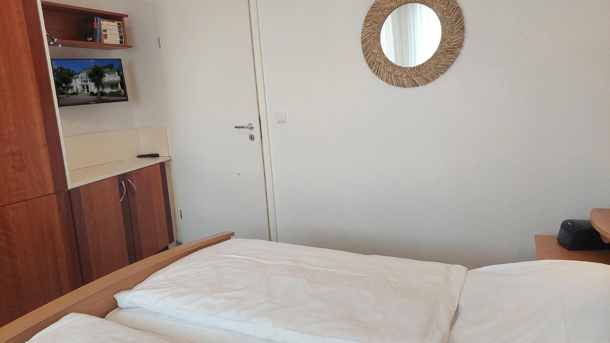 Das Schlafzimmer verfügt über ein Doppelbett, einen TV und einem großen Kleiderschrank mit viel Stauraum.
