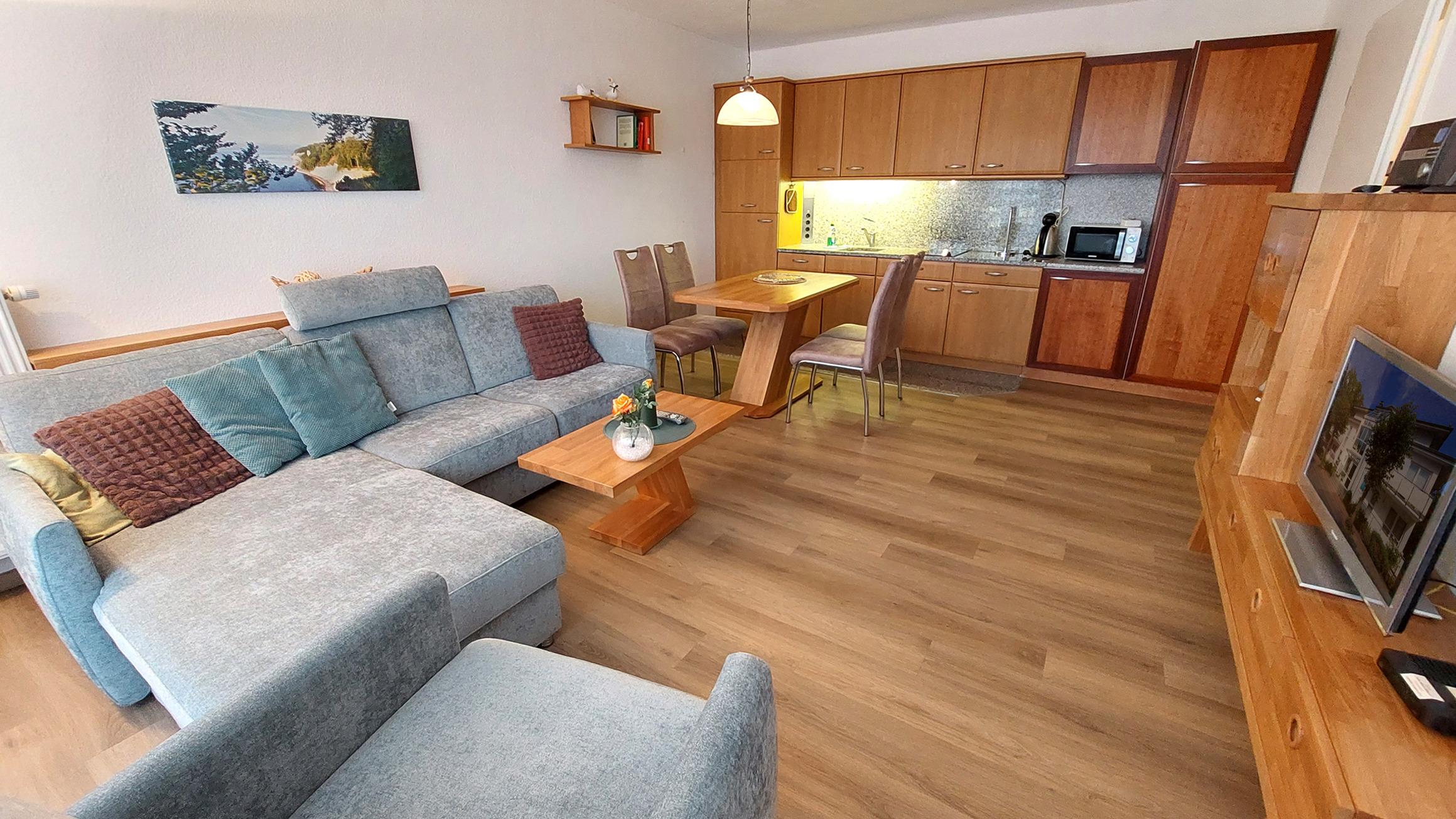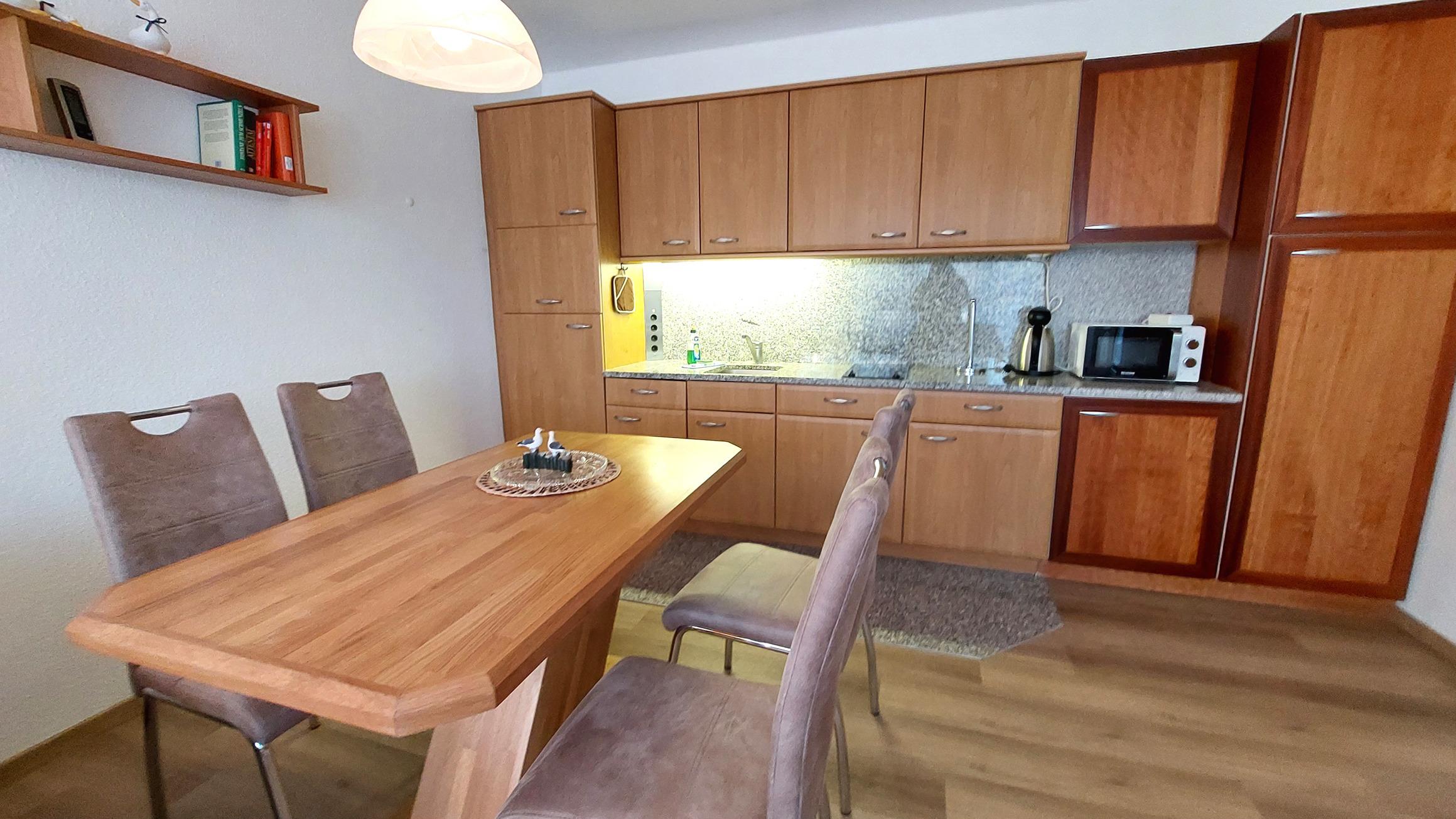 Im Wohnzimmer gibt einen separaten Essbereich und eine gut ausgestattete Küchenzeile. Diese verfügt unter anderem über einen 2-Platten-Ceran-Kochfeld, Kühlschrank mit Gefrierfach, Geschirrspüler, Mikrowelle und einem kleinen mobilen Backofen.