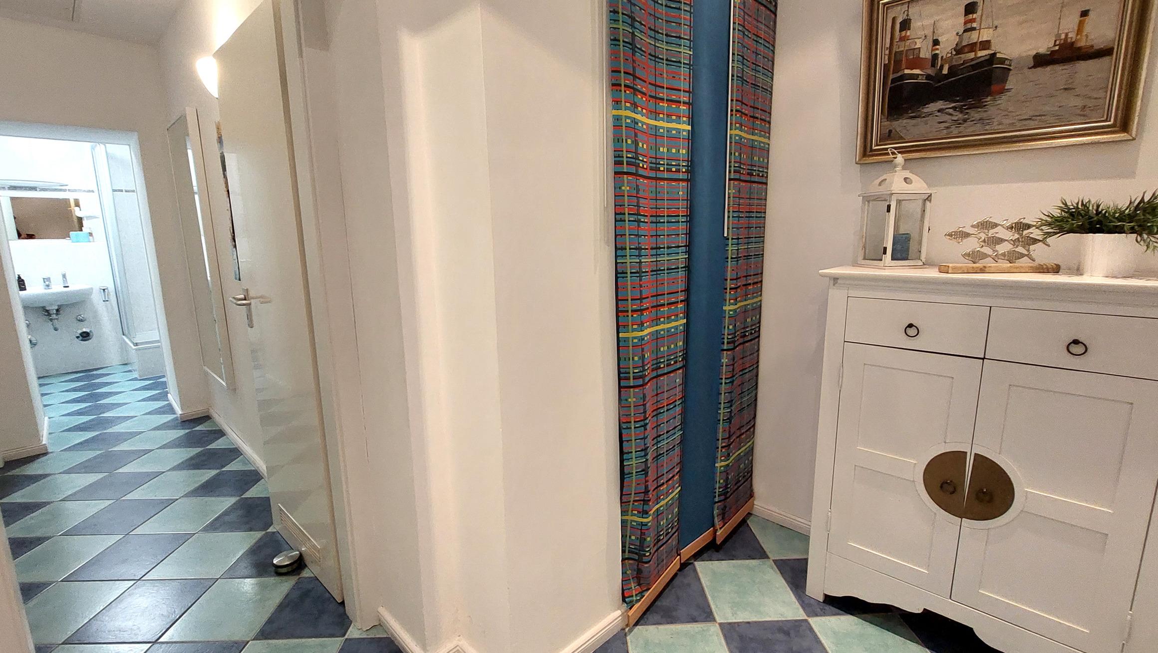 Auf diesem Flur bietet ein kleiner Abstellraum sowie einen großer Einbaukleiderschrank viel Stauraum.