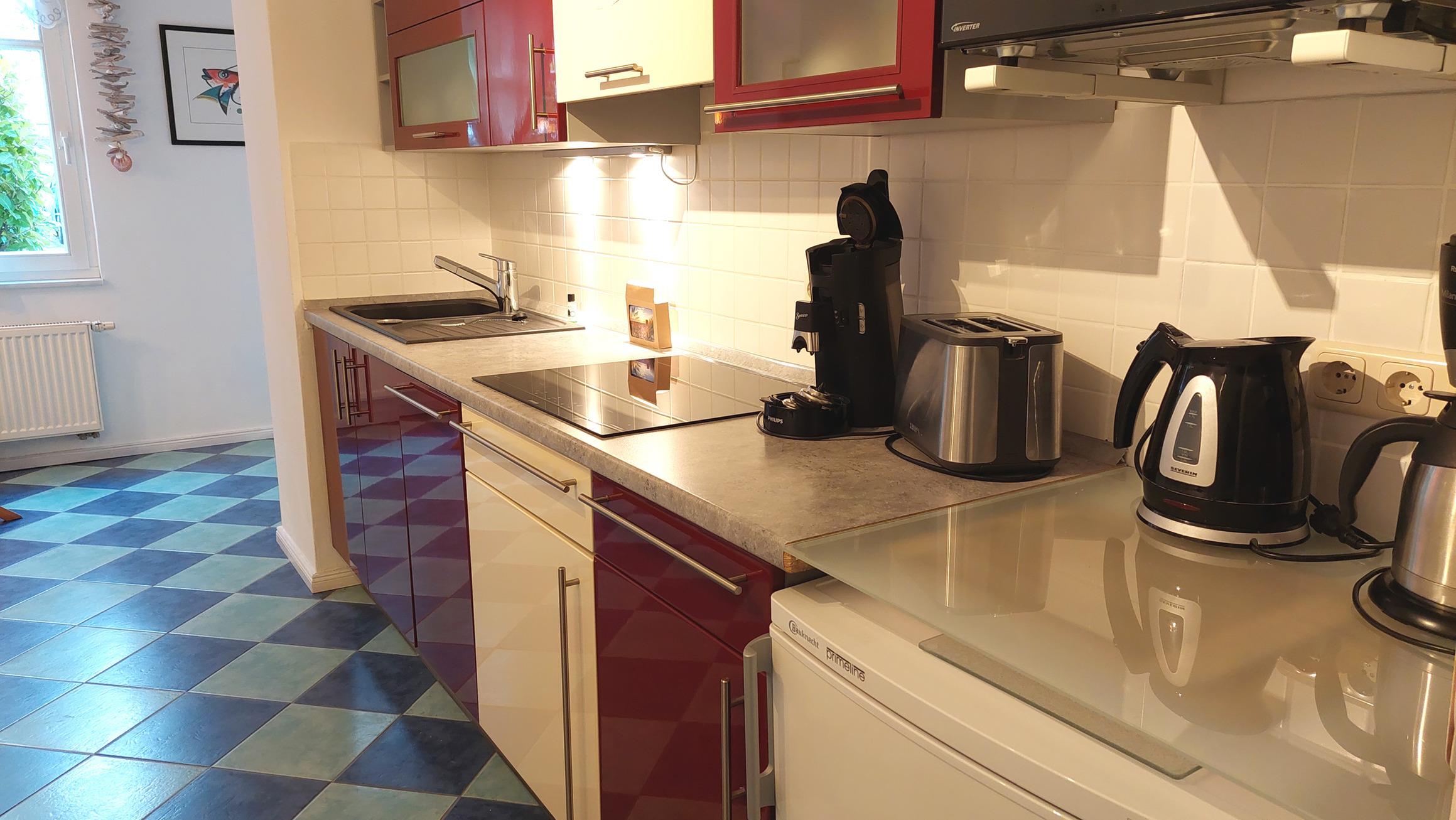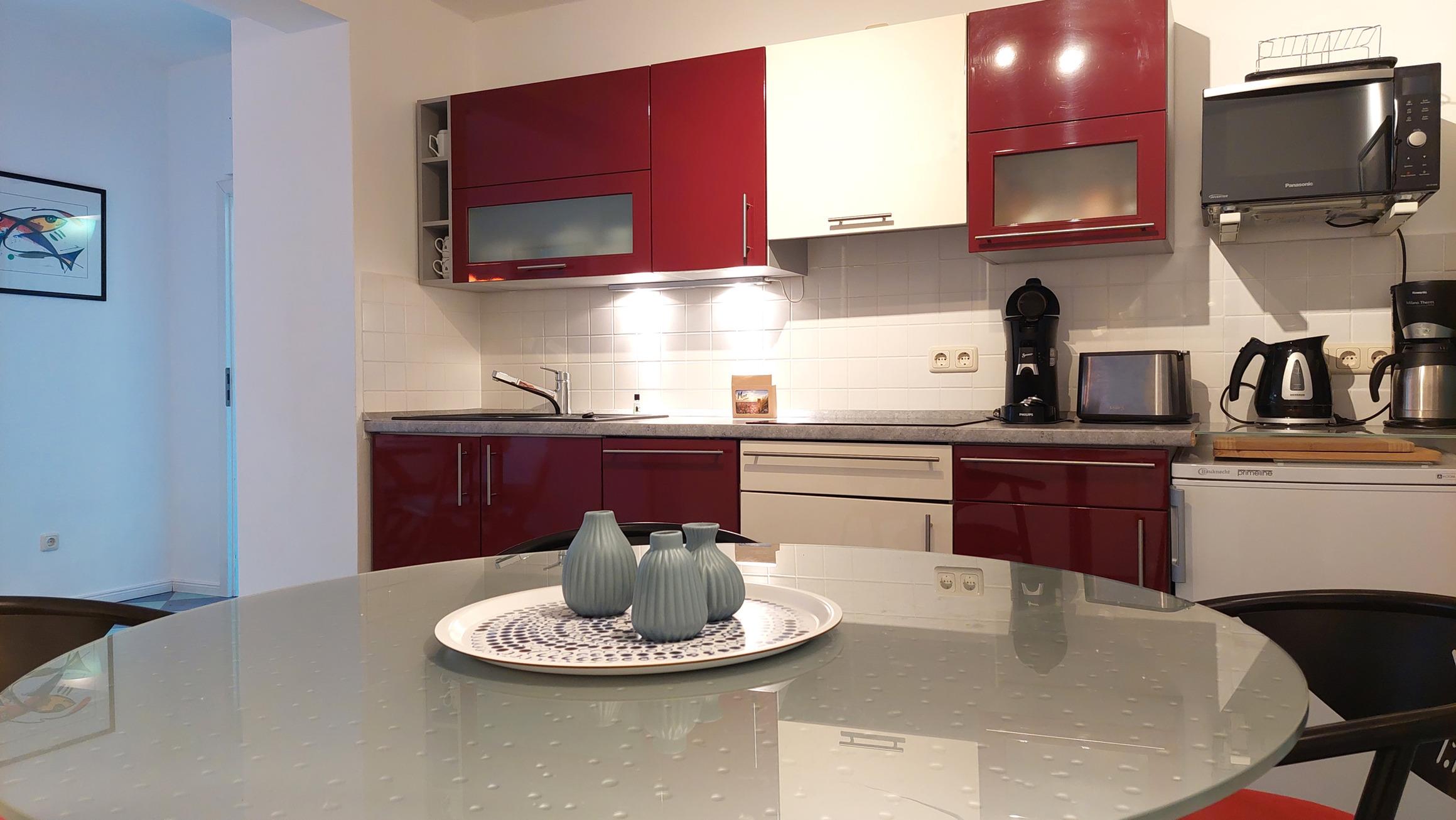 Die moderne Küchenzeile mit Induktions-Ceranfeld, Kühlschrank (samt Gefrierfach), Mikrowelle und Geschirrspüler bietet die Möglichkeit sich auch im Urlaub selbst zu verpflegen.