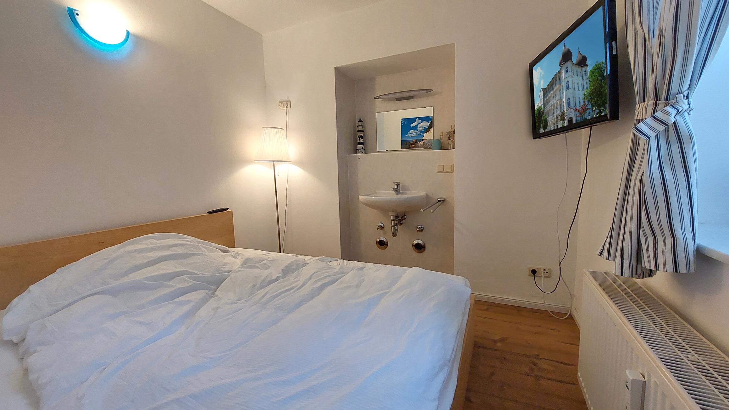 Das zusätzliche Schlafzimmer verfügt über ein französisches Bett, einen Flachbild-TV sowie über ein praktisches Waschbecken samt Spiegel.